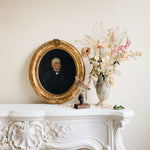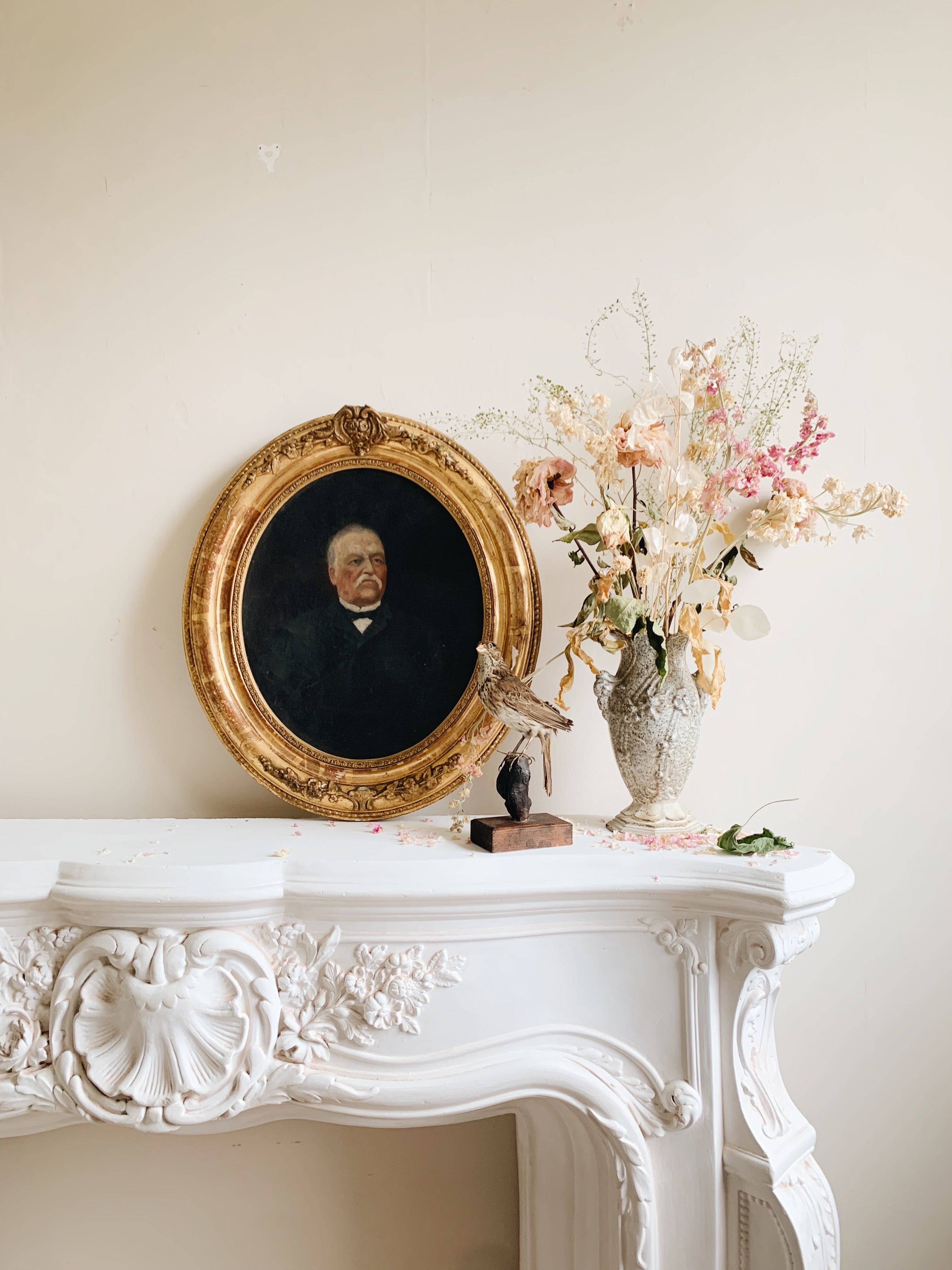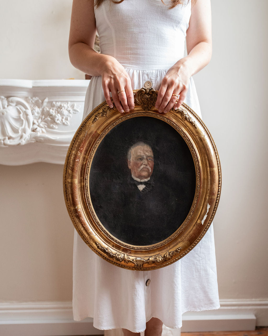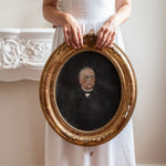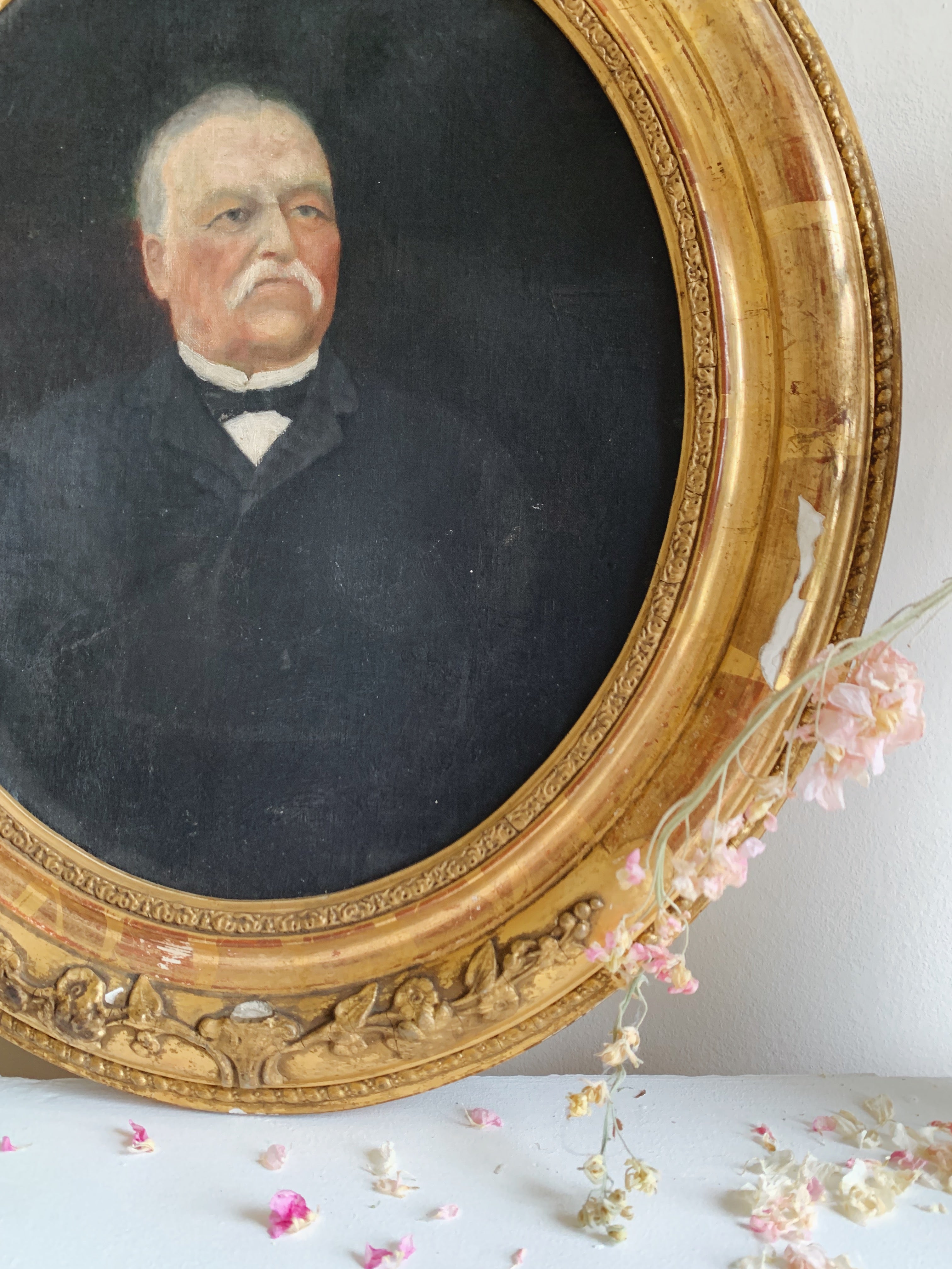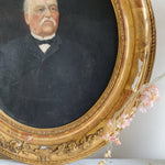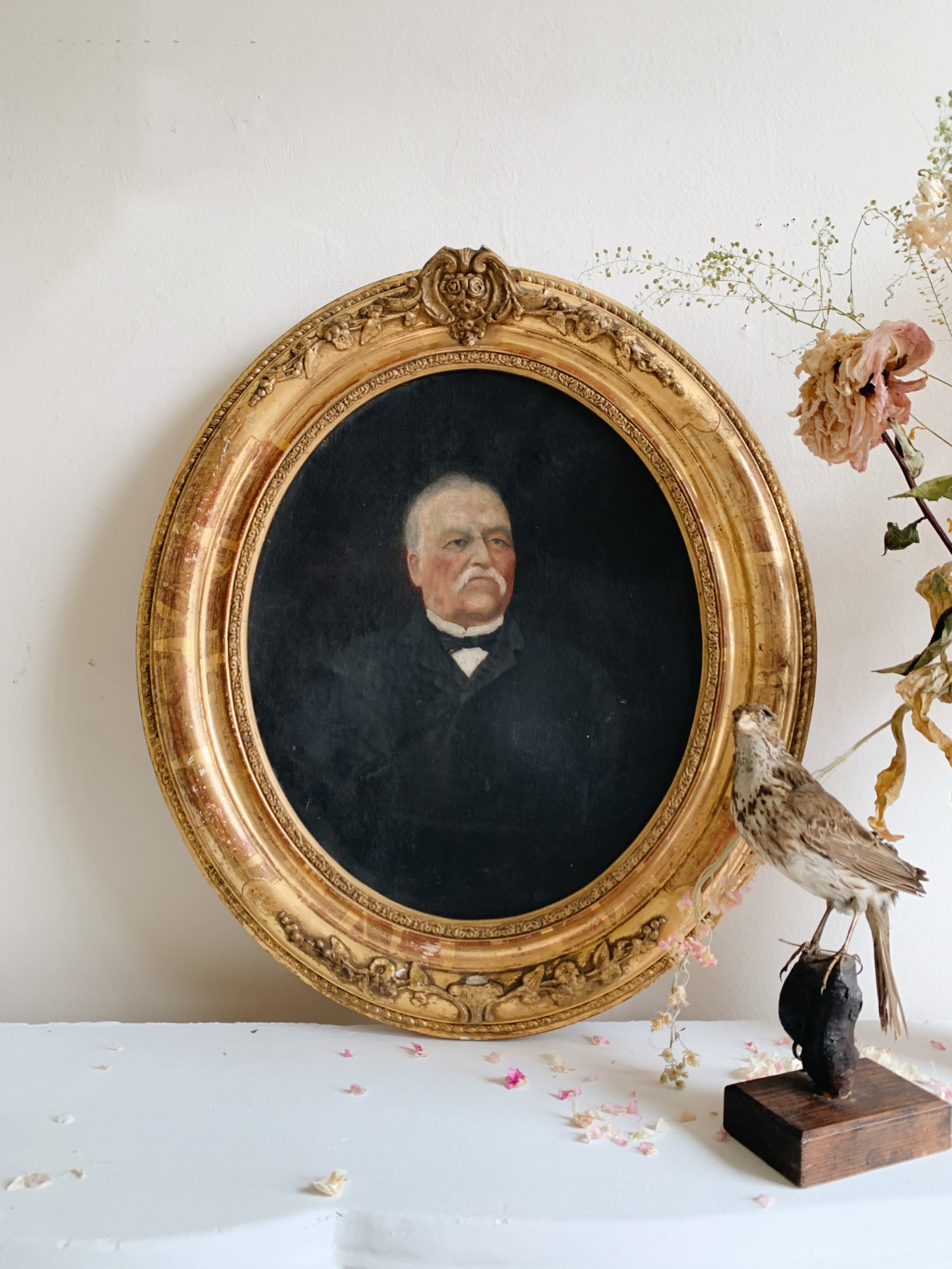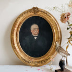 An enchanting 19th century oil painting of a gentleman in an impressive carved gilt wood frame with decorative detailing to the top and bottom. The piece wears its age with pride with some beautiful distressed detailing, which I think only adds to the charm of the piece, displaying an air of faded splendor from a bygone era.