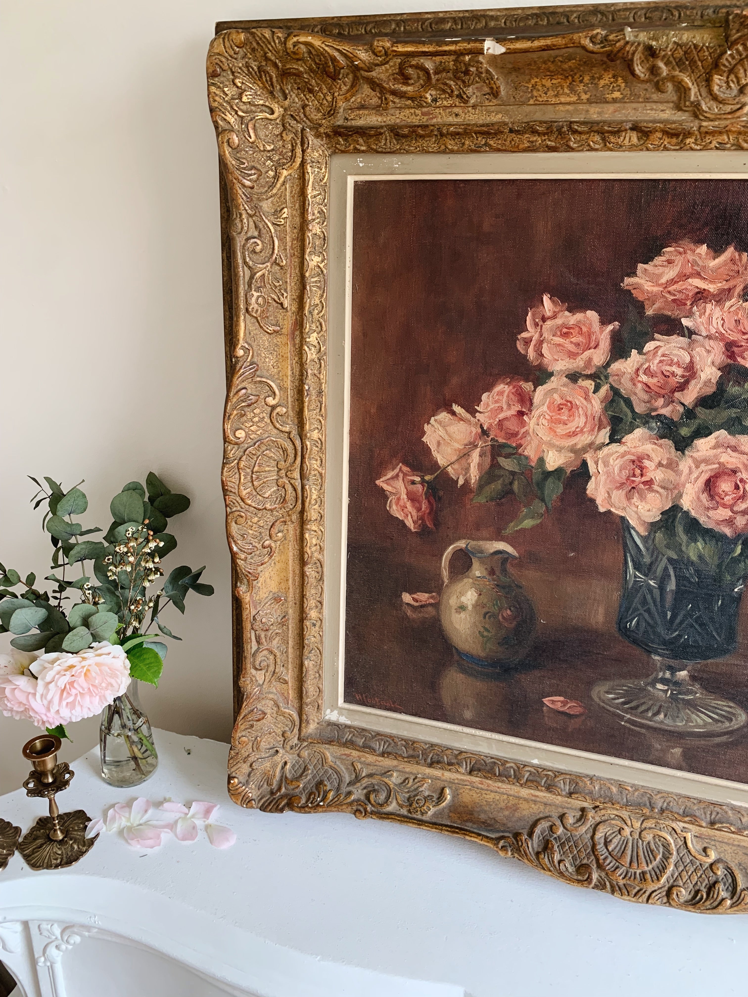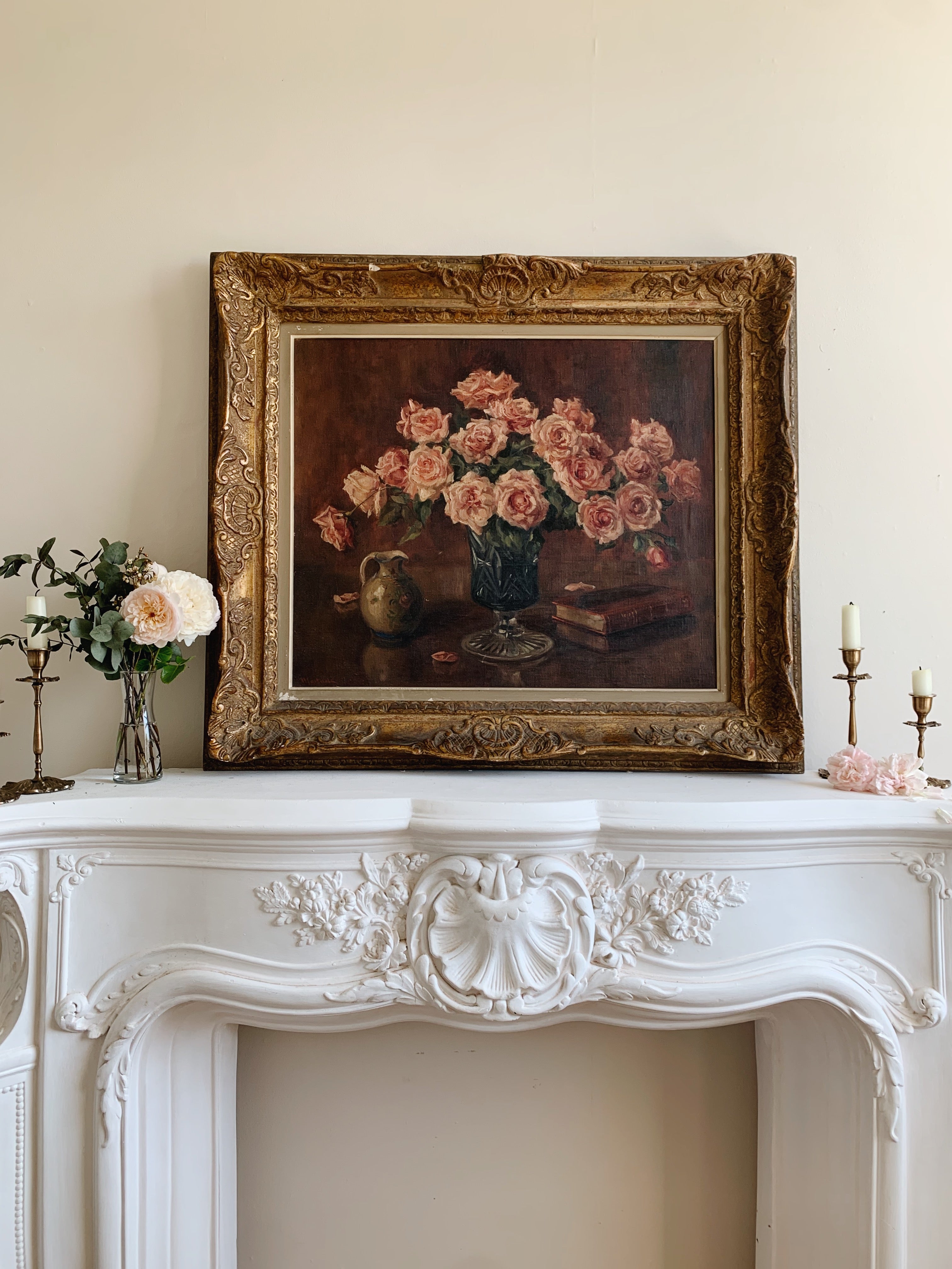 The painting sits in it's original gilt wood frame, with ornate shell detailing to the design. It has a wonderful patina of aged elegance.