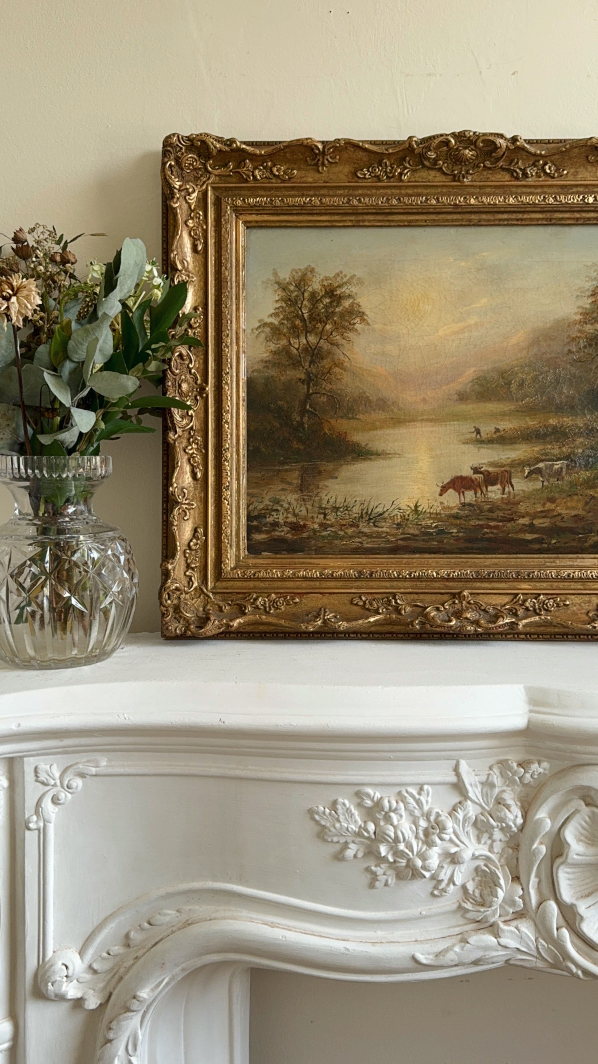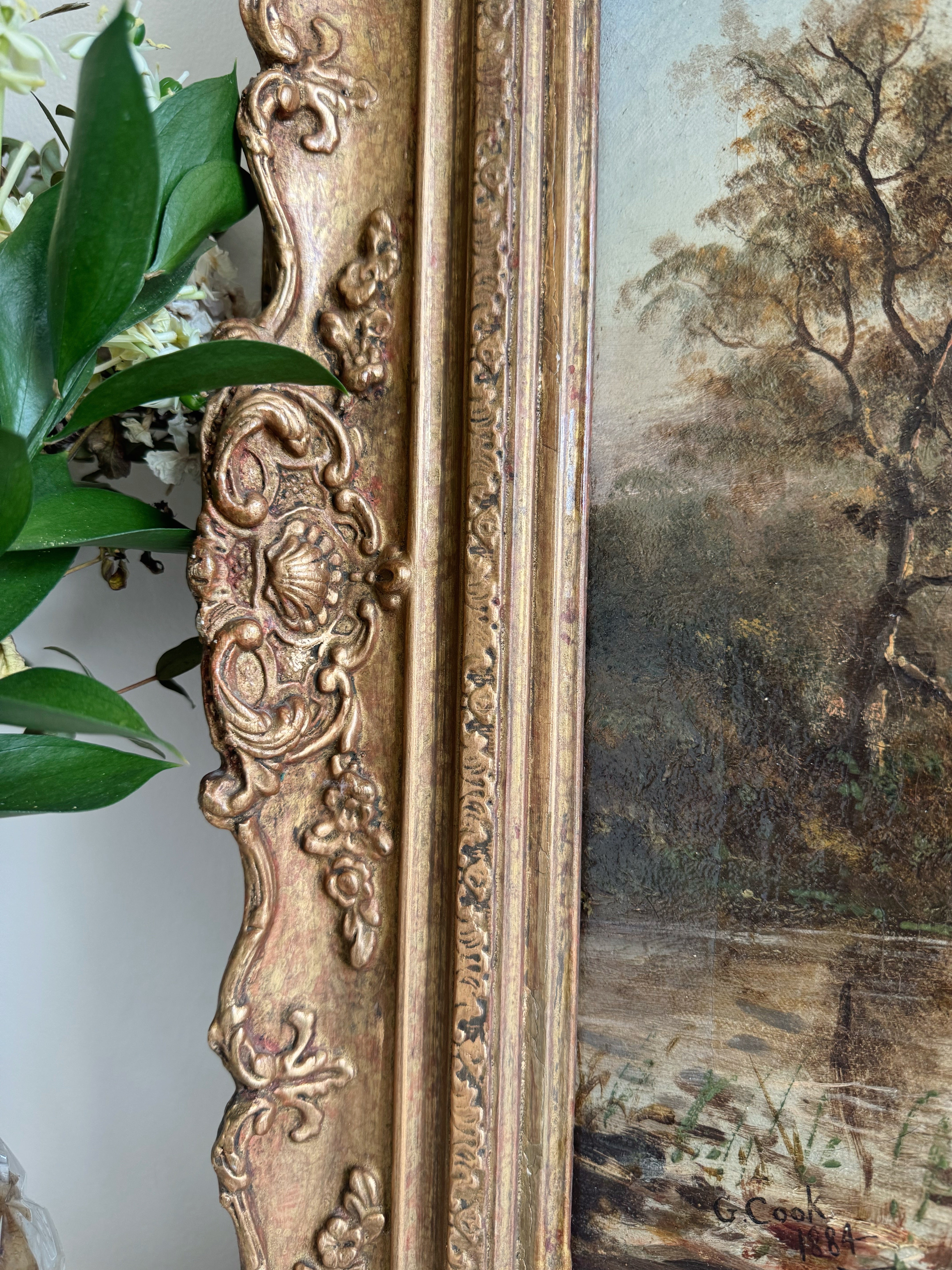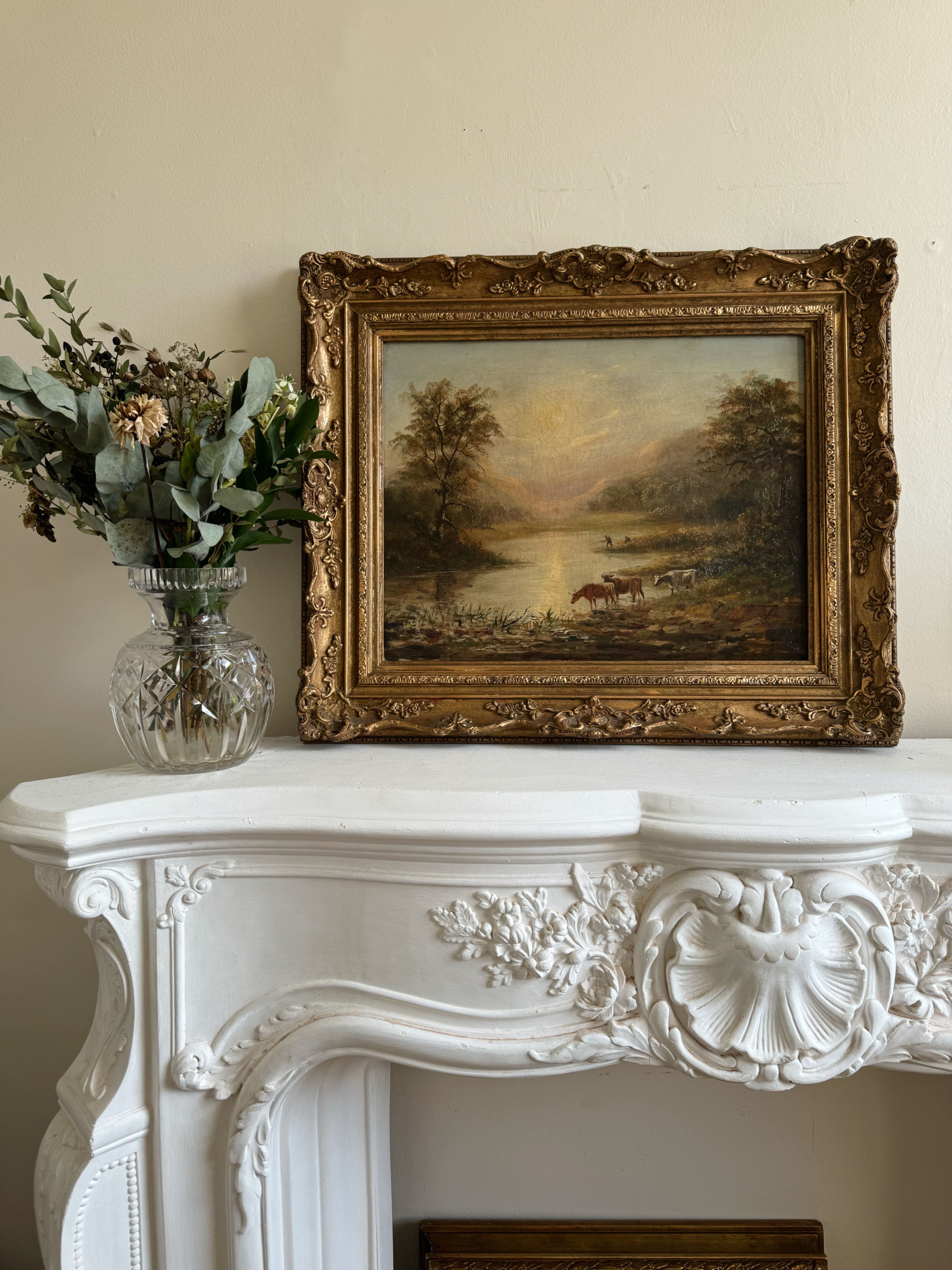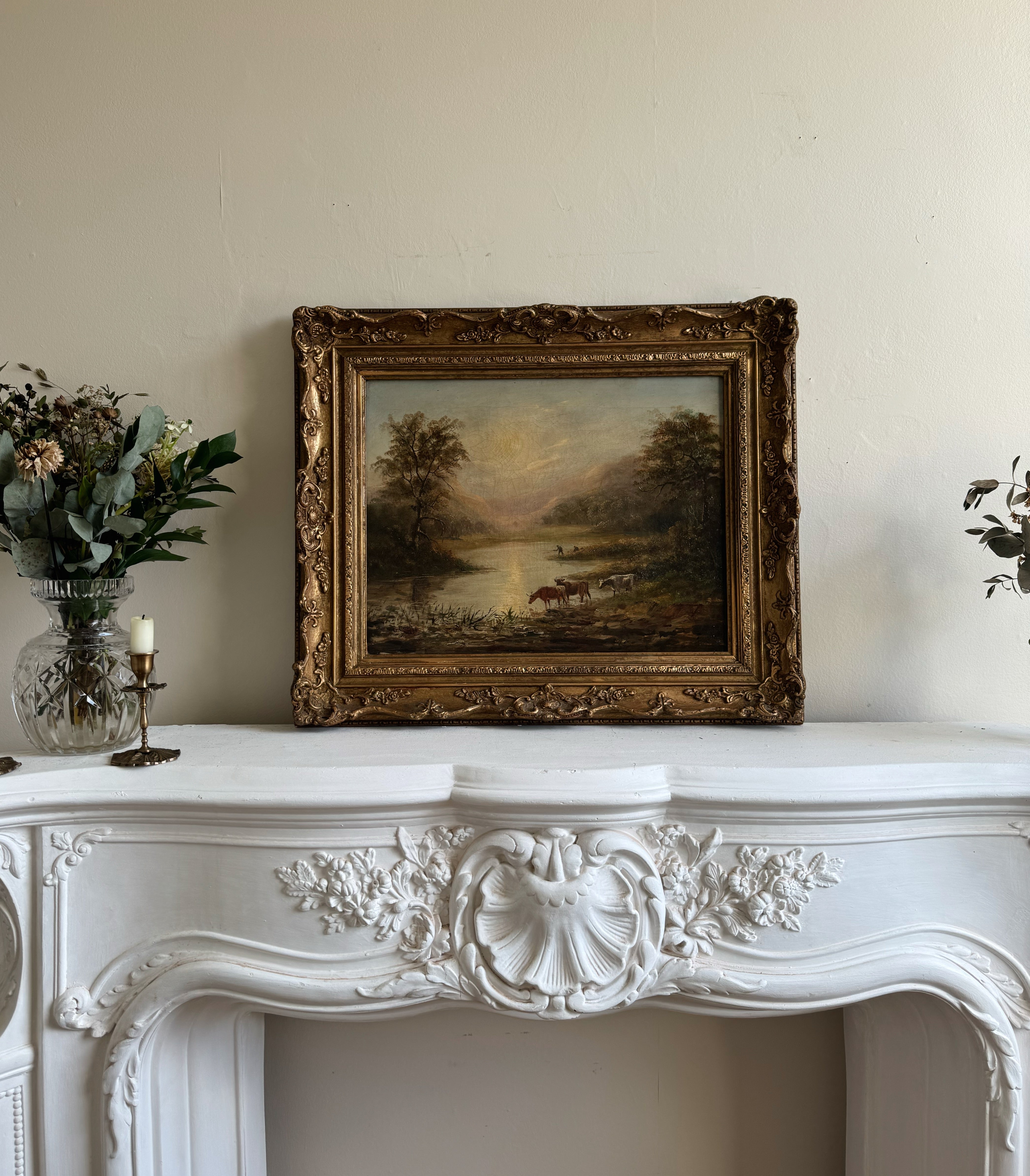 This high quality antique piece is in outstanding condition and has been painted by a high caliber artist. The tones and colours are enchanting and the scene almost glows. The painting sits in a beautiful gilt frame with distinguished ornate detailing with shell motifs, again in superb condition.