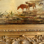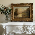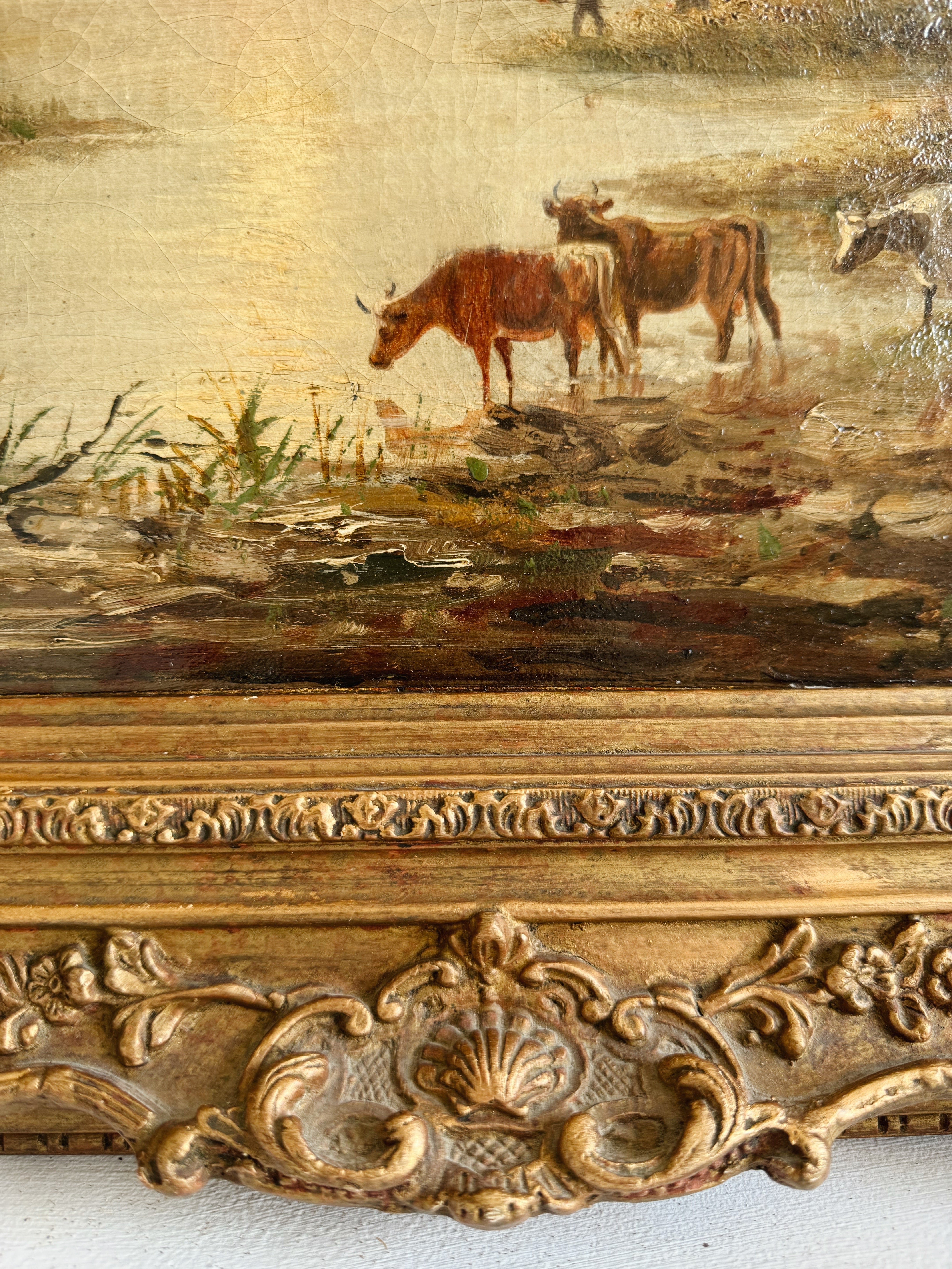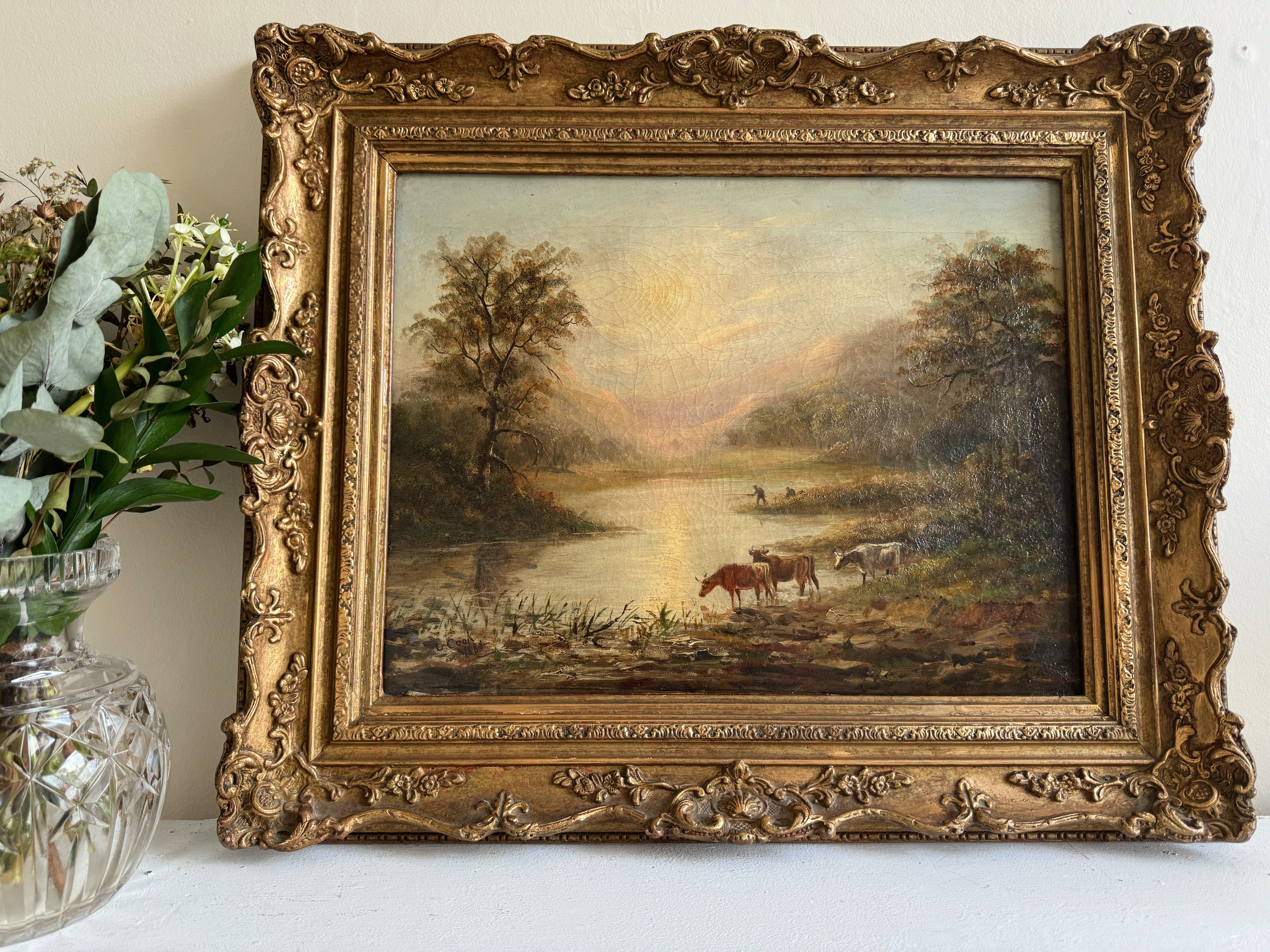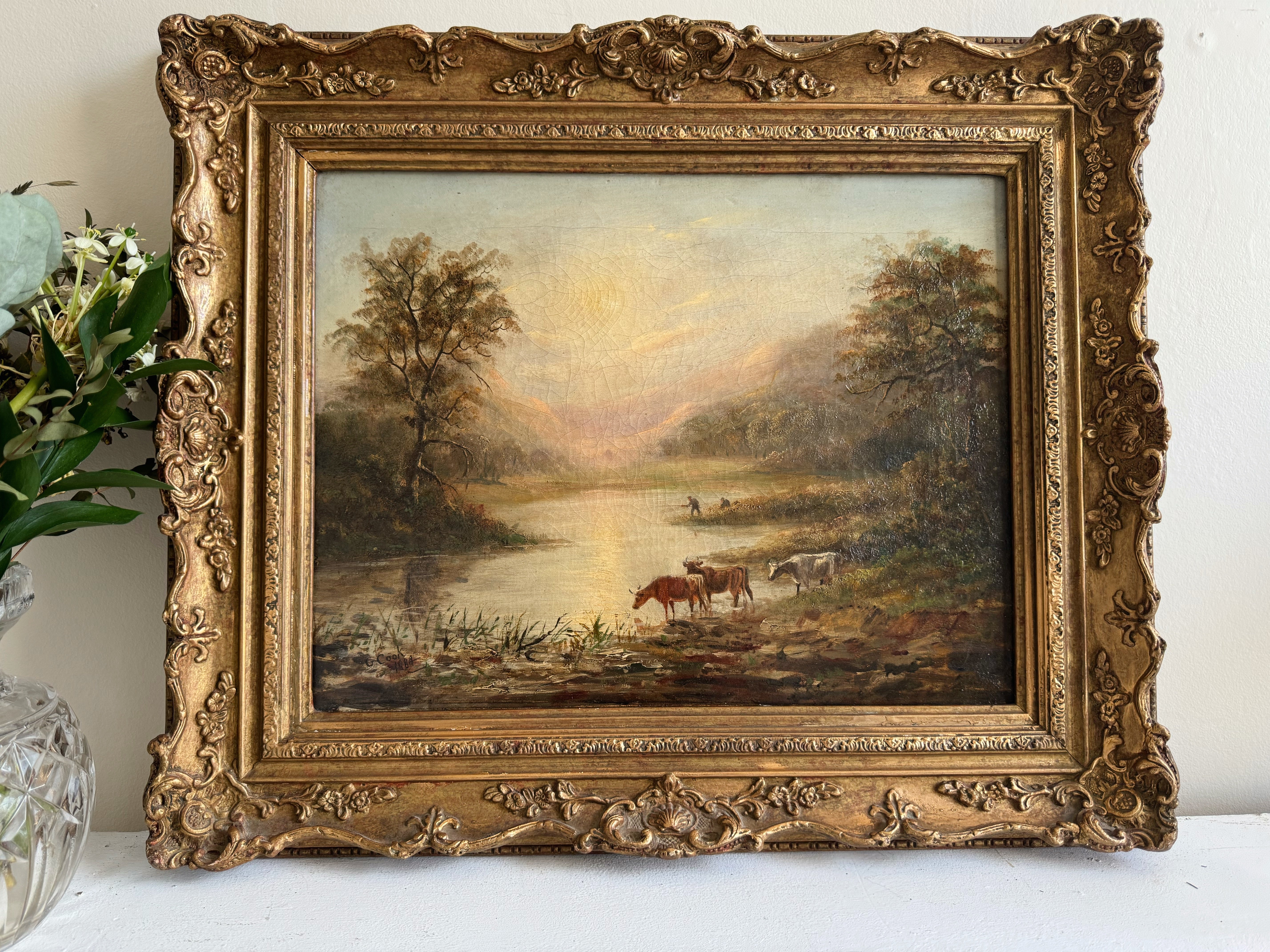 This high quality antique piece is in outstanding condition and has been painted by a high caliber artist. The tones and colours are enchanting and the scene almost glows. The painting sits in a beautiful gilt frame with distinguished ornate detailing with shell motifs, again in superb condition.