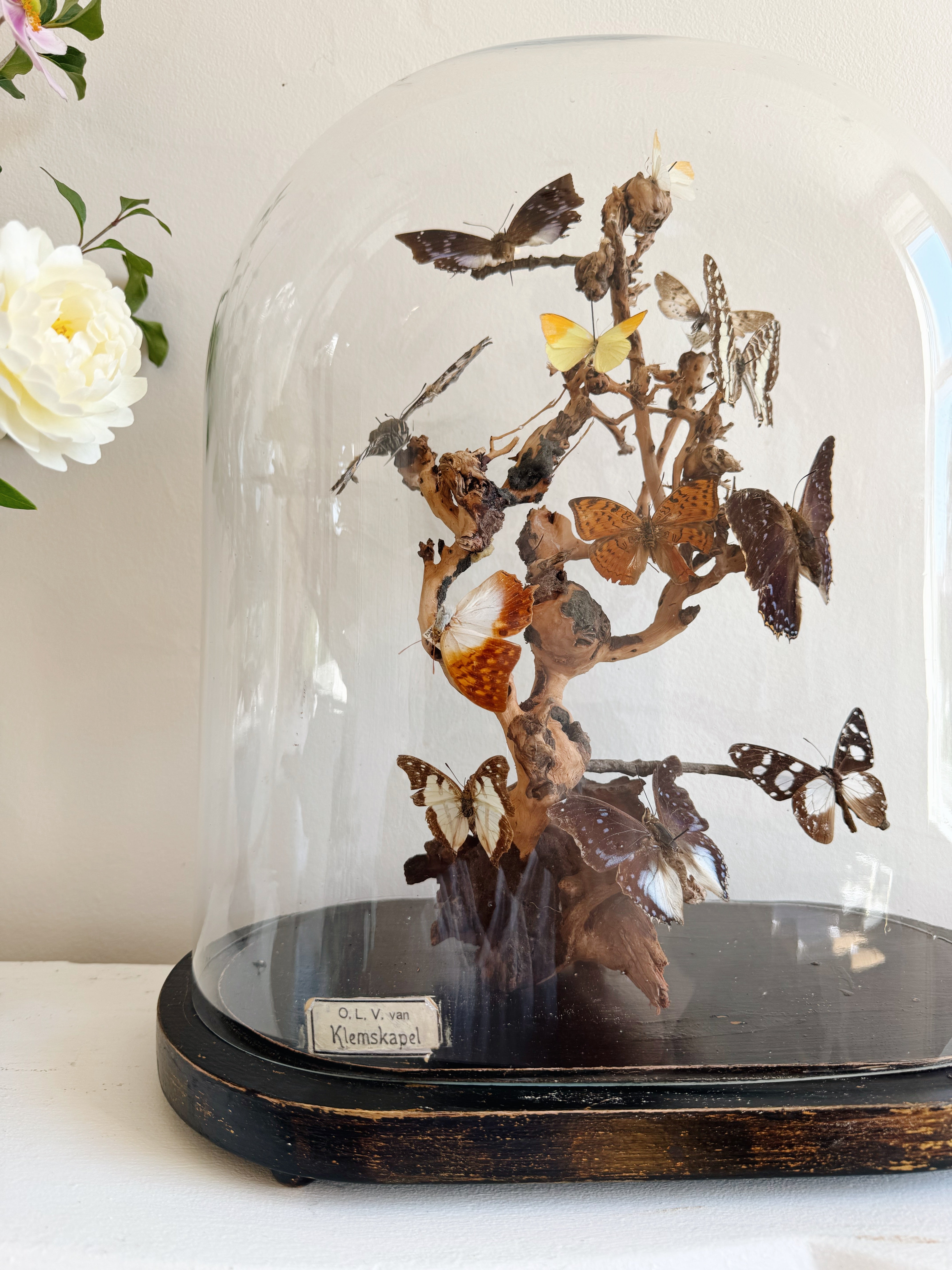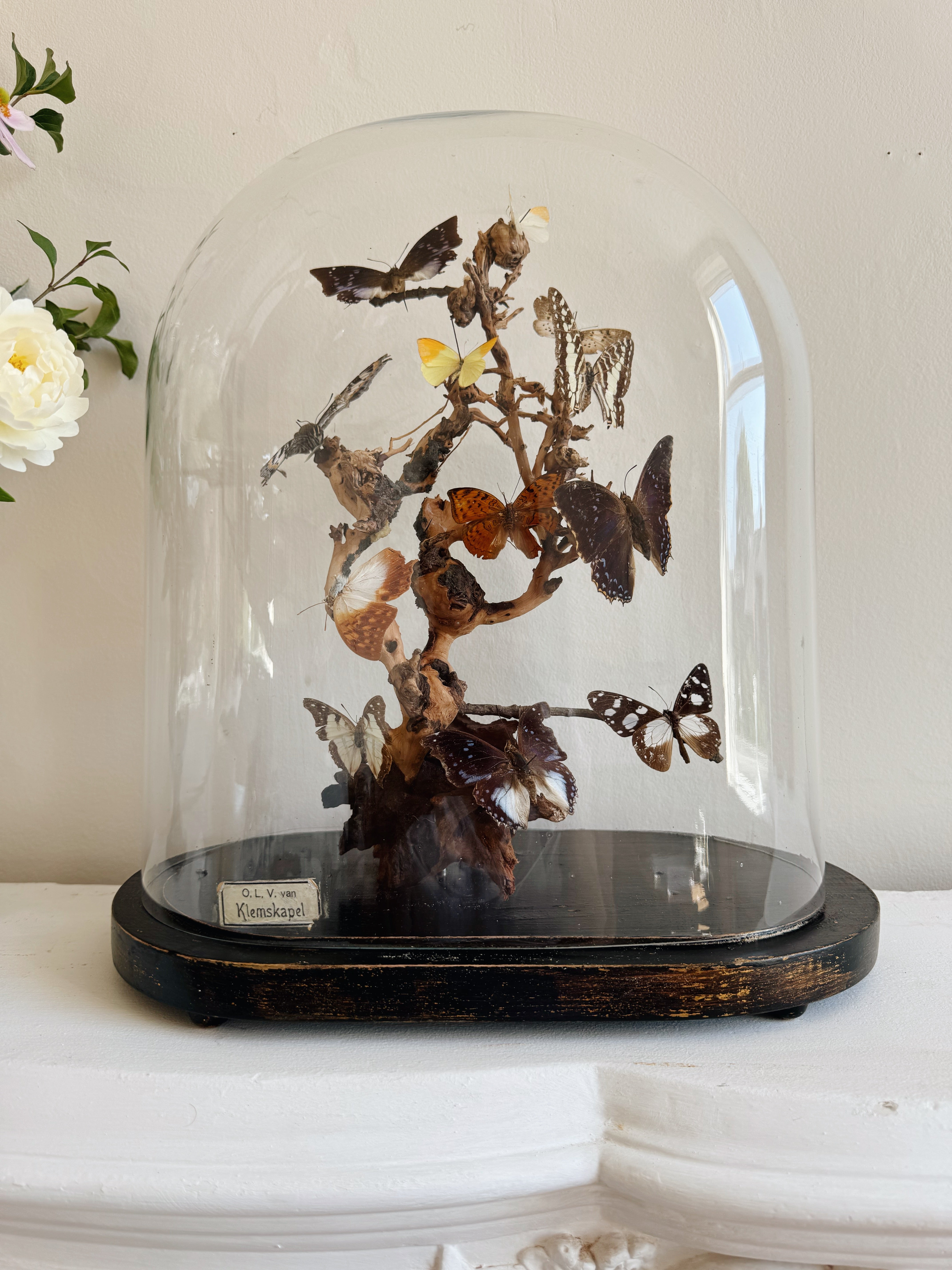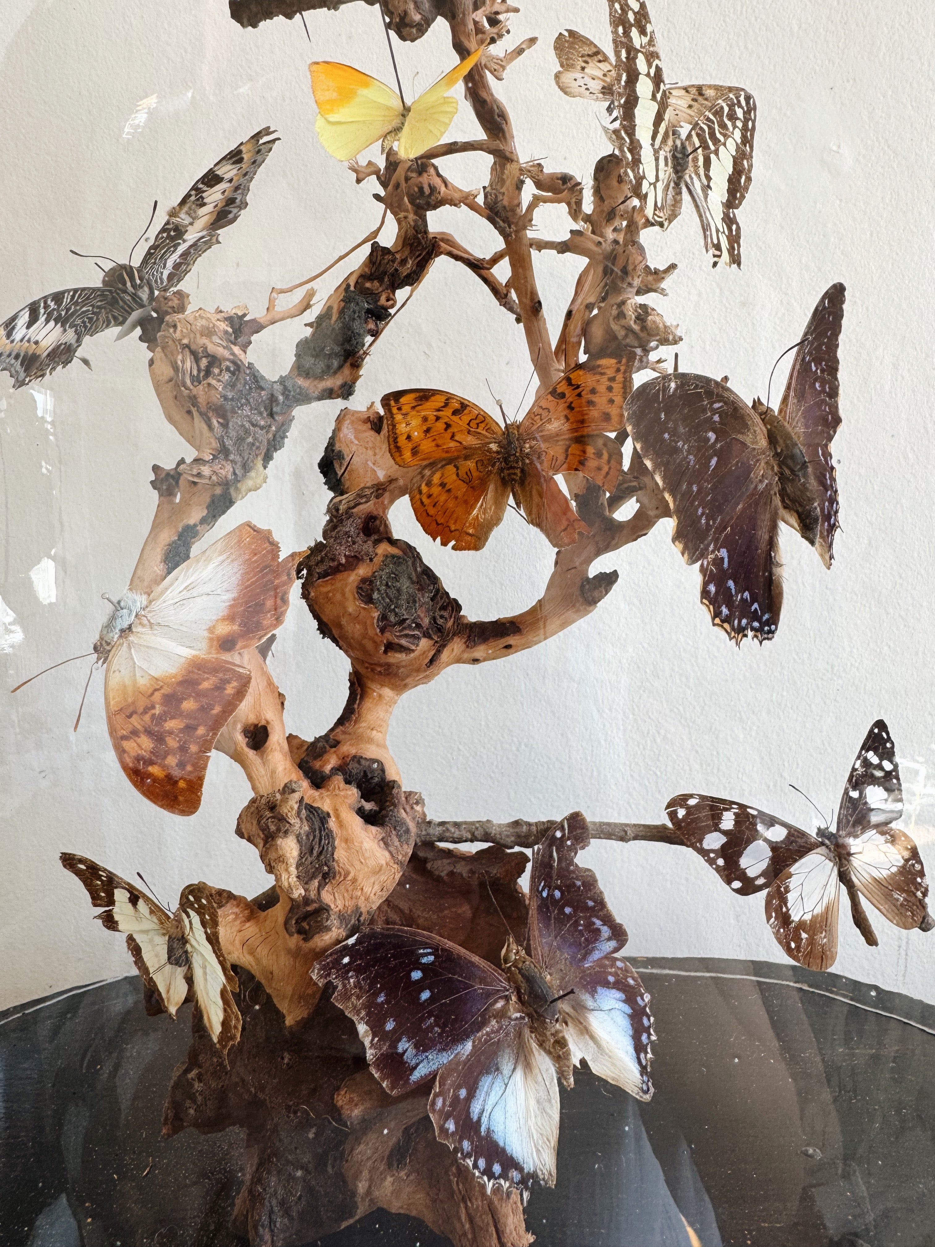 A rare antique butterfly display, housed beneath its original glass dome and mounted on an ebonised wooden base. The arrangement features an array of vividly preserved butterflies in tones of ochre, cream, yellow, and deep indigo, delicately pinned to branches of natural wood to create a sense of movement and flight. Some of the butterfies still bear there hand written specimen label.