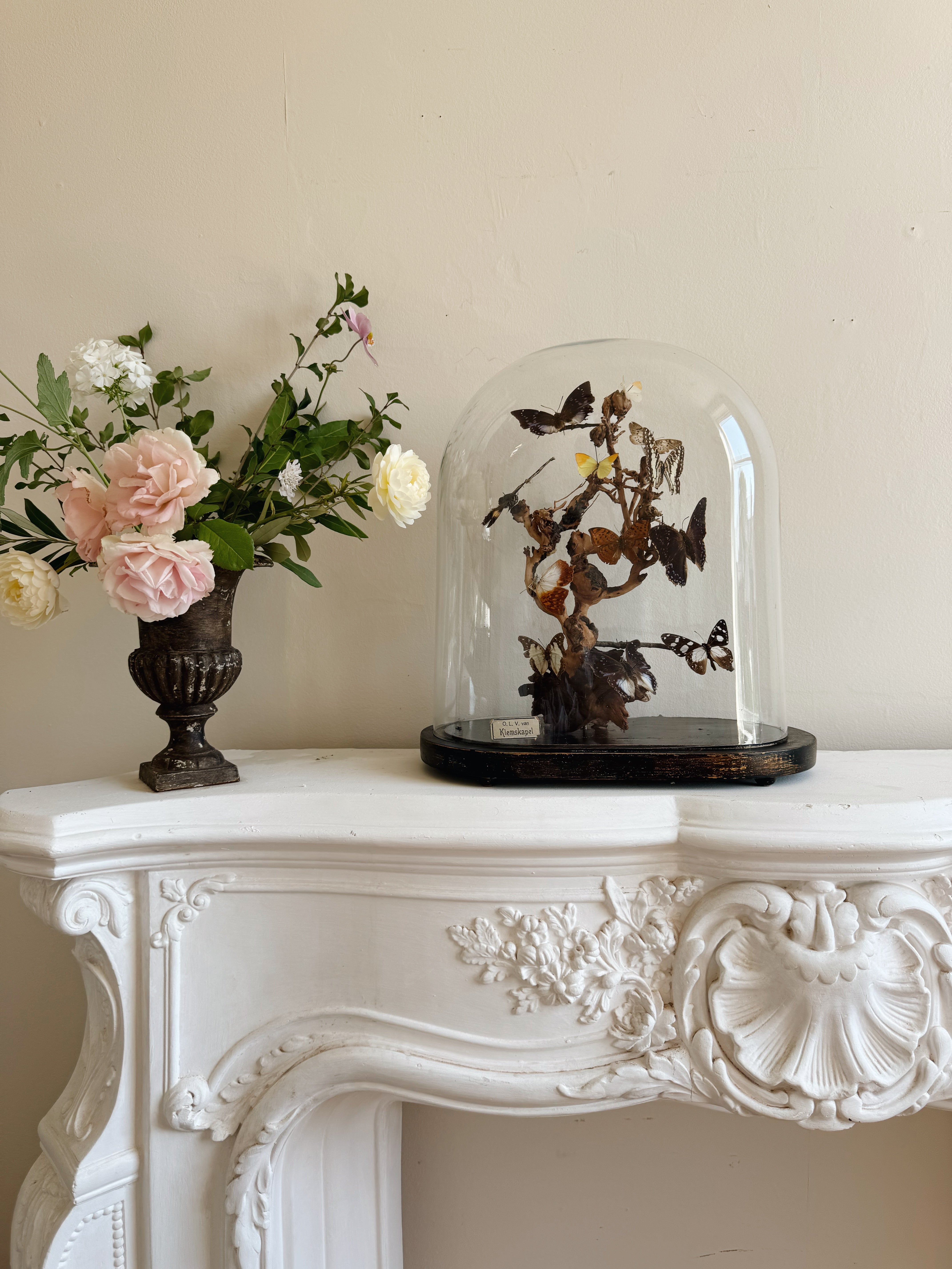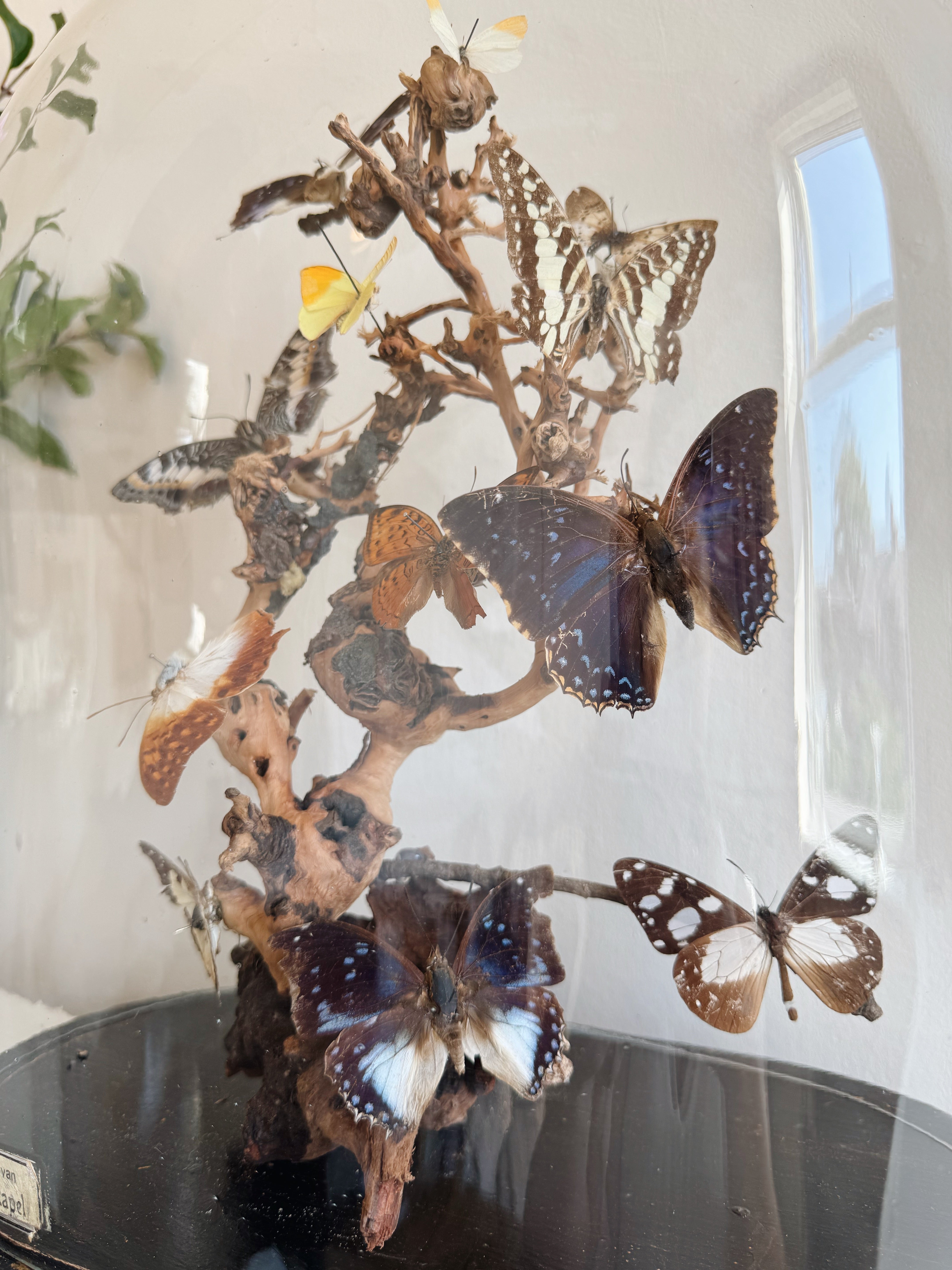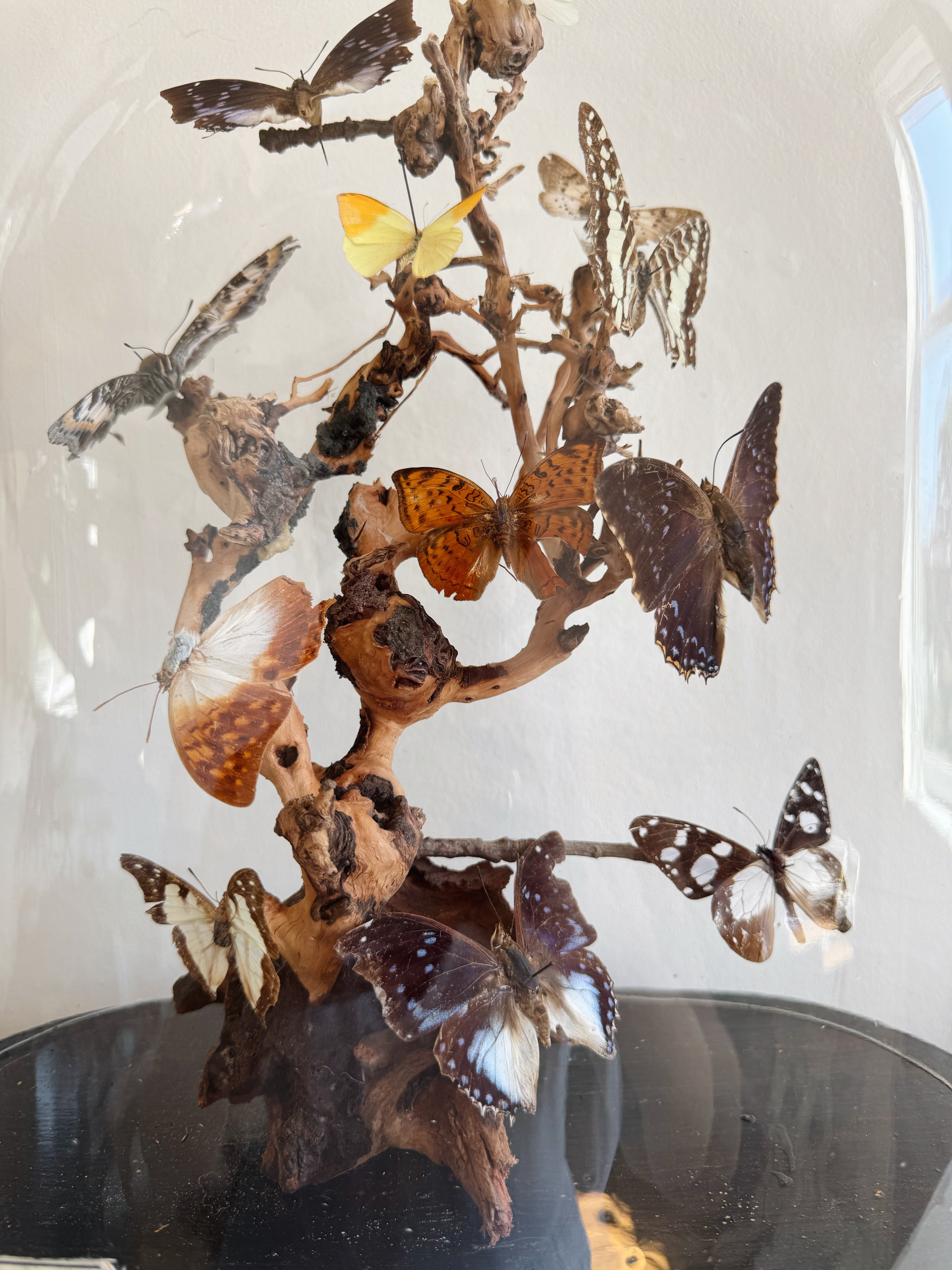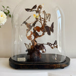 A rare antique butterfly display, housed beneath its original glass dome and mounted on an ebonised wooden base. The arrangement features an array of vividly preserved butterflies in tones of ochre, cream, yellow, and deep indigo, delicately pinned to branches of natural wood to create a sense of movement and flight. Some of the butterfies still bear there hand written specimen label.