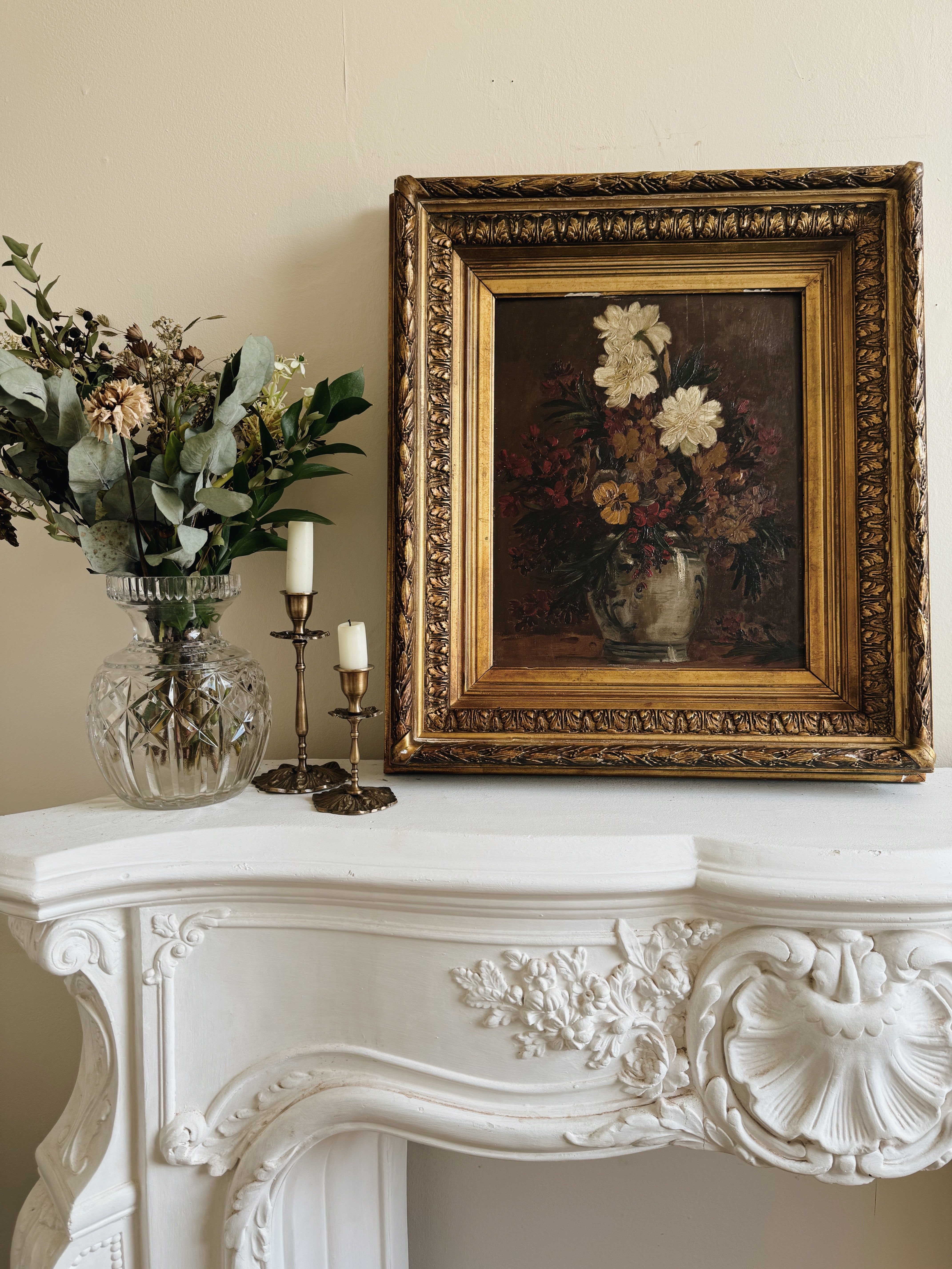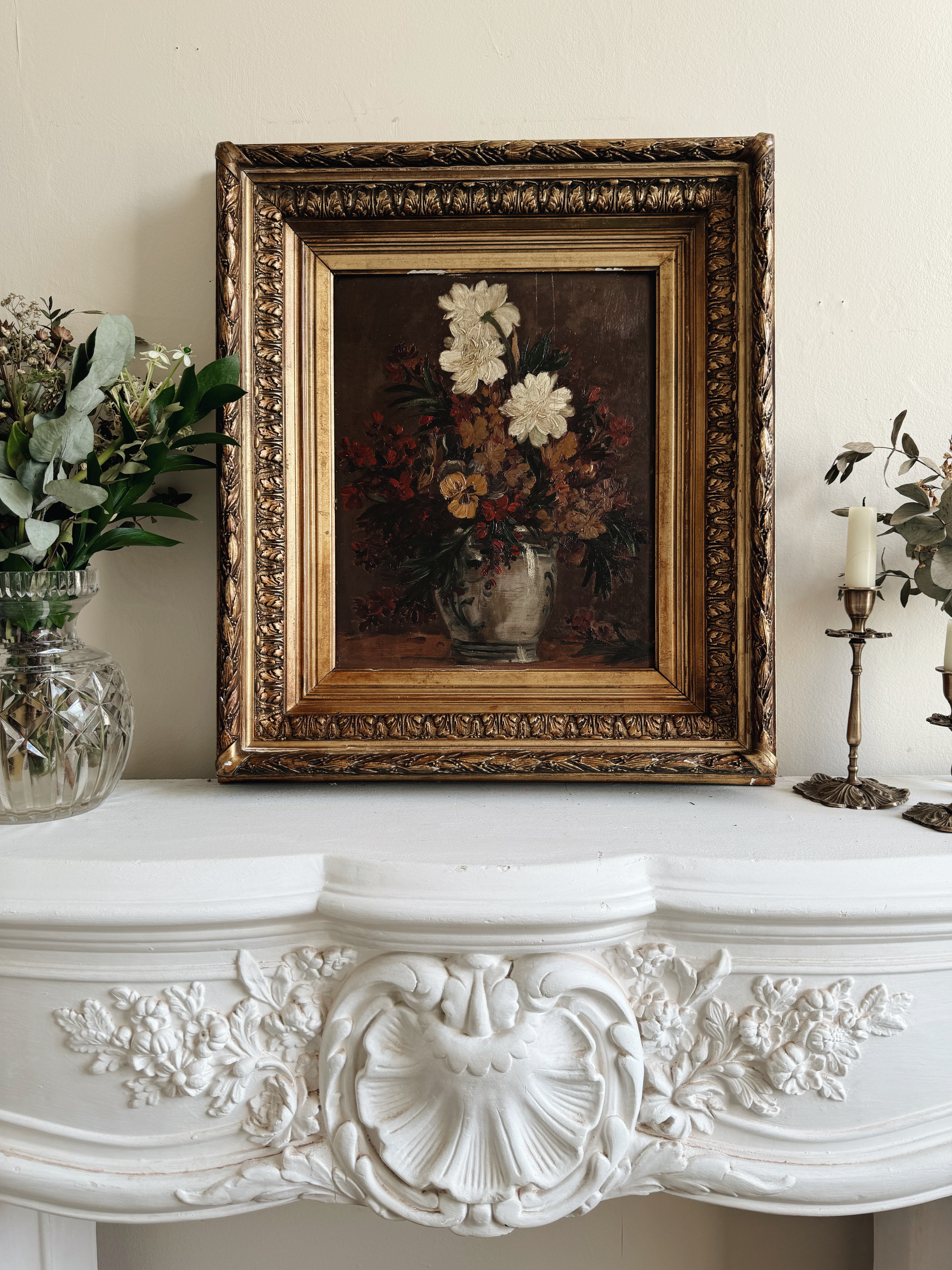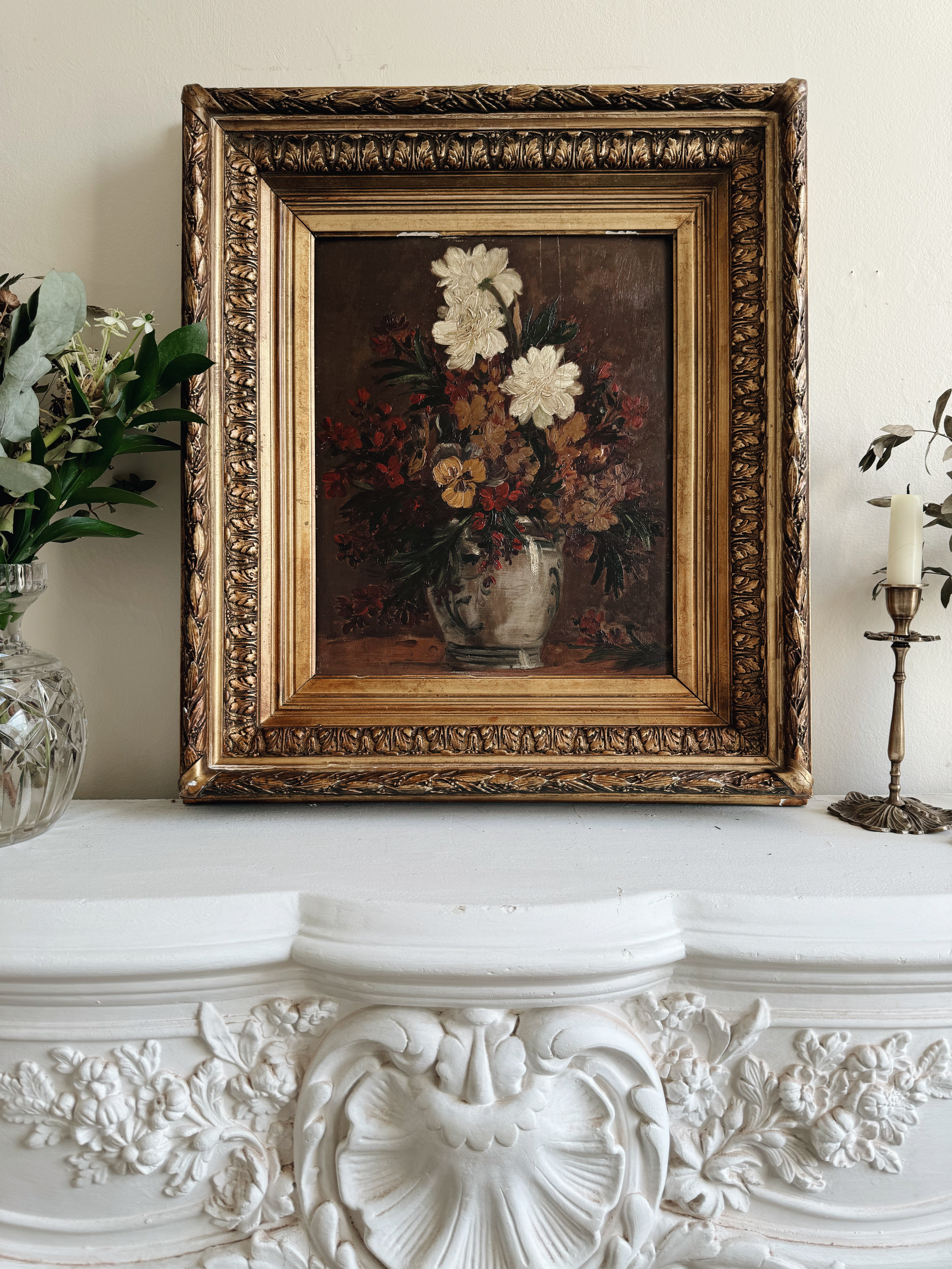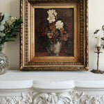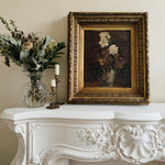 The jewel of this collection, a La Boheme classic antique floral oil painting in wonderful autumnal tones. The atmospheric colours of the piece, depicting a vase of flowers, are highlighted superbly by the magnificent gold frame, which is in a sublime tone of gold.