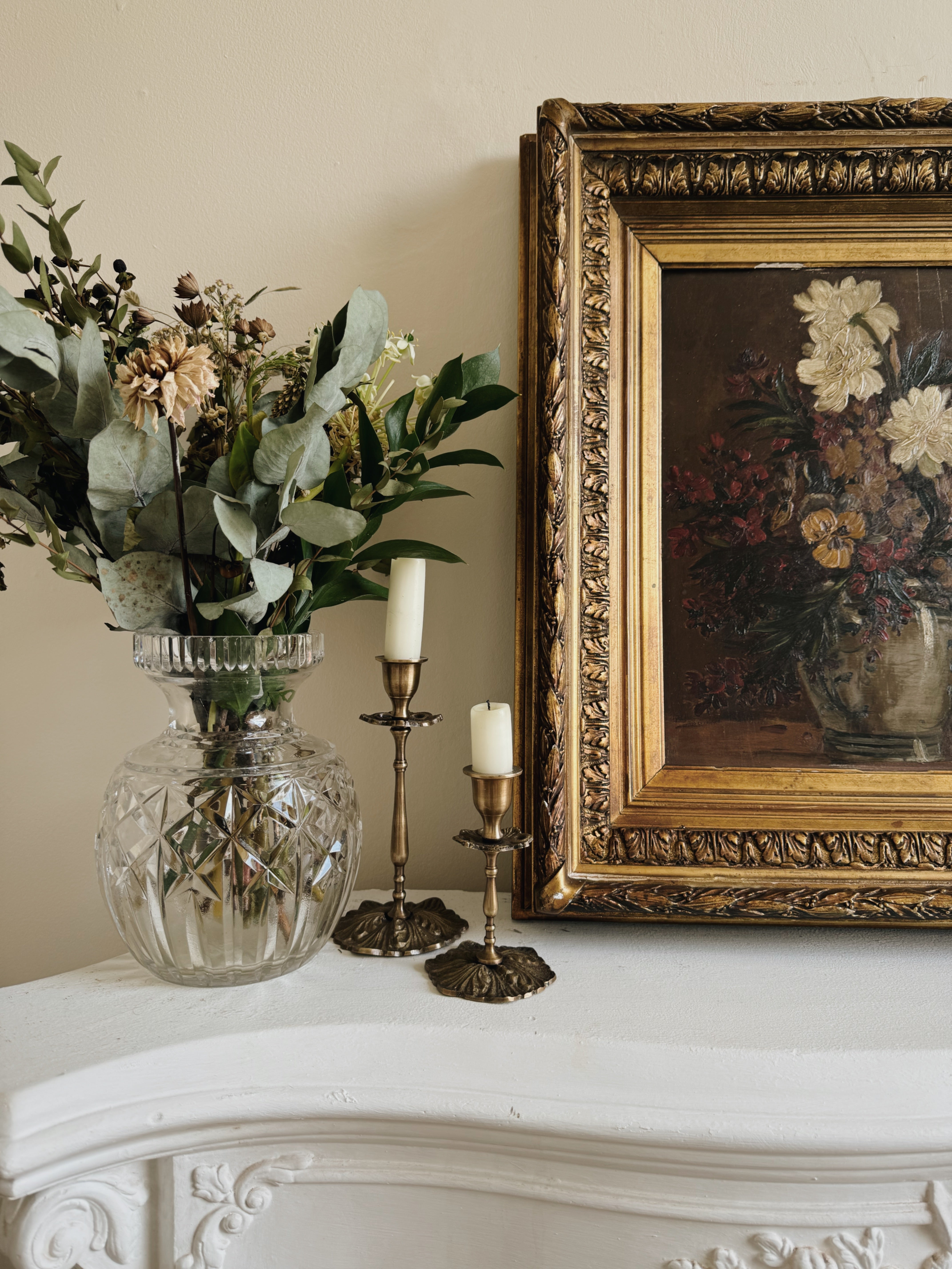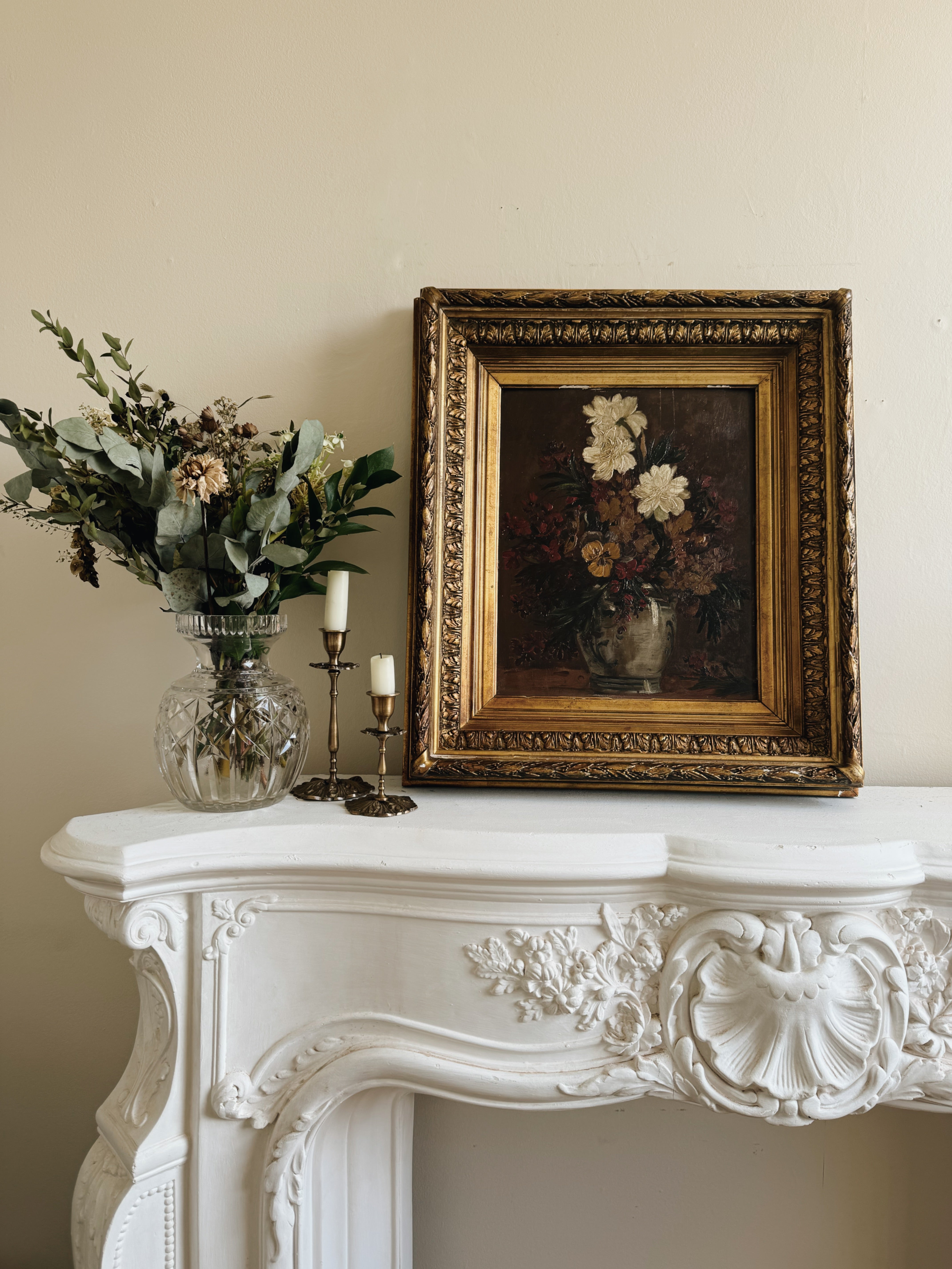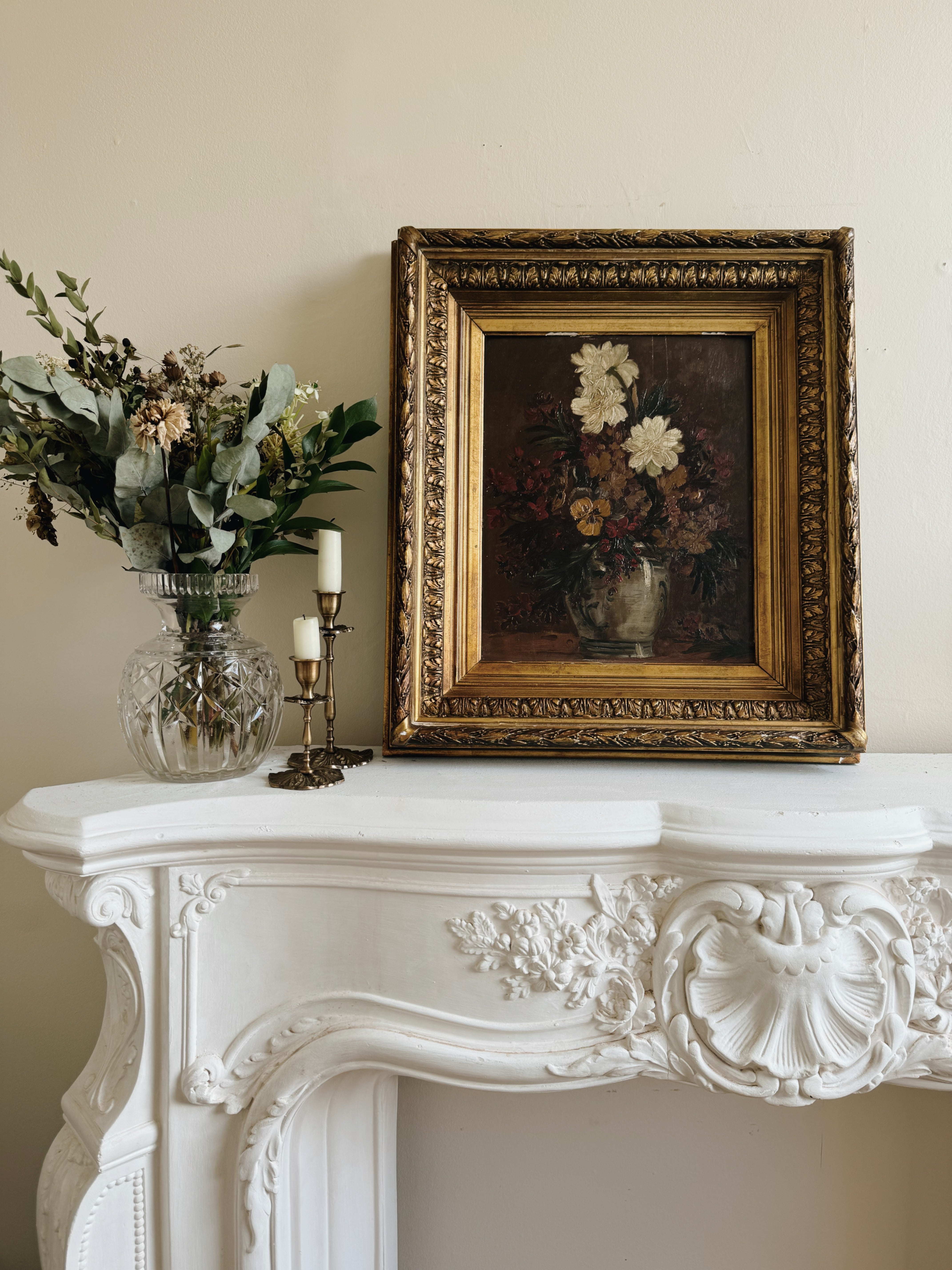 The jewel of this collection, a La Boheme classic antique floral oil painting in wonderful autumnal tones. The atmospheric colours of the piece, depicting a vase of flowers, are highlighted superbly by the magnificent gold frame, which is in a sublime tone of gold.