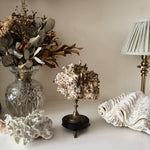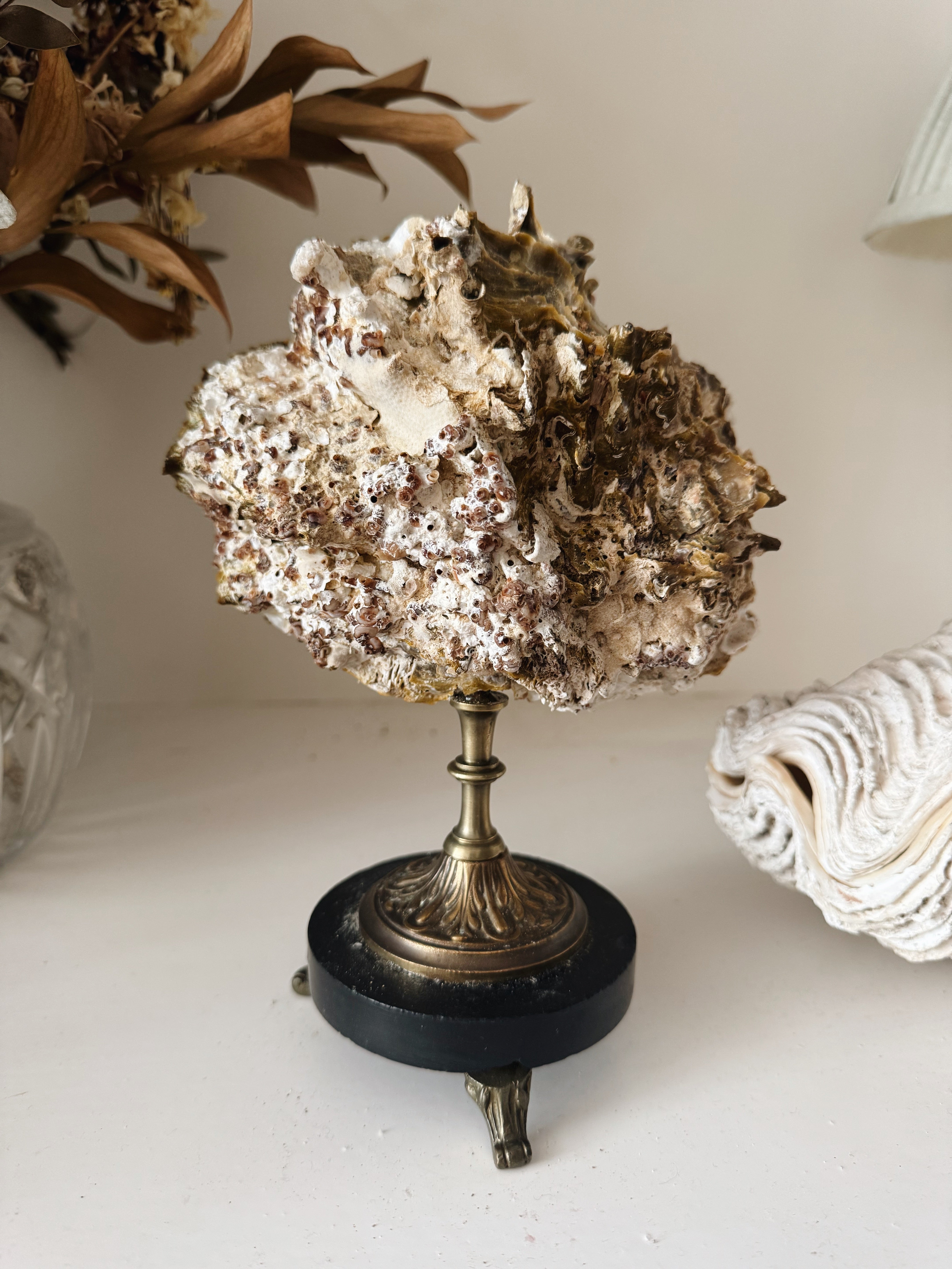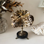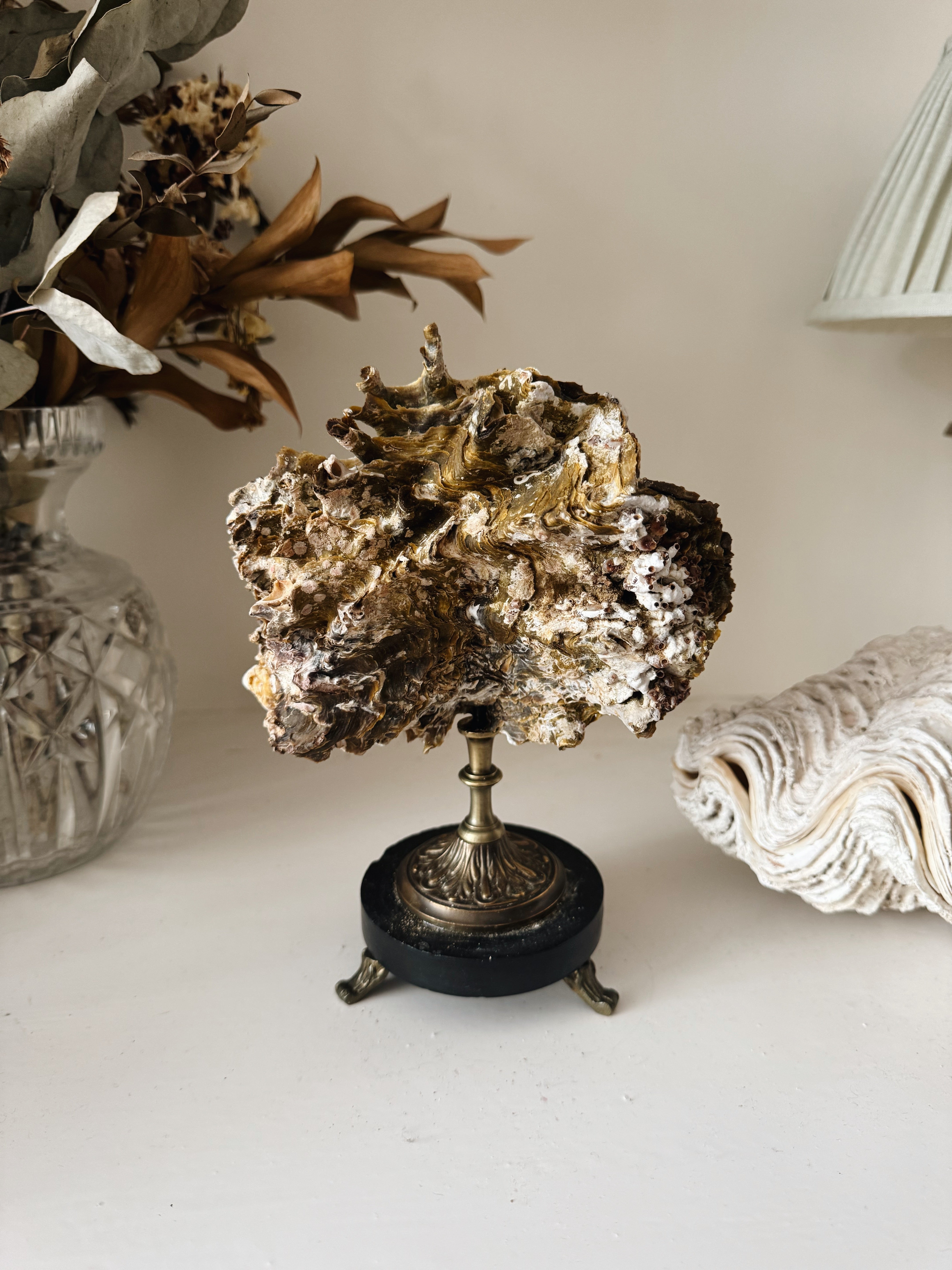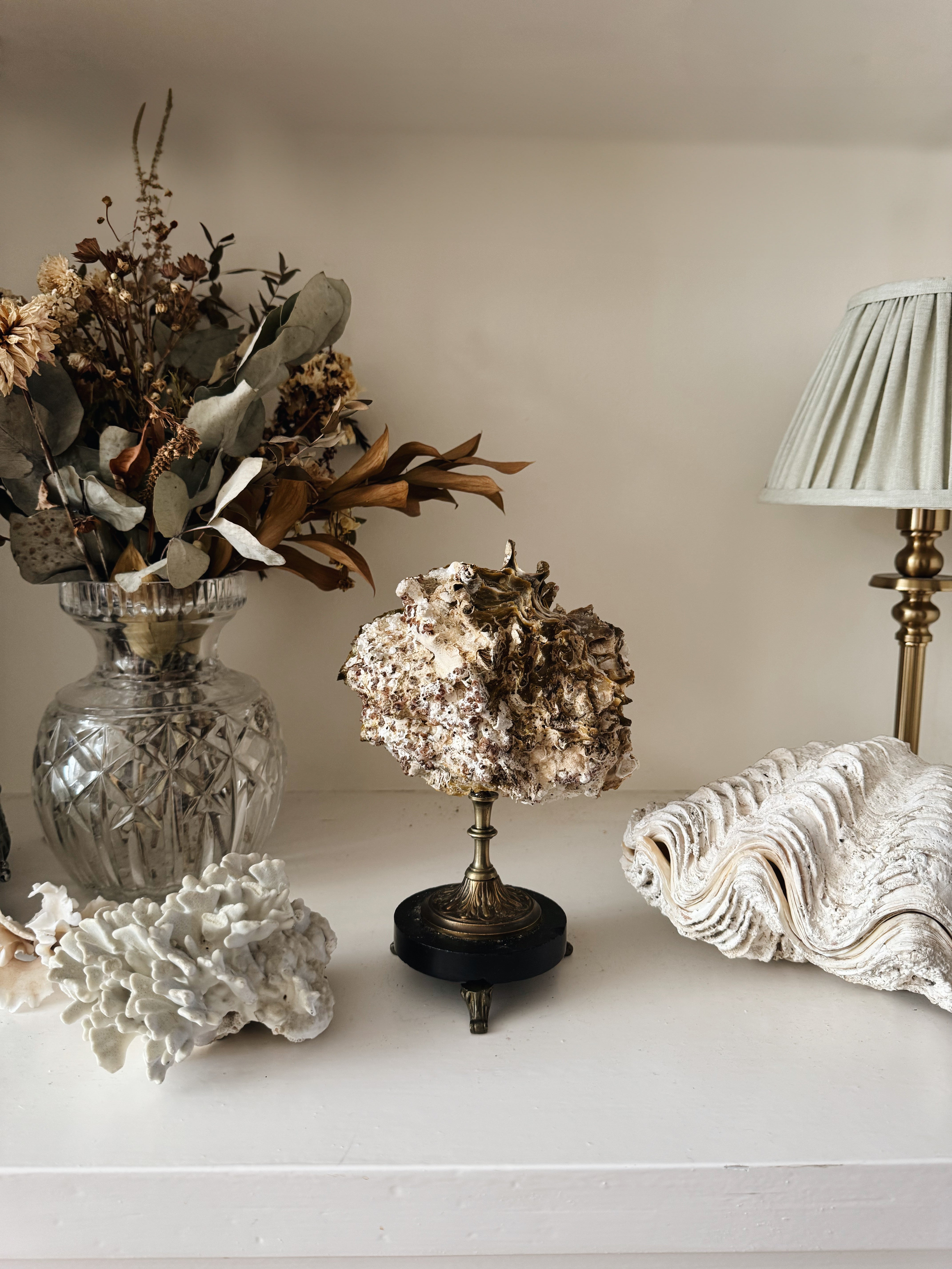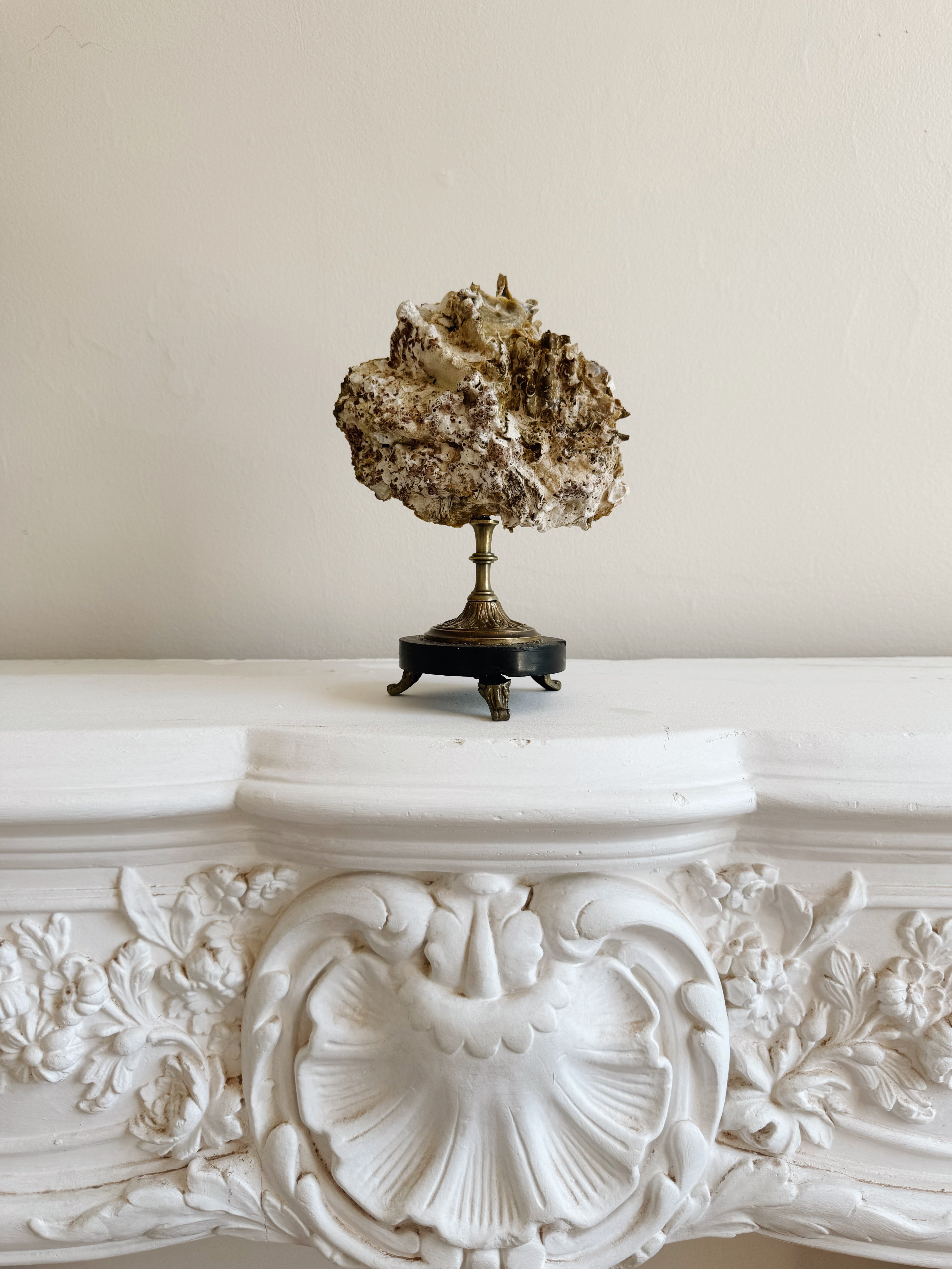 A rare antique French coral specimen, mounted on an ornate gilt and ebonised stand. The organic form is richly textured, with natural cavities and tonal variations in cream, ochre, and warm brown, giving it a sculptural presence that feels both raw and refined.