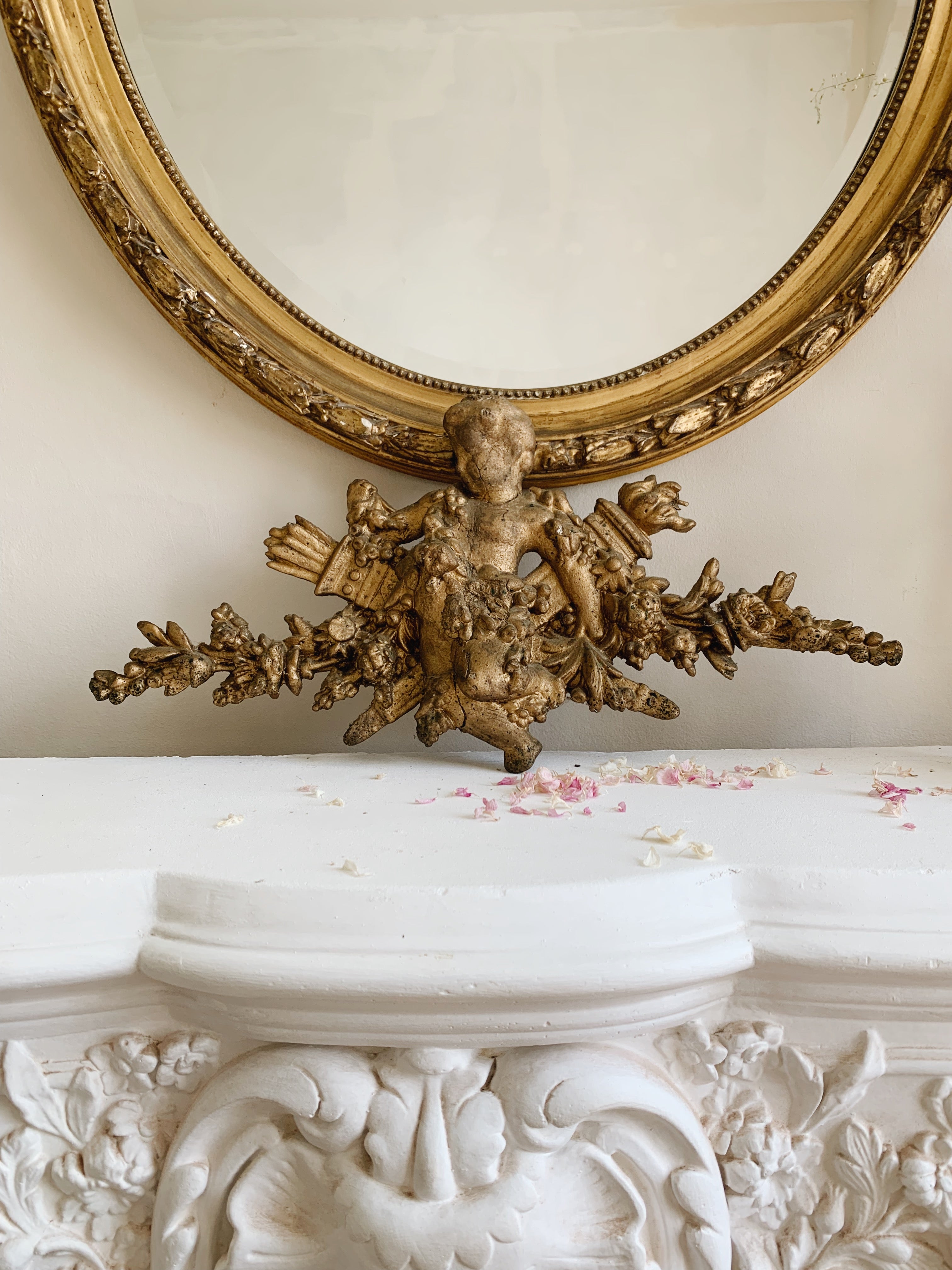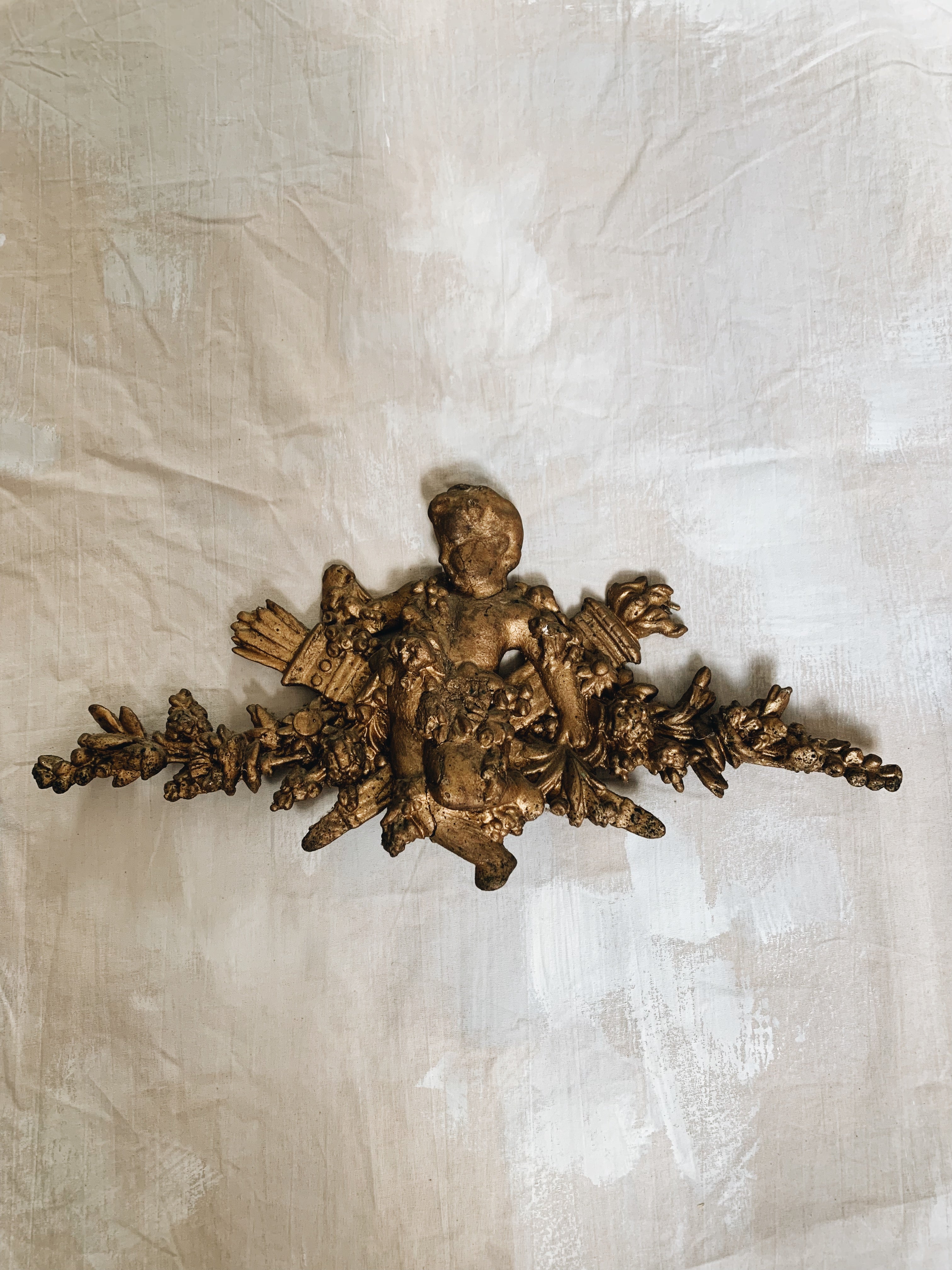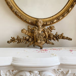 A unique and historic piece of 19th century gilt plasterwork, this romantic piece features a cherub amongst an intricate and ornate floral design. This piece could be hung on a wall or as a decorative feature on a shelf or fireplace, as we have done here.