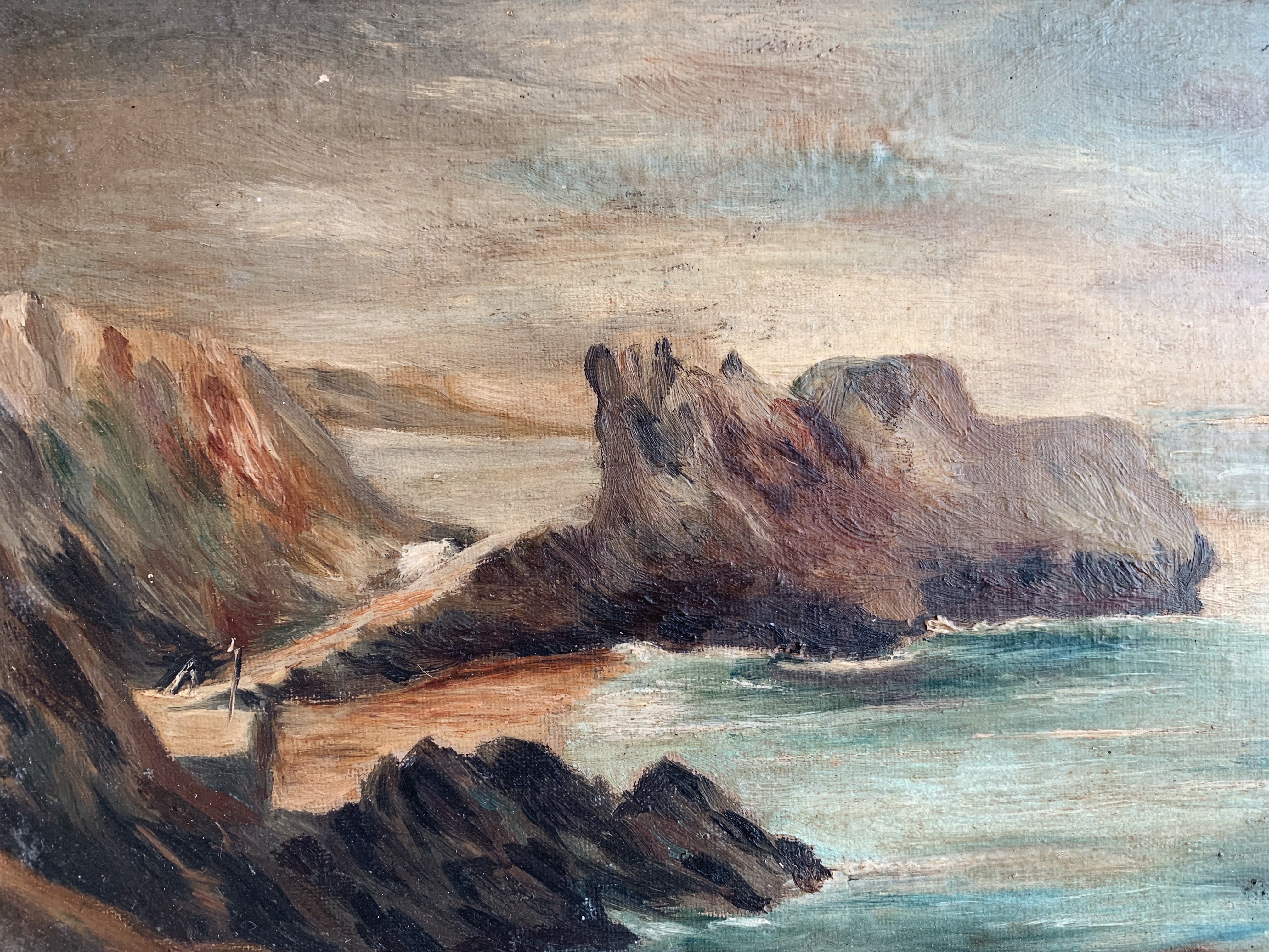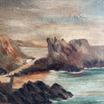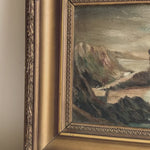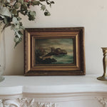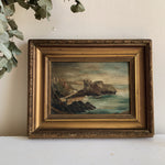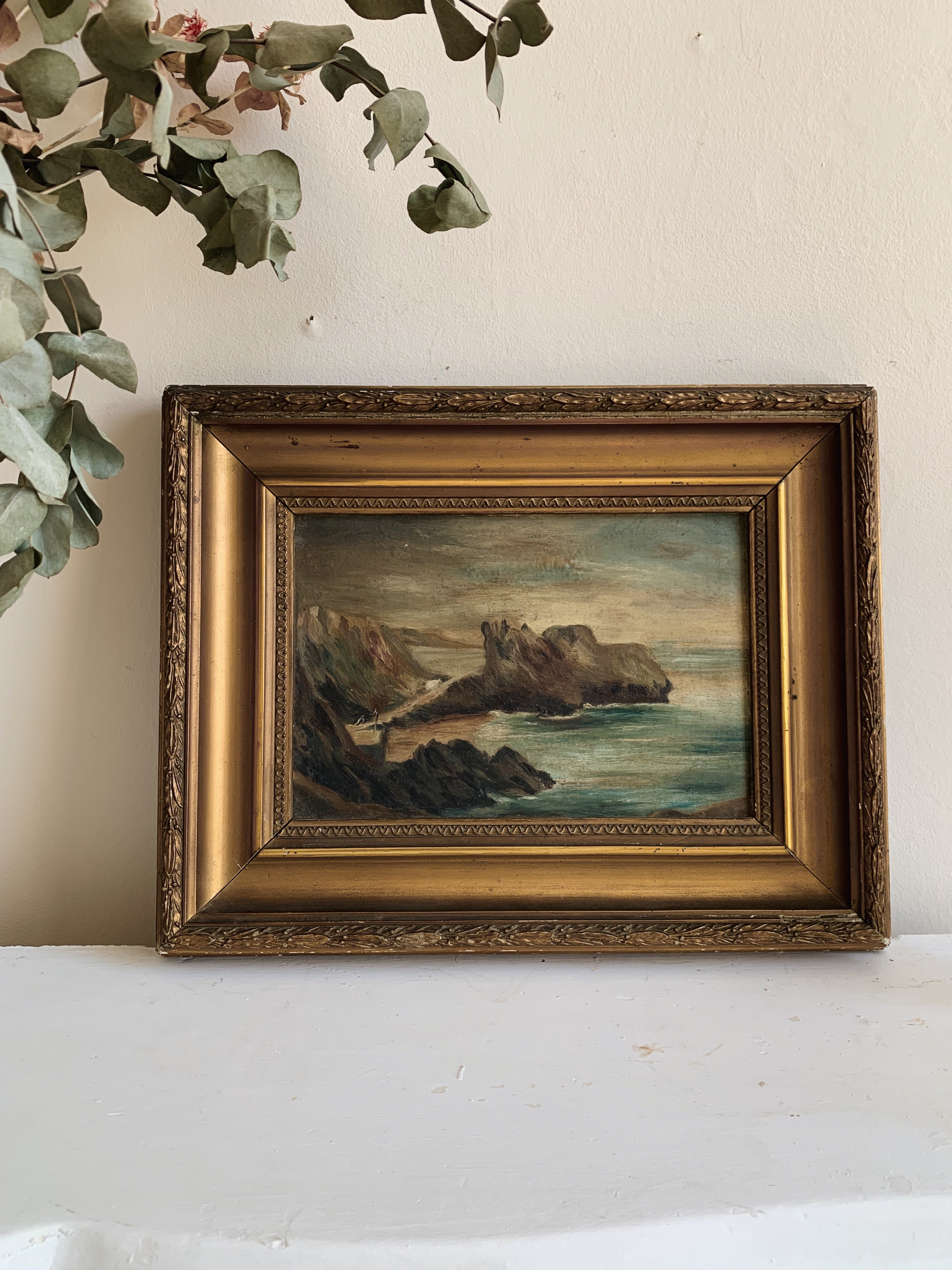 A sweet but moody 19th century oil on board of the sea meeting the rocky shoreline. The painting is in excellent condition, as is the gilt wood frame in which it sits. Would make a wonderful addition to a gallery wall or as a stand alone piece.