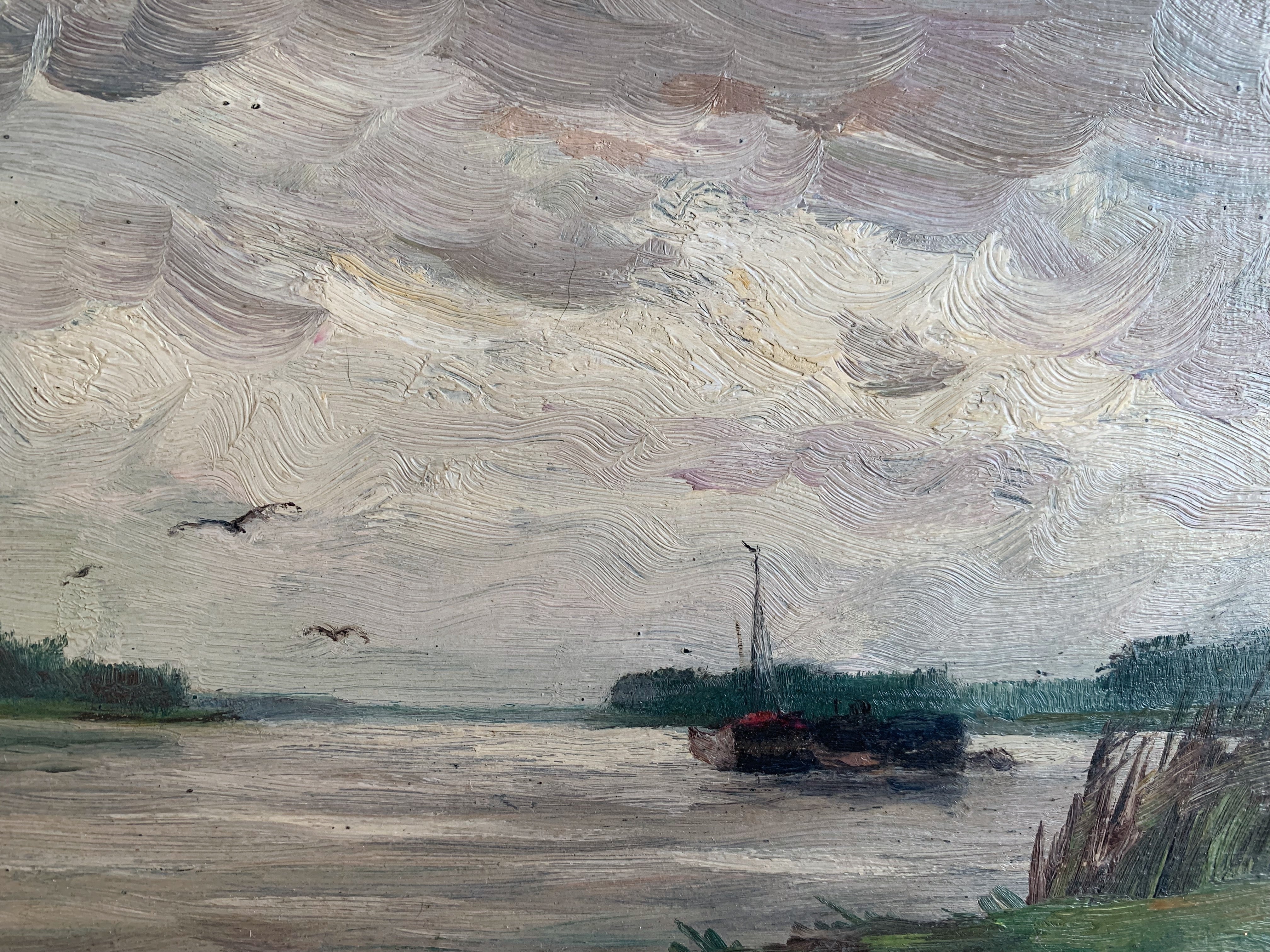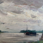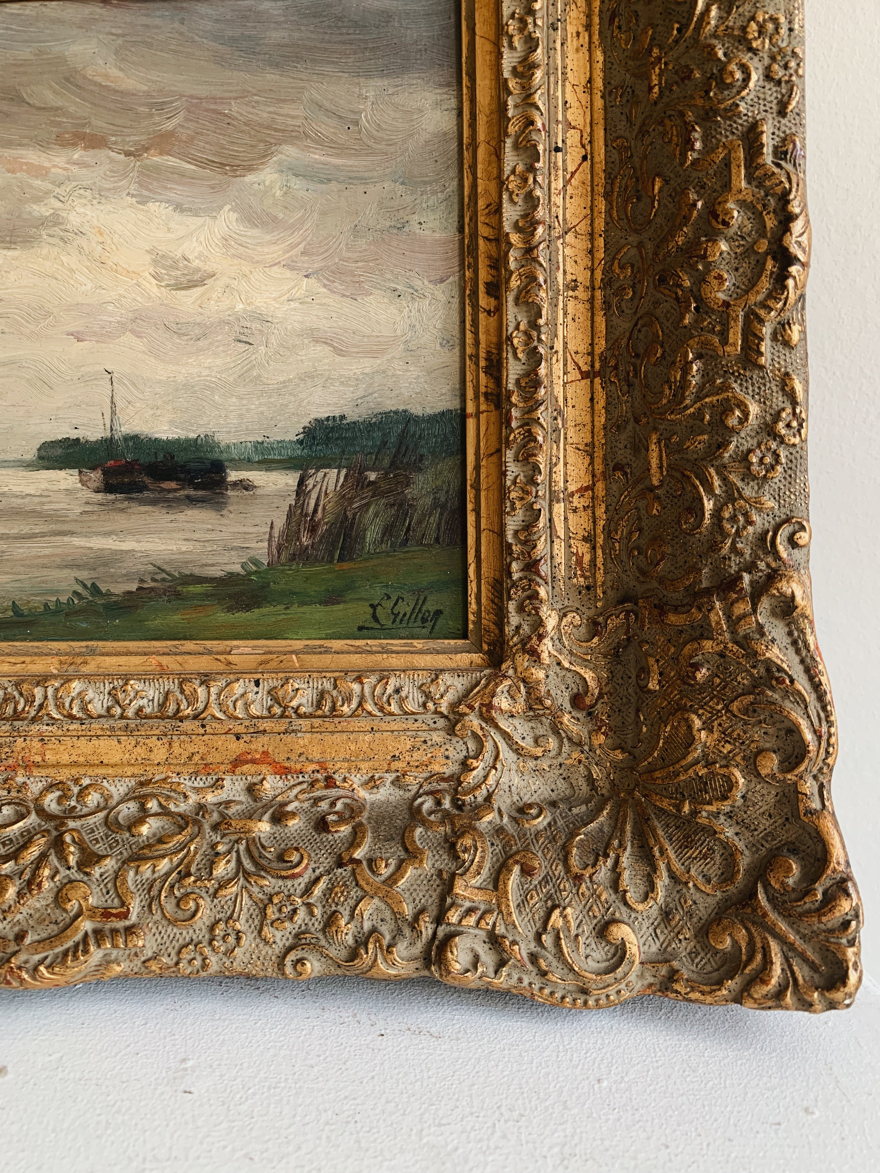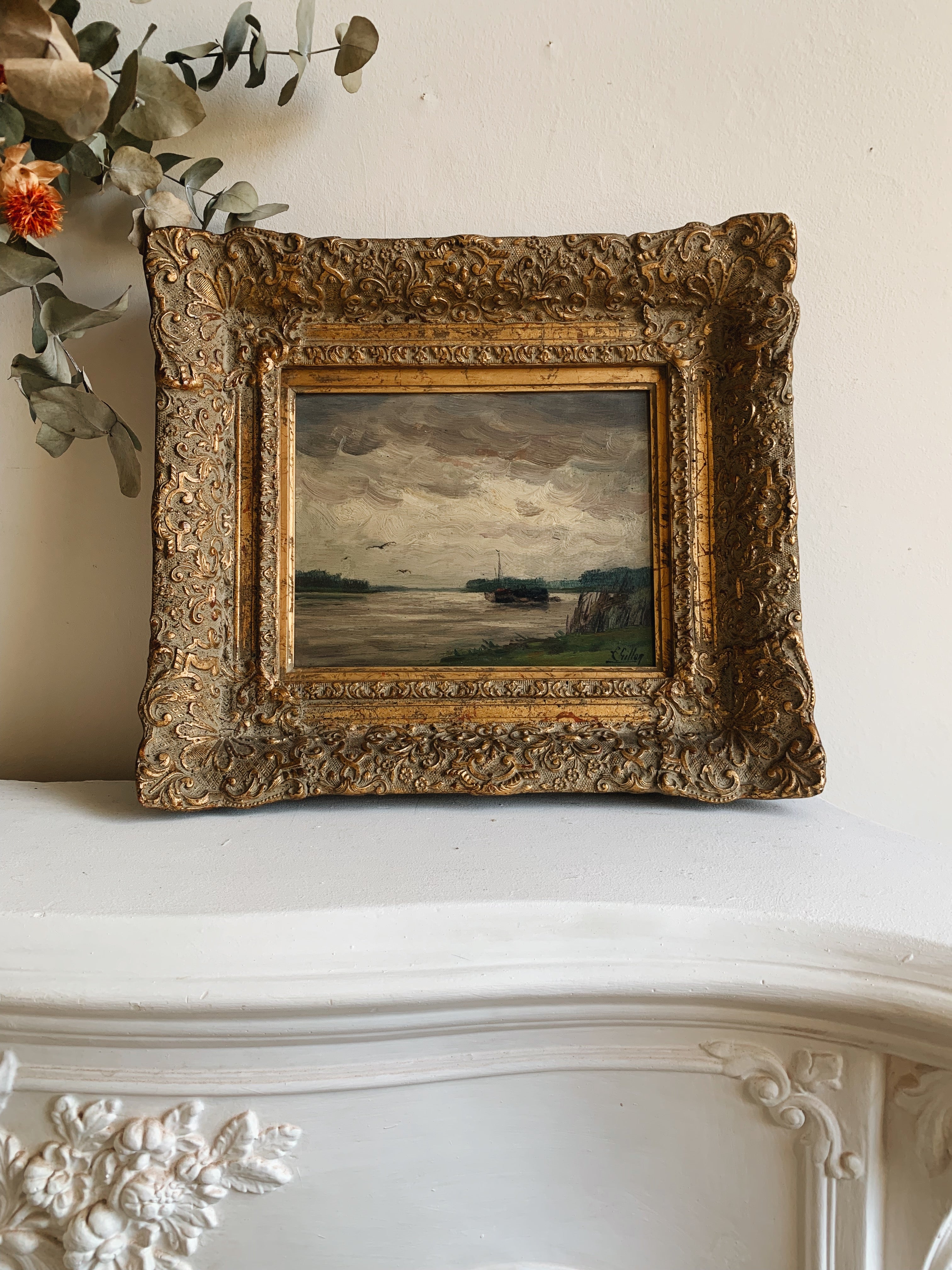 A wonderfully moody and romantic seascape. The atmospheric grey tones of this oil painting  beautifully contrast with the resplendent and impressive gold frame it sits in. Anyone with a home physically or spiritually by the sea, will fall in love with this enchanting piece of art.