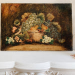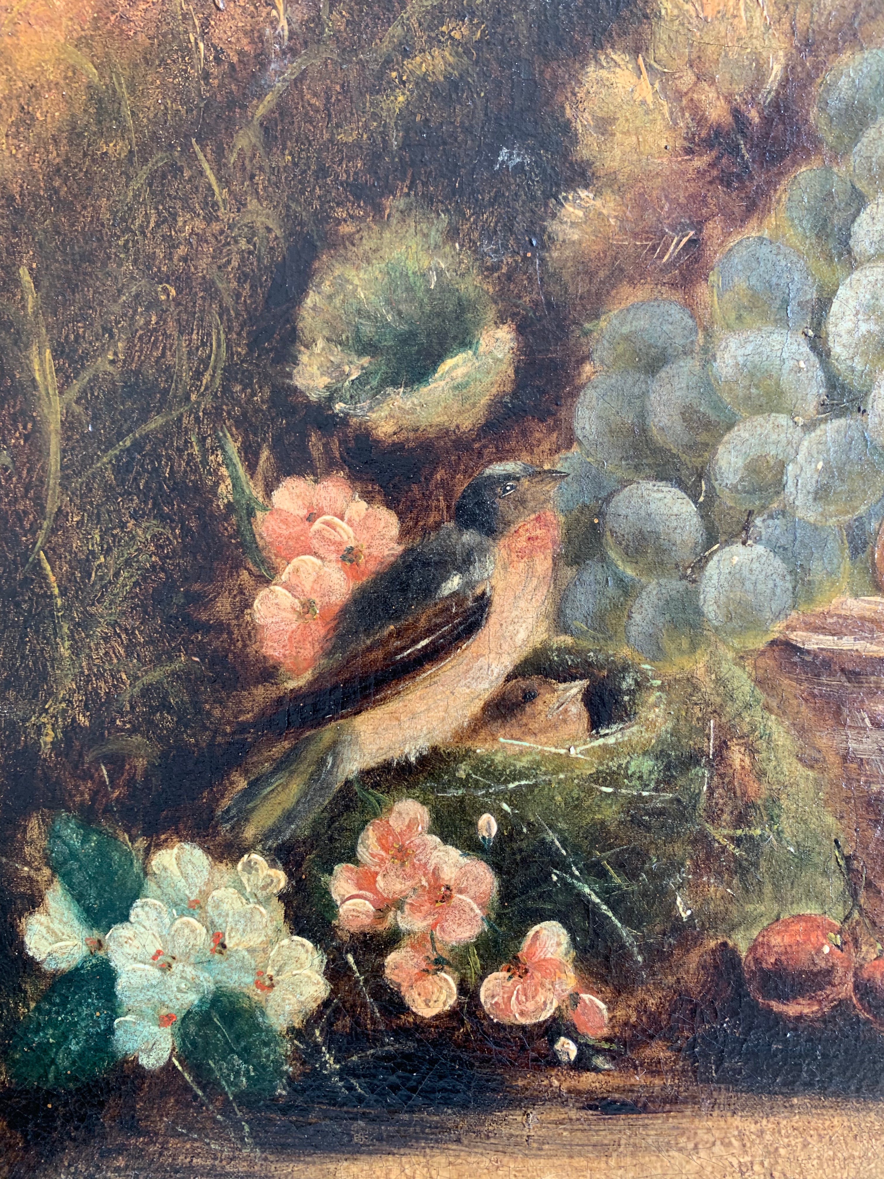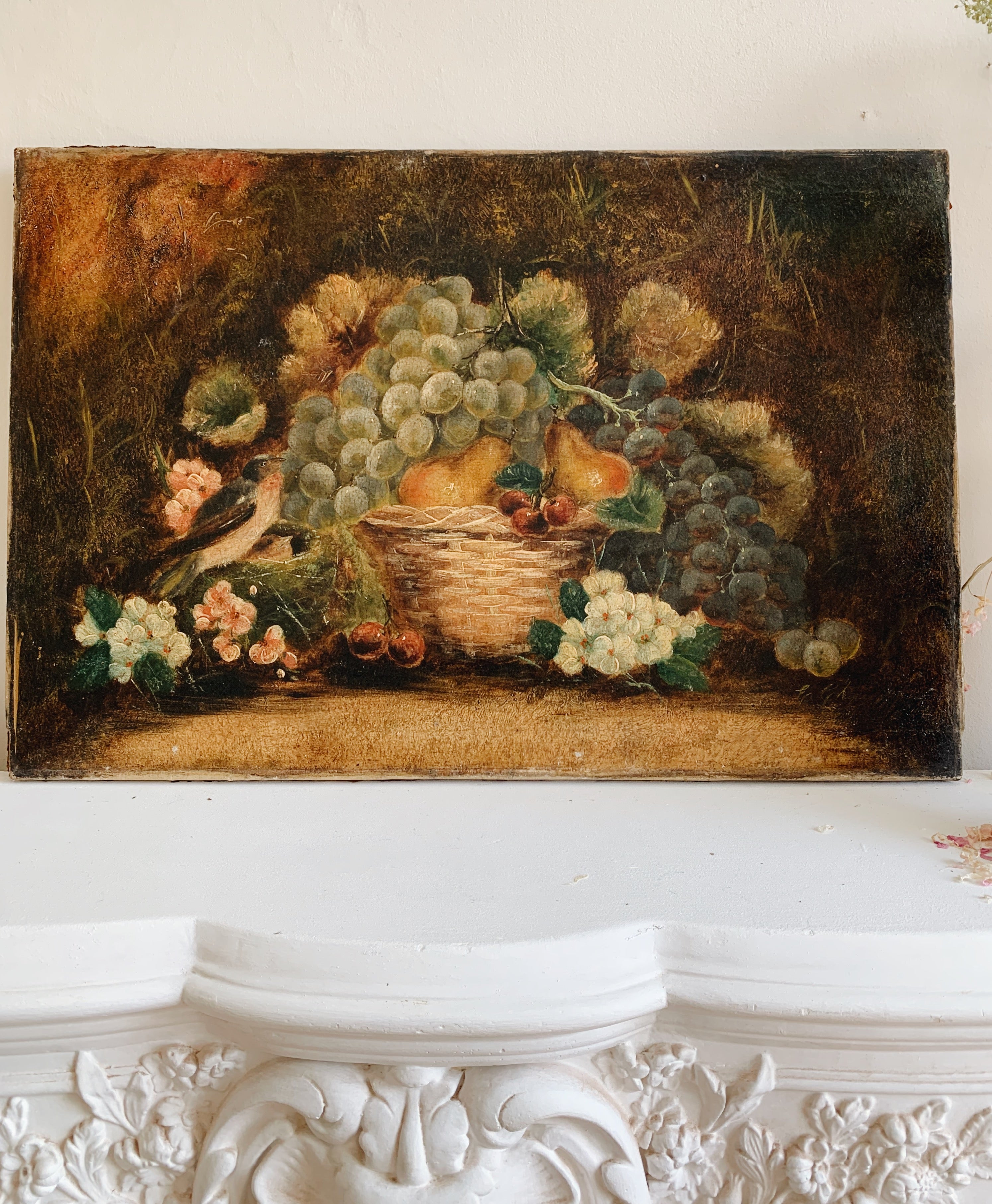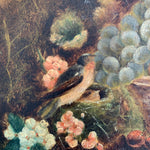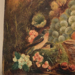 The painting is oil on canvas and depict bounties of fruit and flowers overflowing from a basket, with an enchanting little bird looking eagerly on. The painting could be hung as it is or framed.