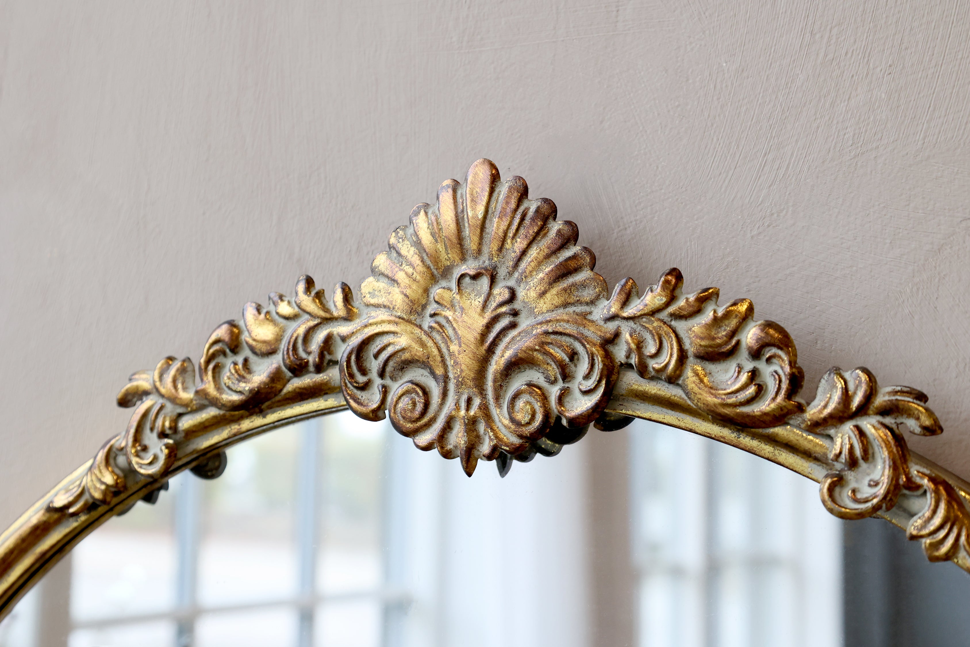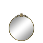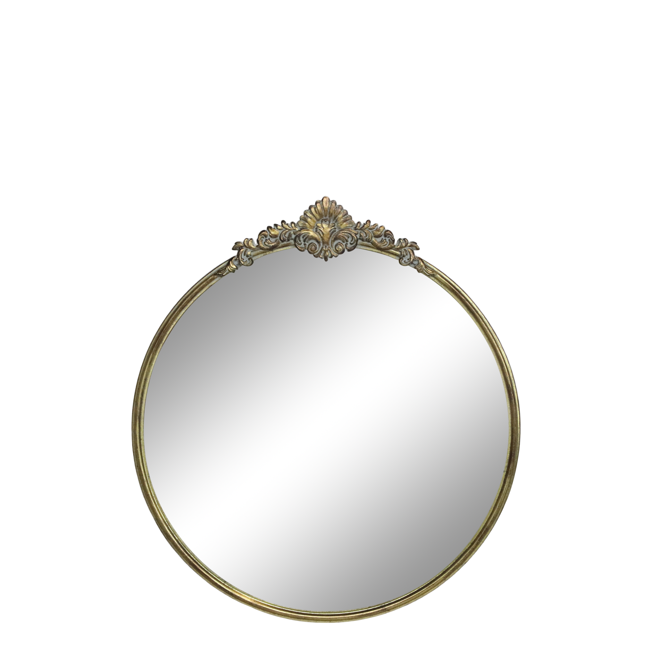 Add a touch of Parisian elegance to your home with this antique-style round mirror, featuring a beautifully detailed shell crest and gently aged patina. The delicate ornate frame evokes the charm of a genuine 19th-century French find, perfect for adding character to a hallway, bedroom, or living space space.