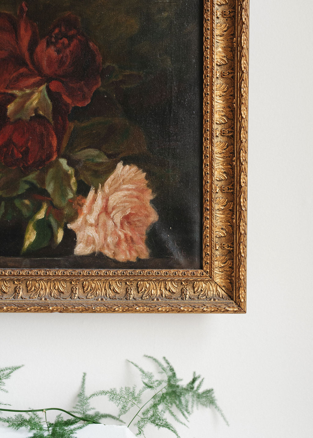 This beautiful old English Rose Oil Painting is set in its original gold gilt frame. The piece is signed and dated 1916 and is a perfect example of the post Edwardian art in the pre World War I period.