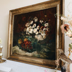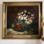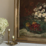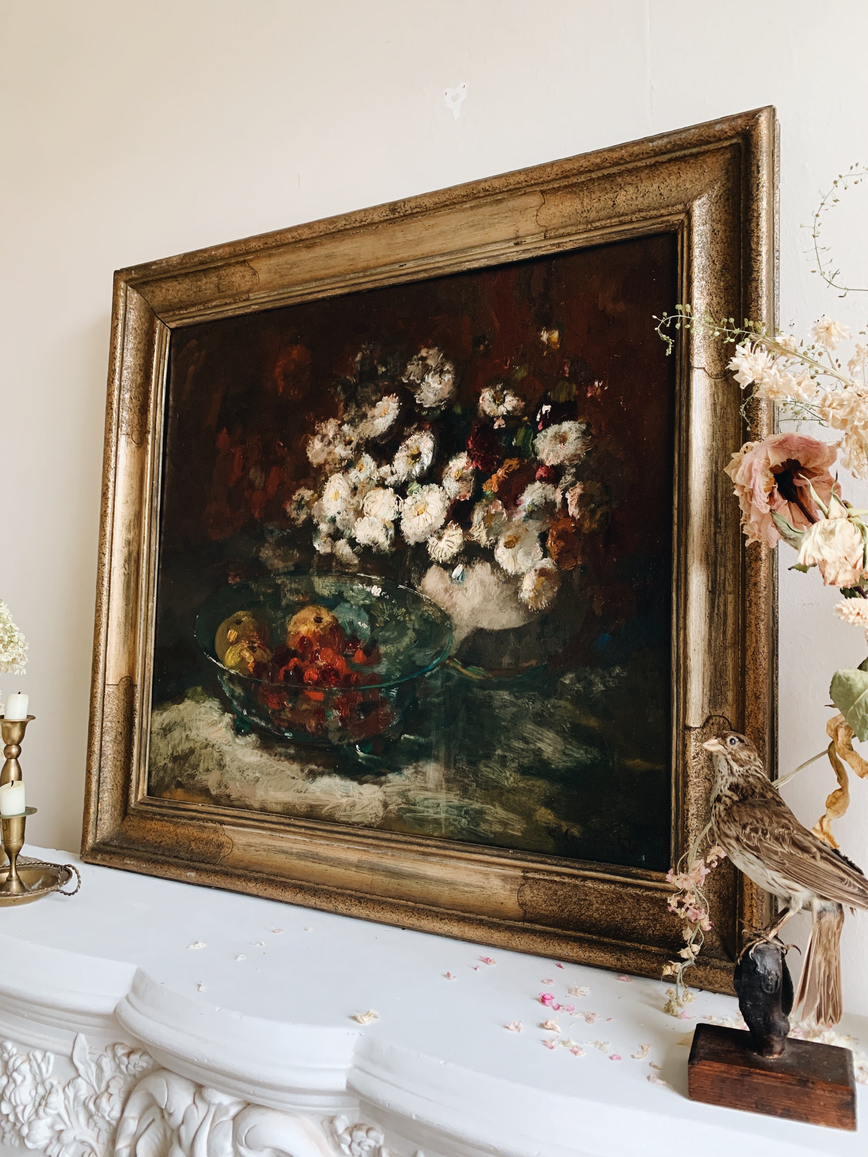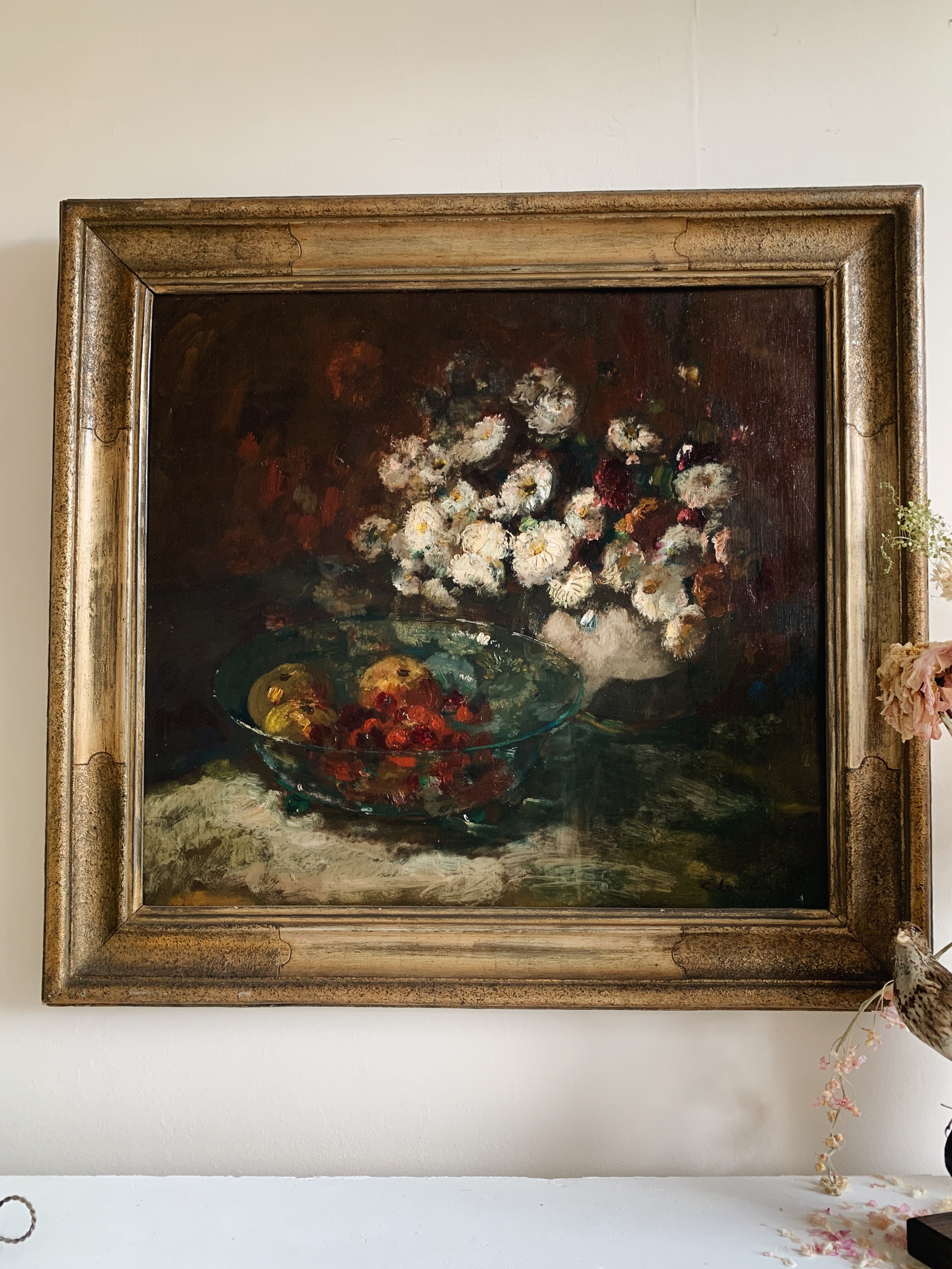 Oil on panel, this enchanting still life of flowers and fruit has lots of depth which come from the rich jewel like colours, which are perfectly offset in the dark gold frame.