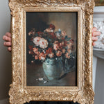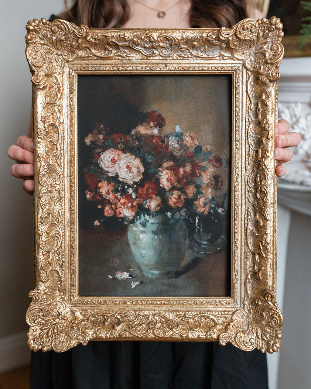 This enchanting piece is a recreation of one of our most sought after antique paintings, a romantic French floral oil painting from the early 20th century. It depicts the the most perfect floral blooms in a green vase placed upon a table.