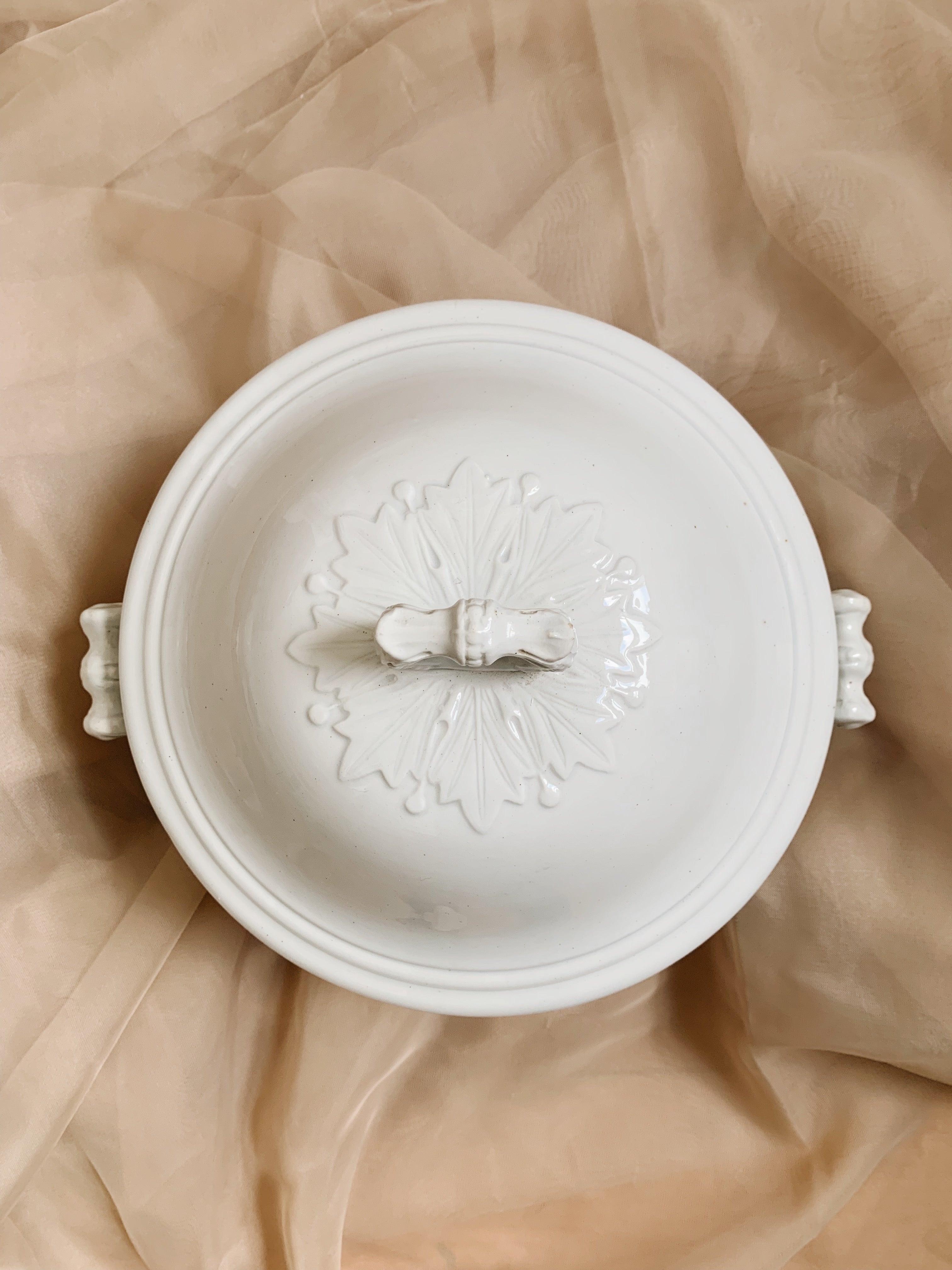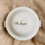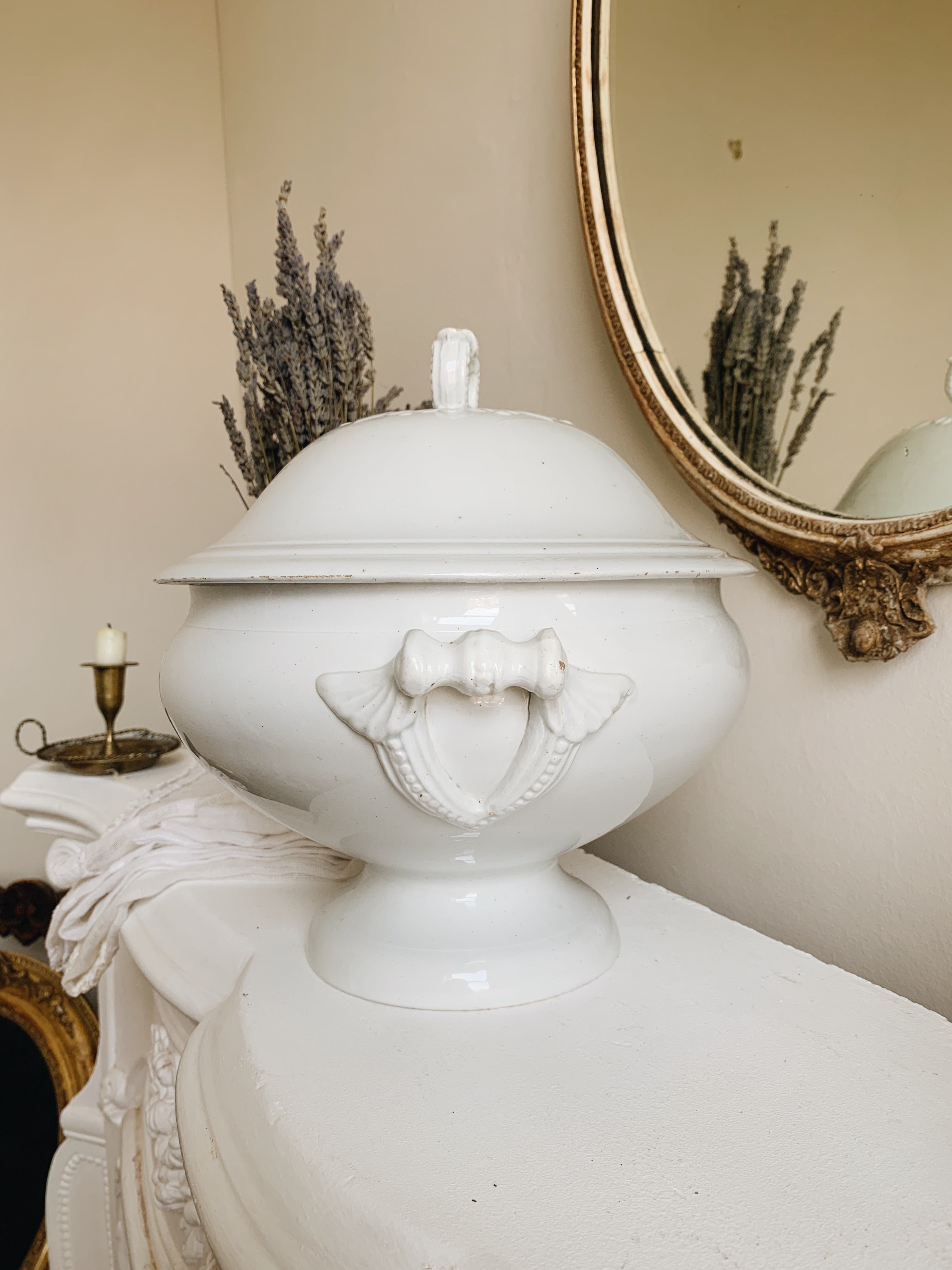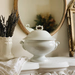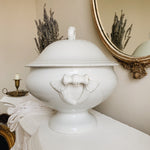A lovely porcelain antique French Soupier, with wonderful decorative detailing on the lid and handles. In great condition and would make the perfect addition to any modern country kitchen or dining space.