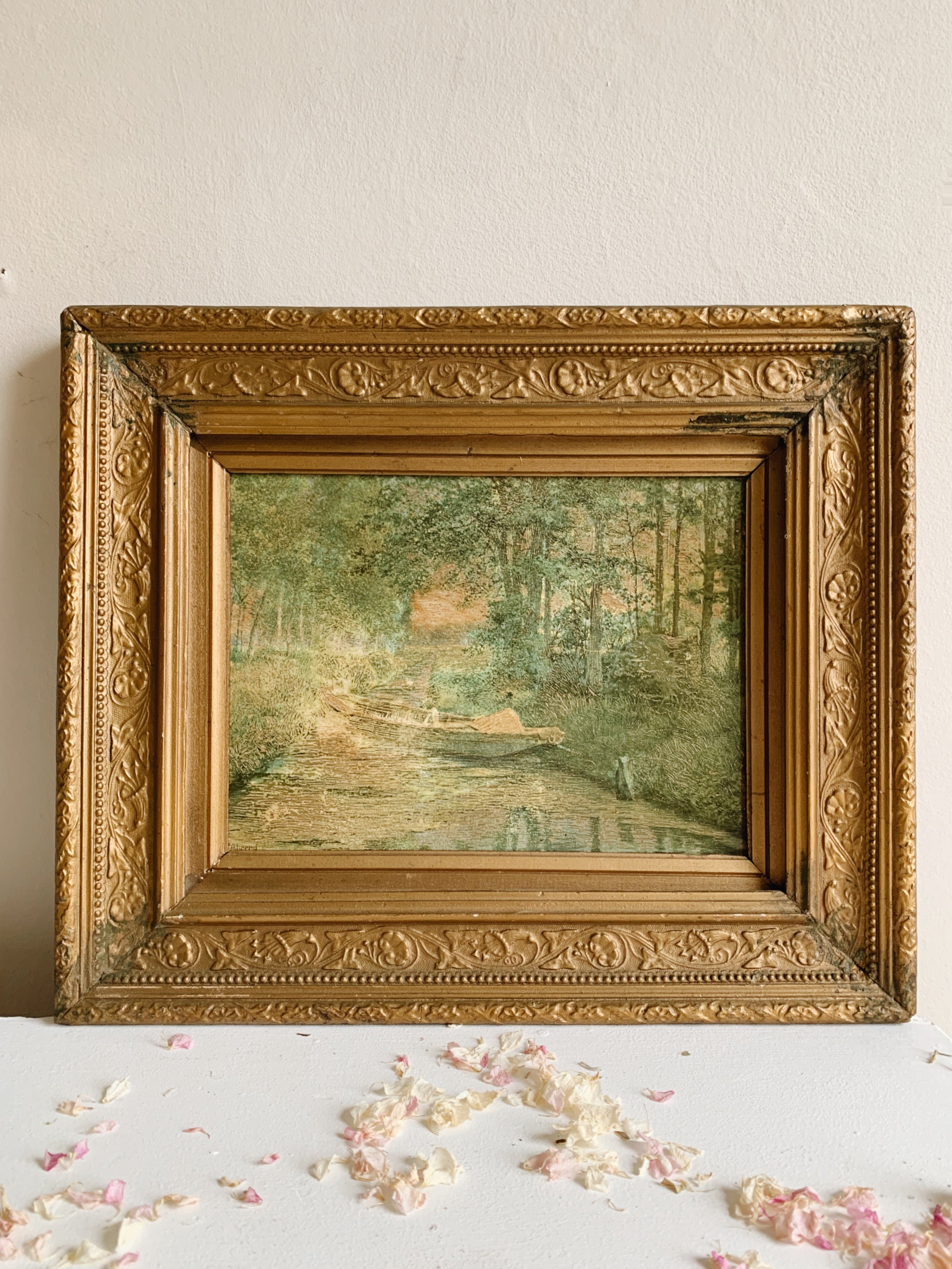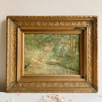 A sweet little landscape oil on board painting in an impressionist style, featuring a rowing boat on a stream against a woodland setting in hazy soft green tones in a painted gold wood frame.