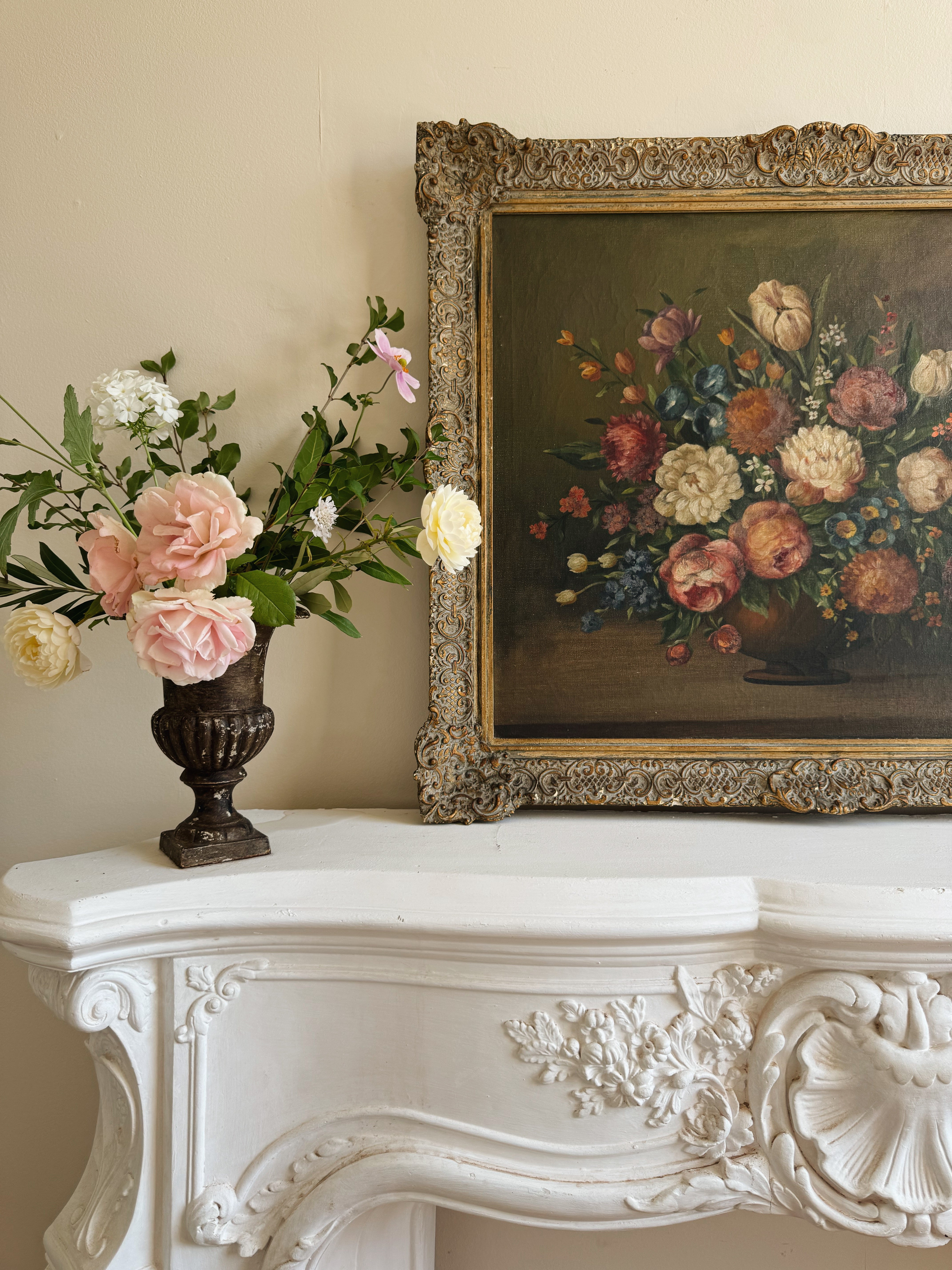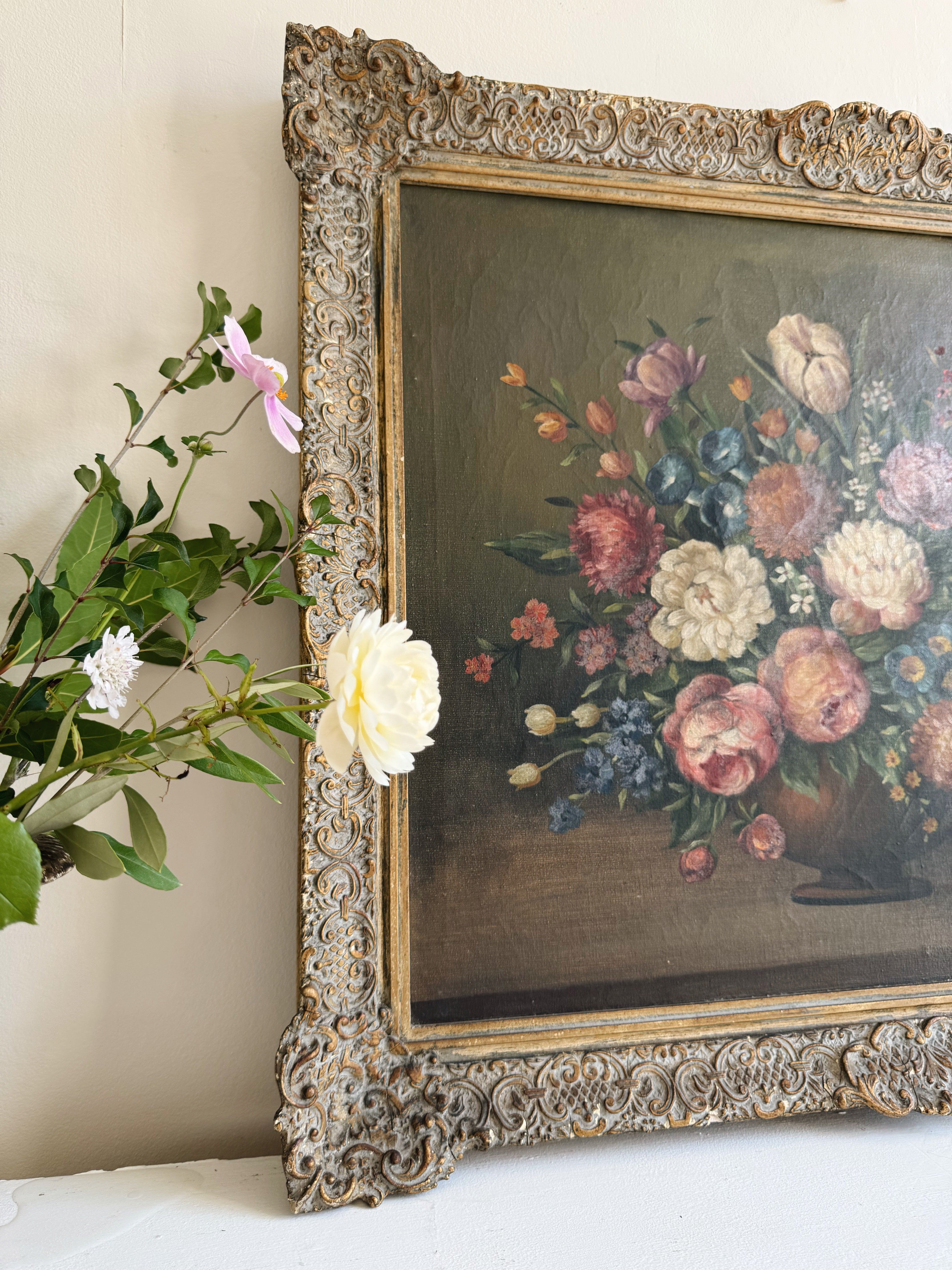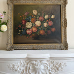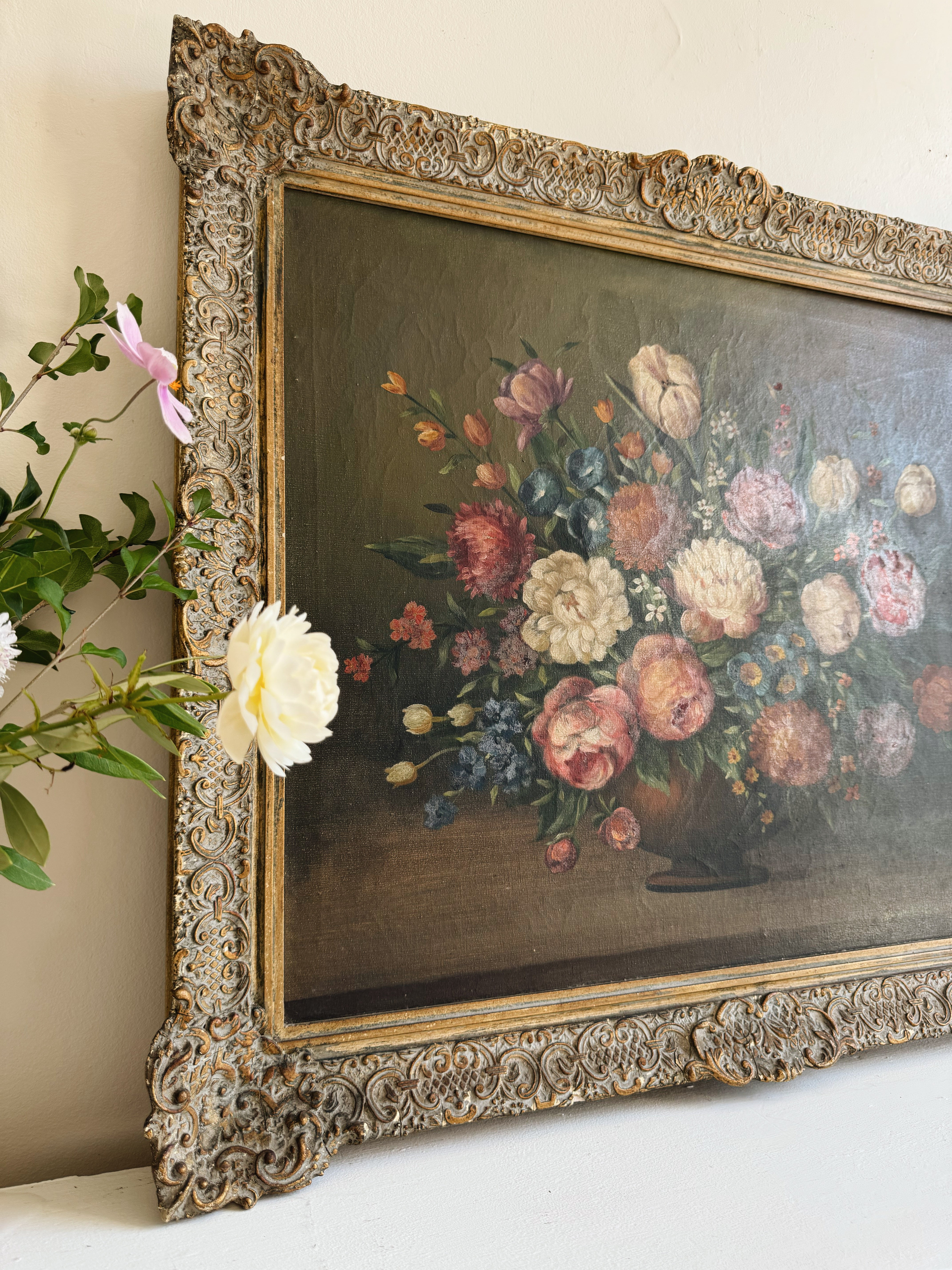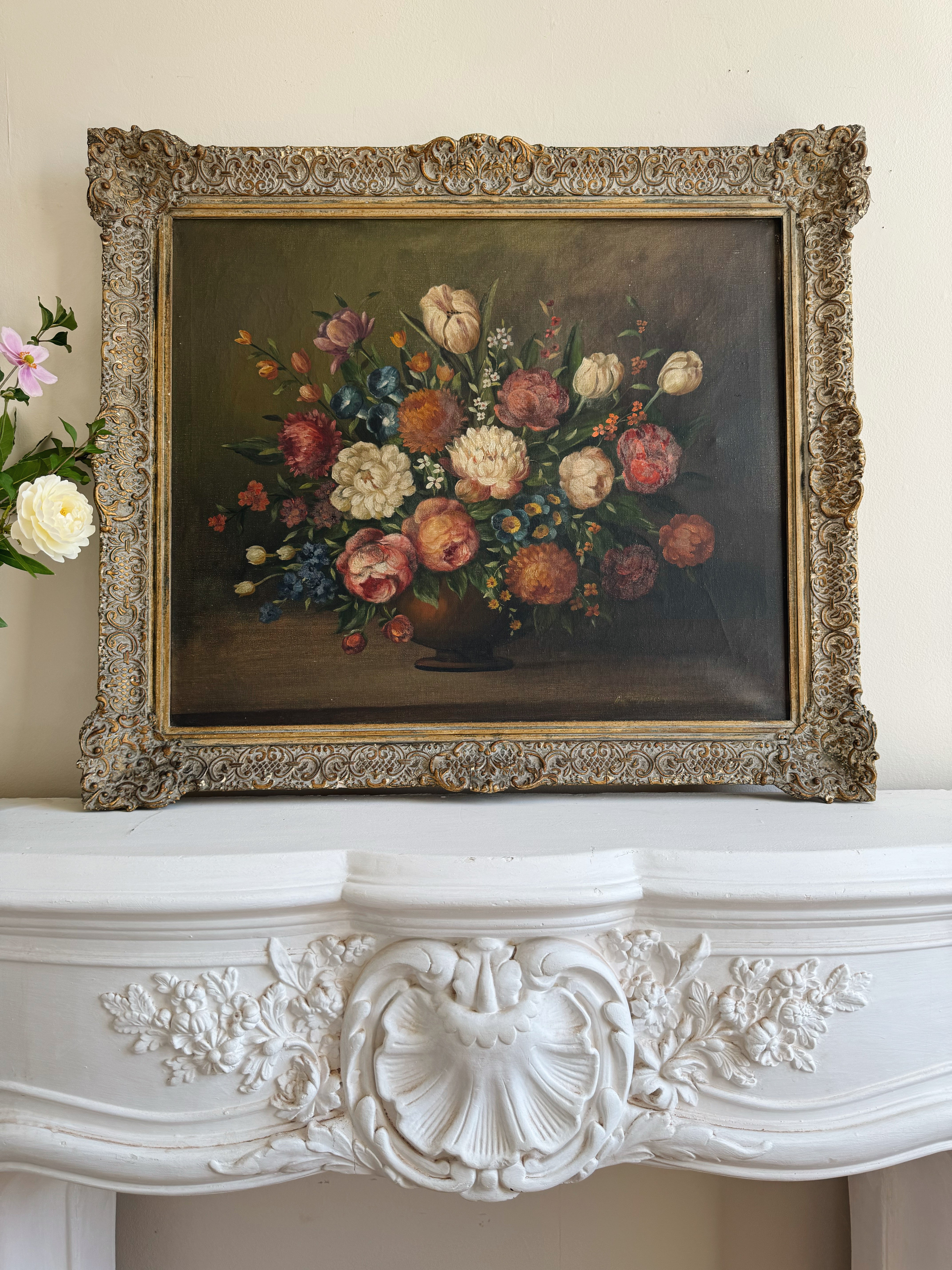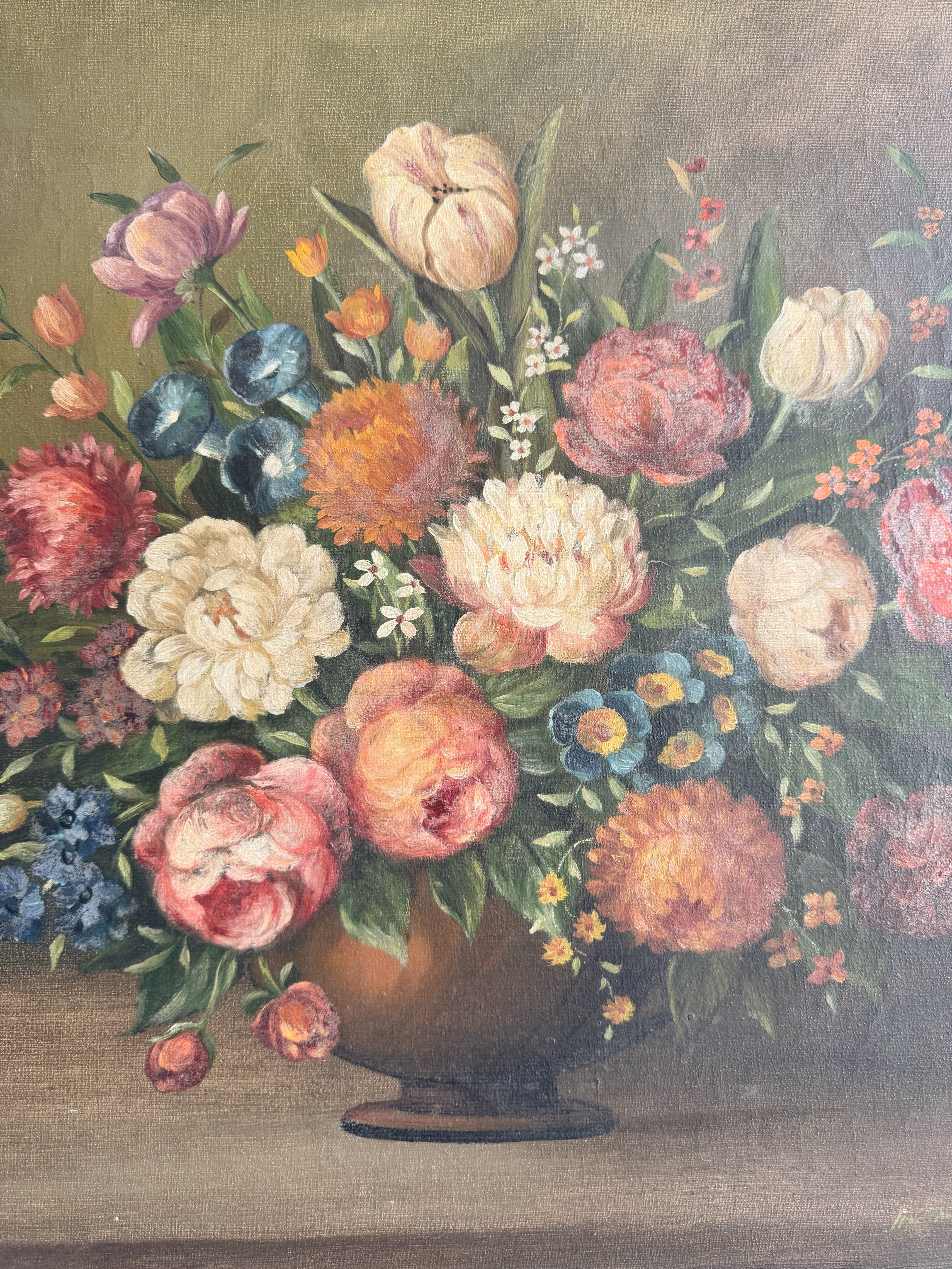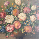 An opulent vintage floral oil painting on canvas, abundant with peonies, tulips, roses, and wildflowers gathered in a classical urn. The artist has captured every petal with sumptuous colour and depth  with soft creams, vivid carmines, dusky pinks, and touches of blue arranged against a dark, moody ground in the grand tradition of the Dutch Masters.