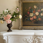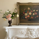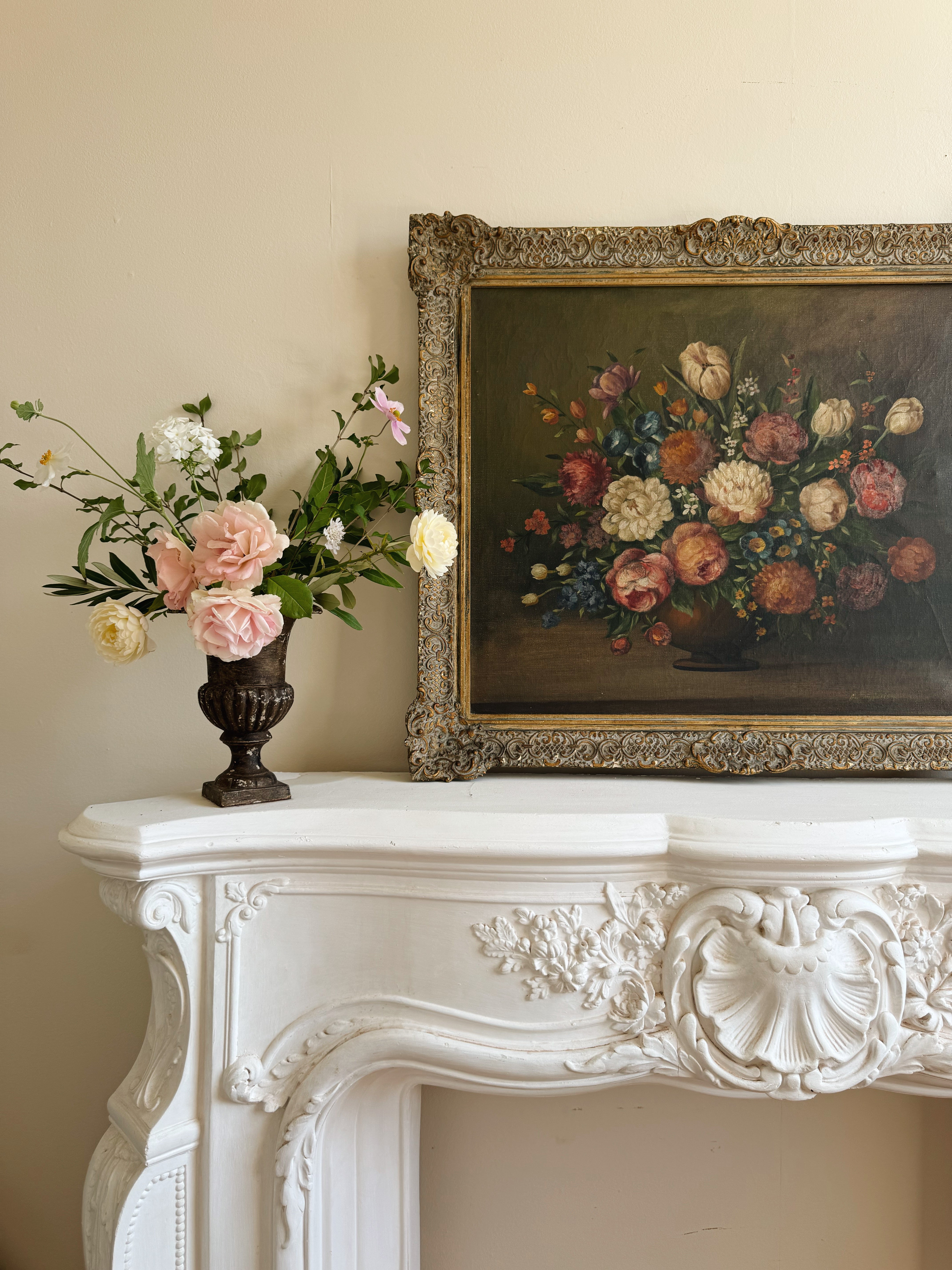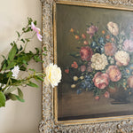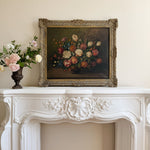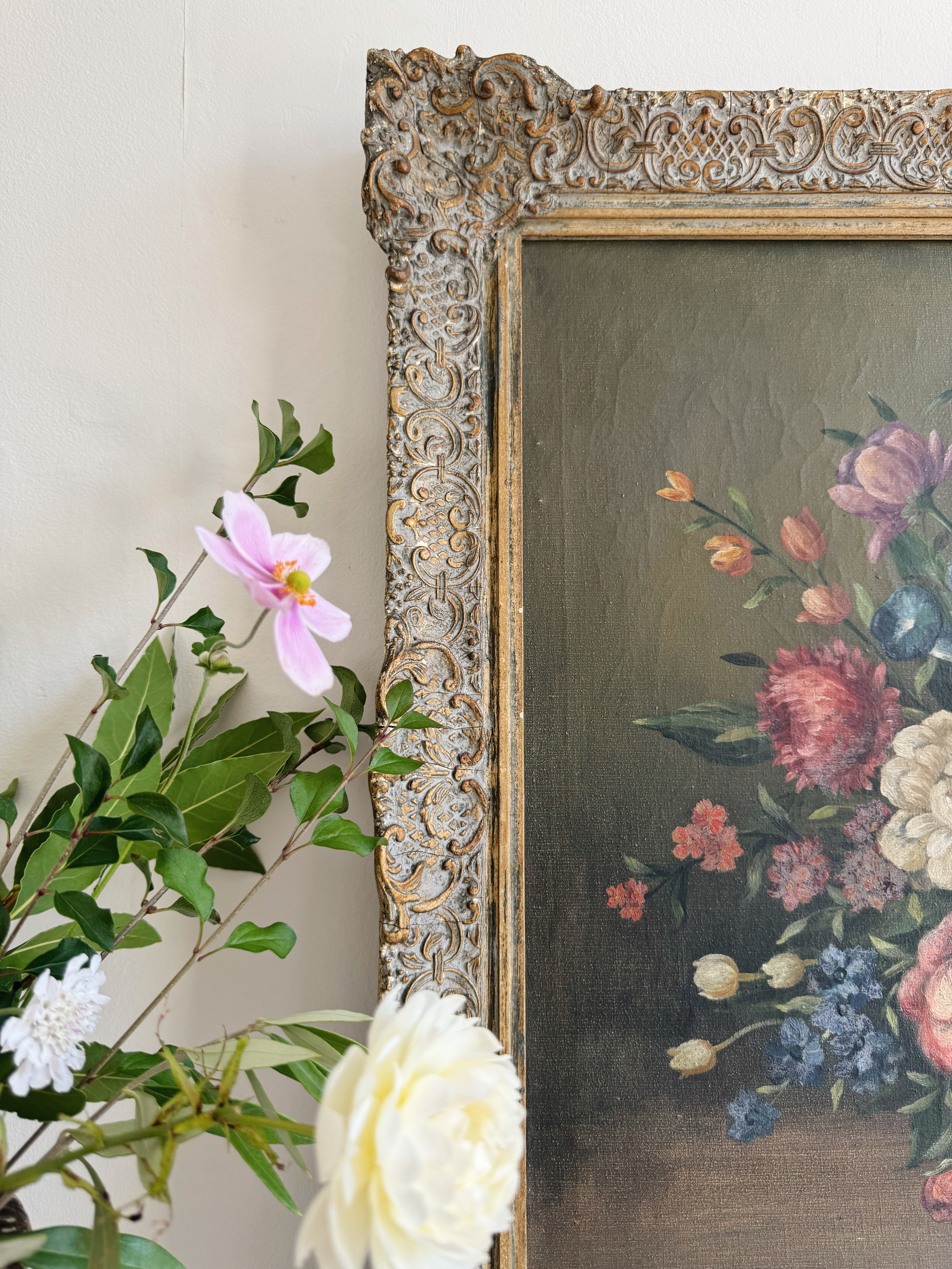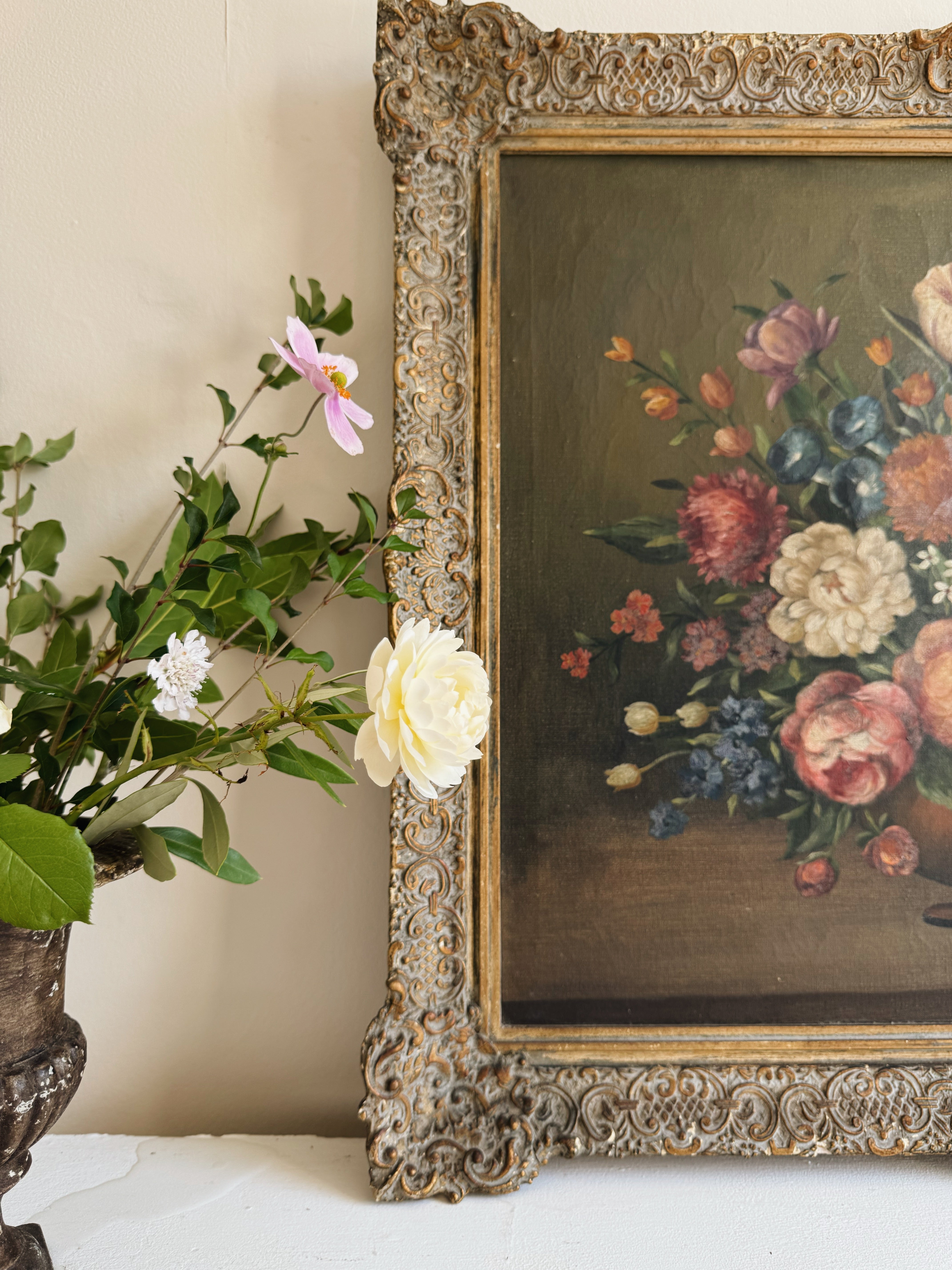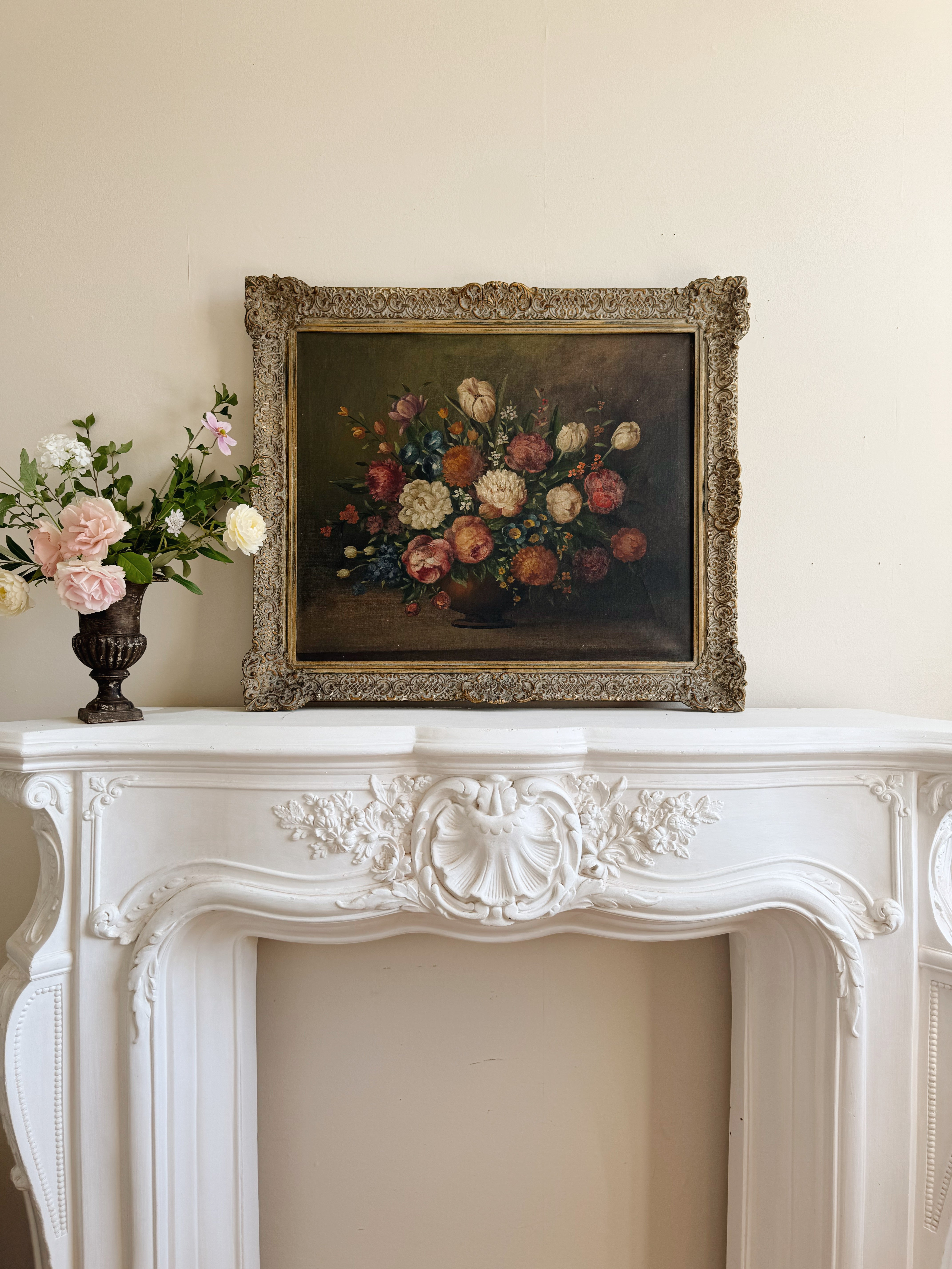 An opulent vintage floral oil painting on canvas, abundant with peonies, tulips, roses, and wildflowers gathered in a classical urn. The artist has captured every petal with sumptuous colour and depth  with soft creams, vivid carmines, dusky pinks, and touches of blue arranged against a dark, moody ground in the grand tradition of the Dutch Masters.