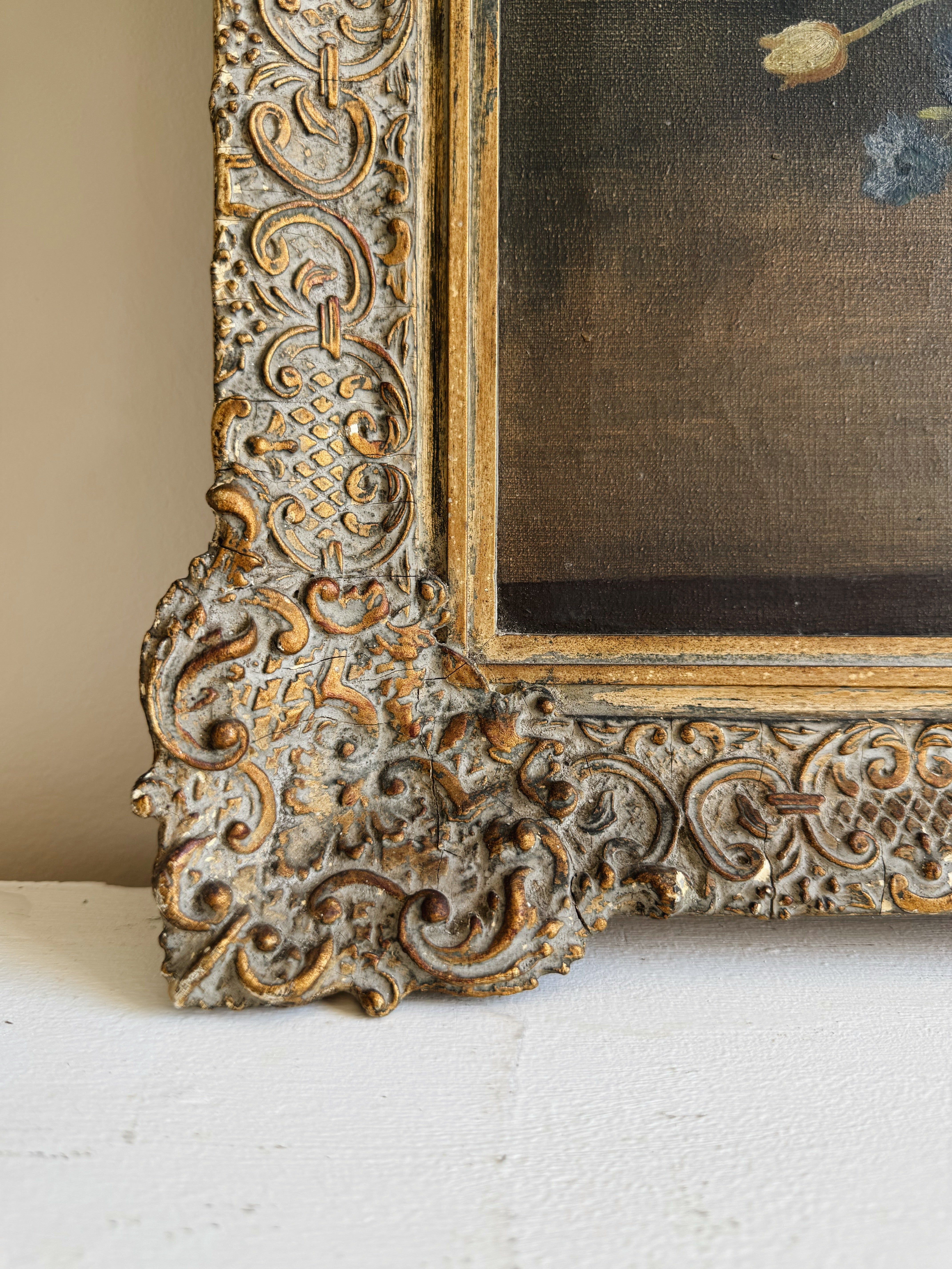 The painting is housed in an ornate carved gilt frame, richly patinated with time, which enhances the painting’s sense of drama and elegance. At 75 × 63 cm, this is a statement piece with true presence, perfect above a mantel, in a dining room, or as the anchor to a gallery wall.
