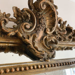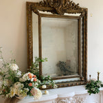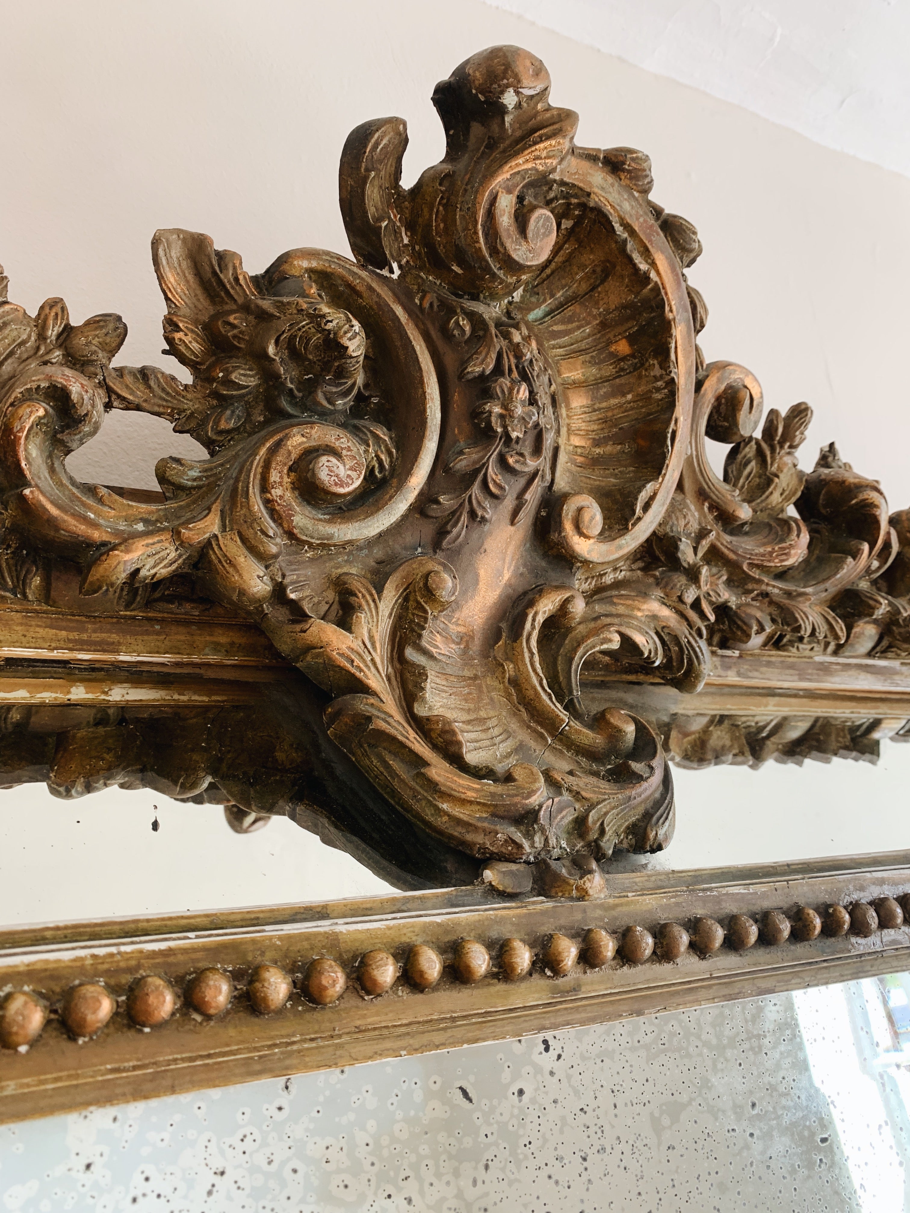 This 19th century mirror has an intricately carved gilt wood frame with a majestic botanical design at the top in gesso plaster. The original mercury mirrors feature some beautifully stunning foxing that really make this piece stand out.
