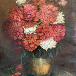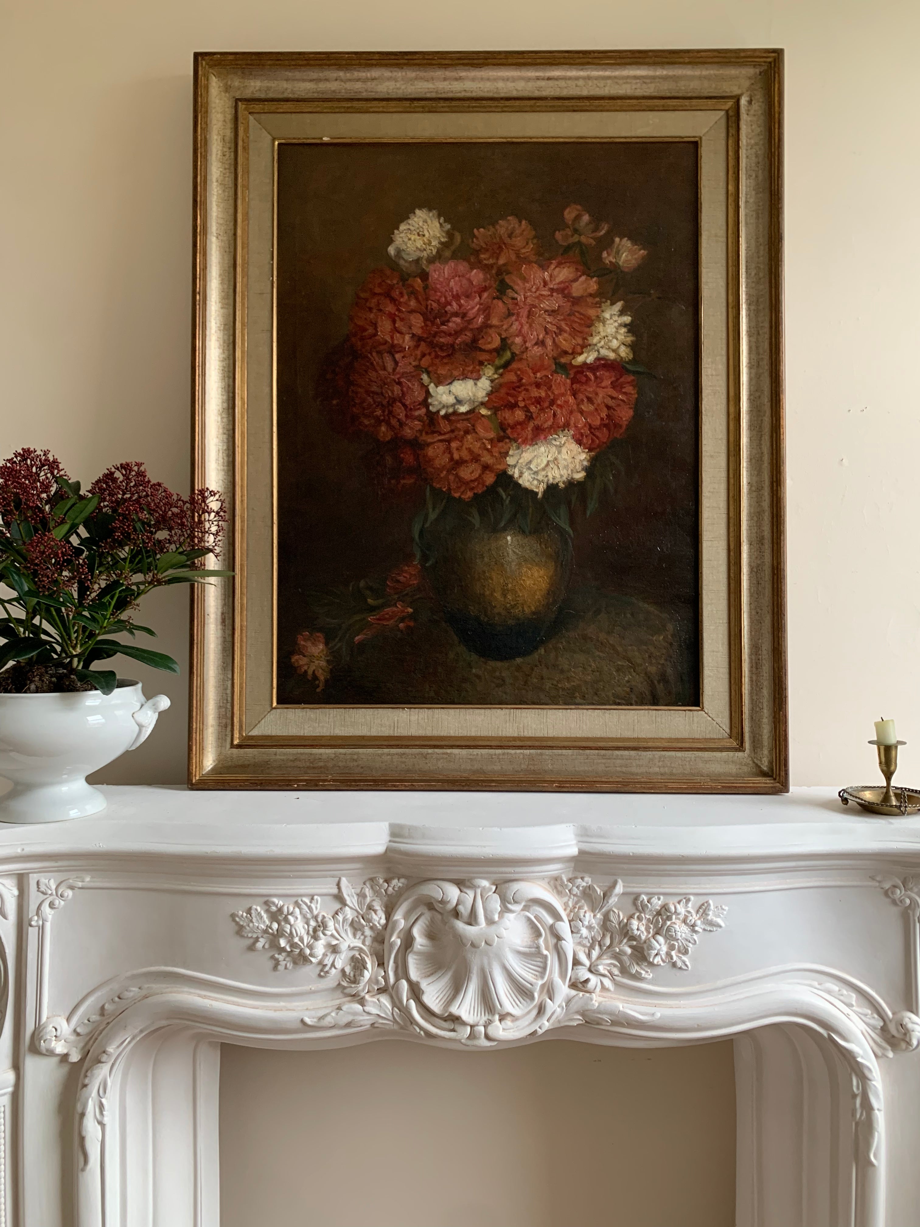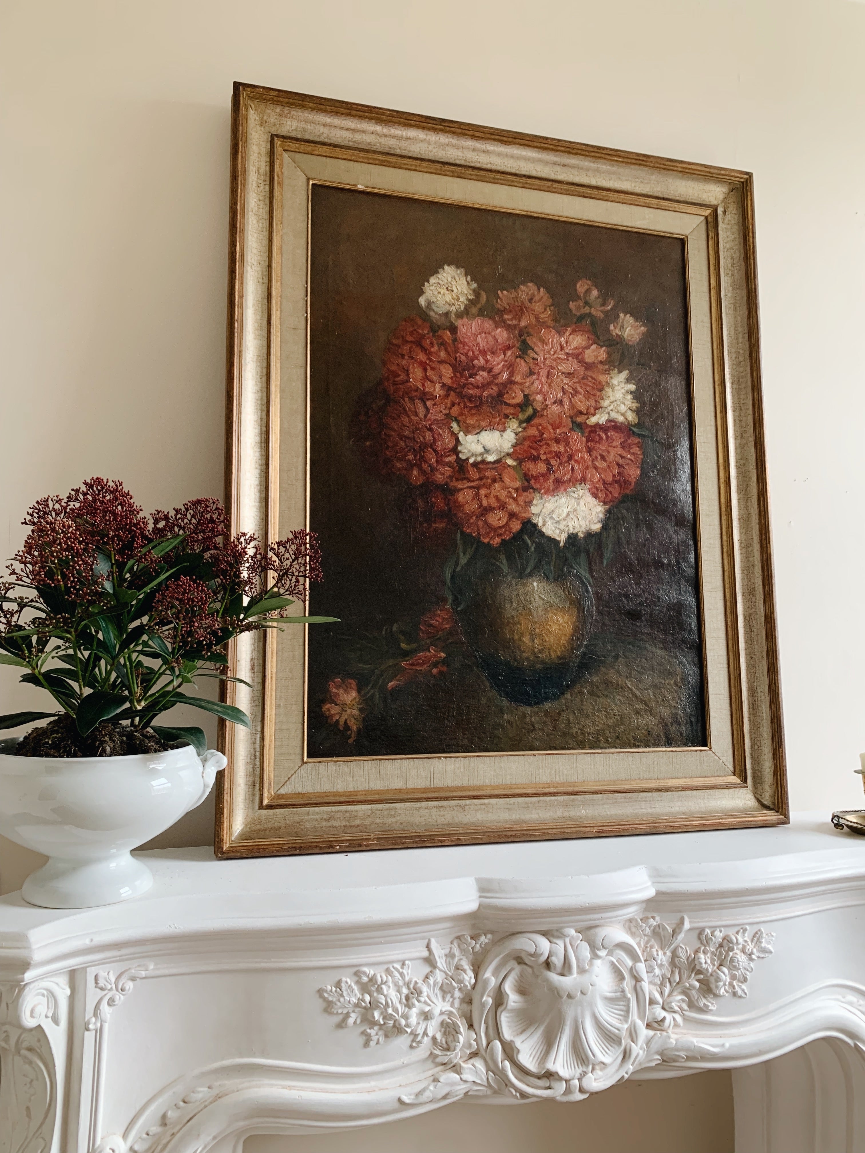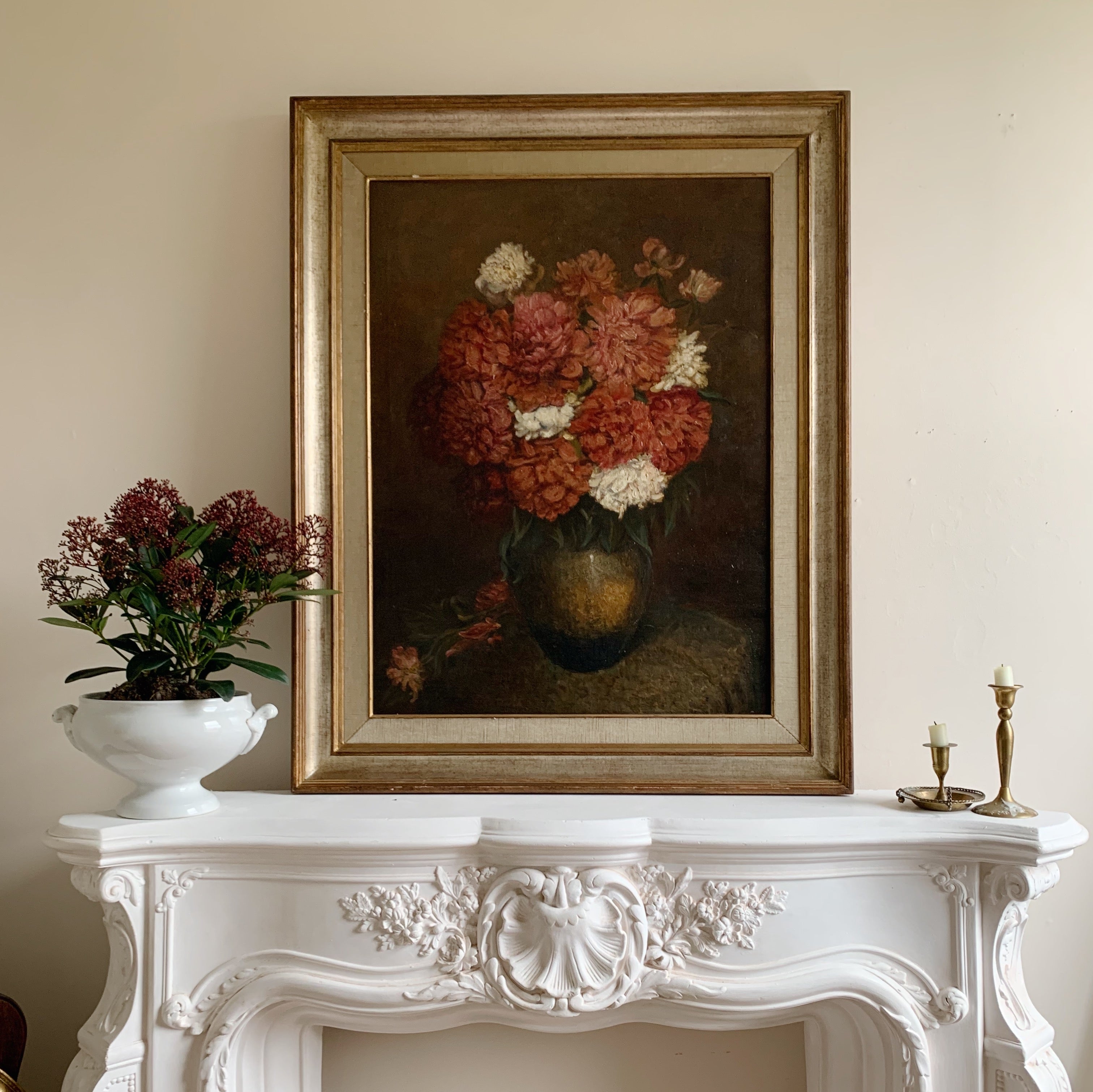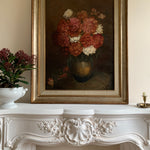 This vintage painting circa 1940's comes directly from France and is in excellent condition. The painting depicts deep pinky red floral blooms in a vase and sits within it’s original solid wood frame.