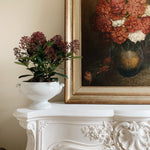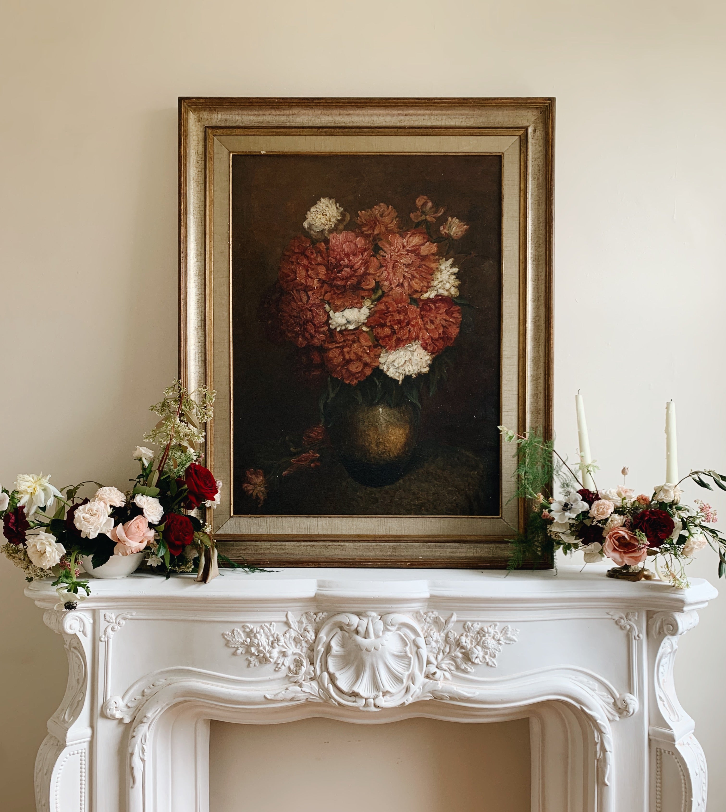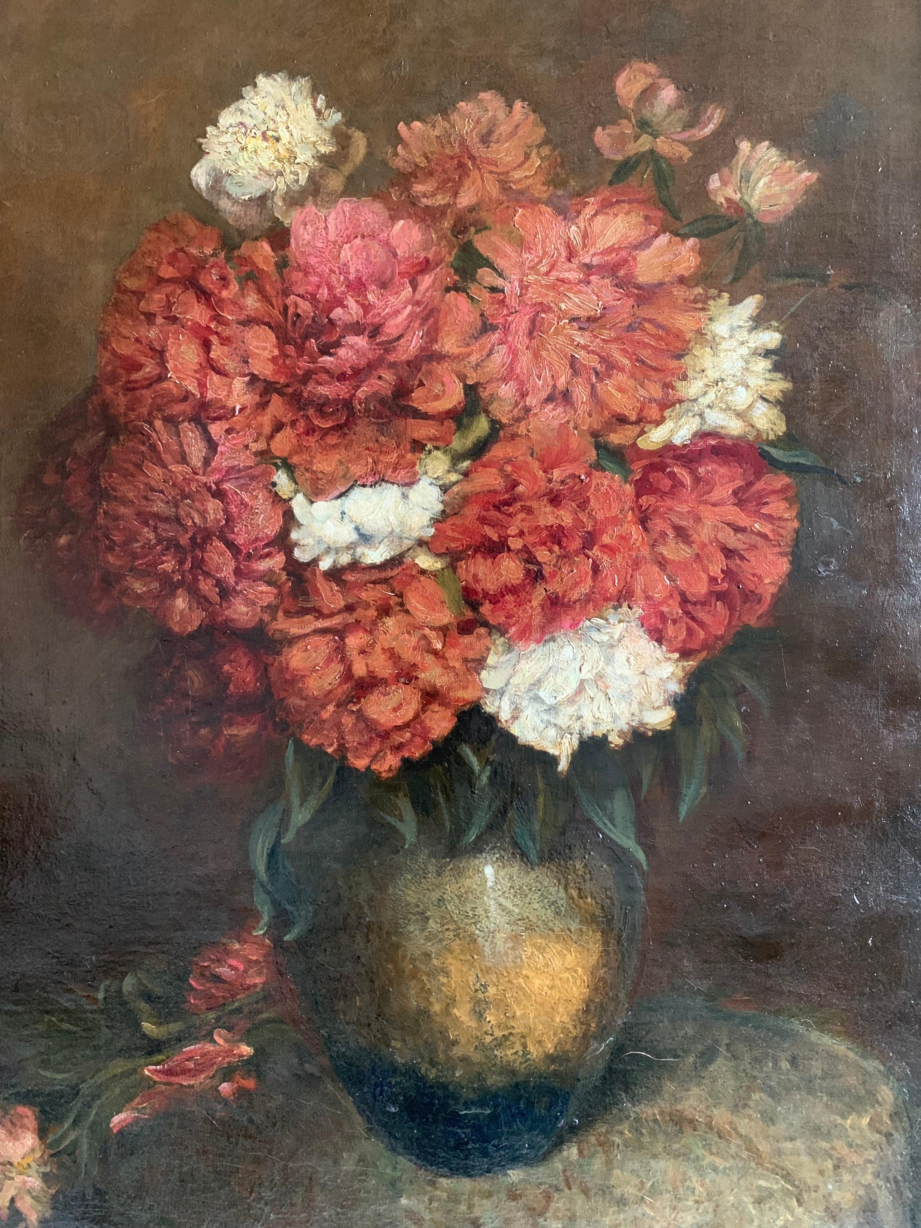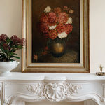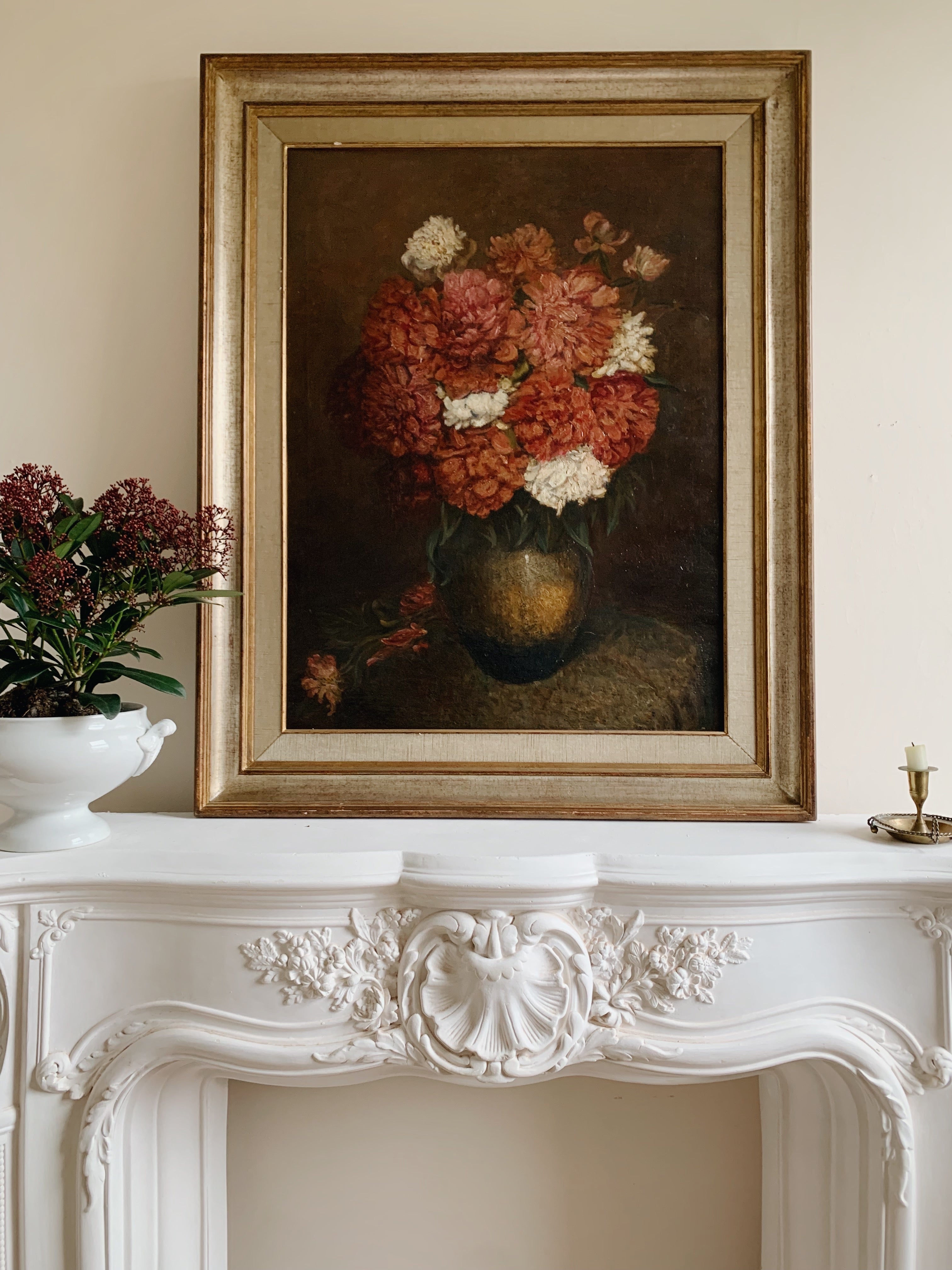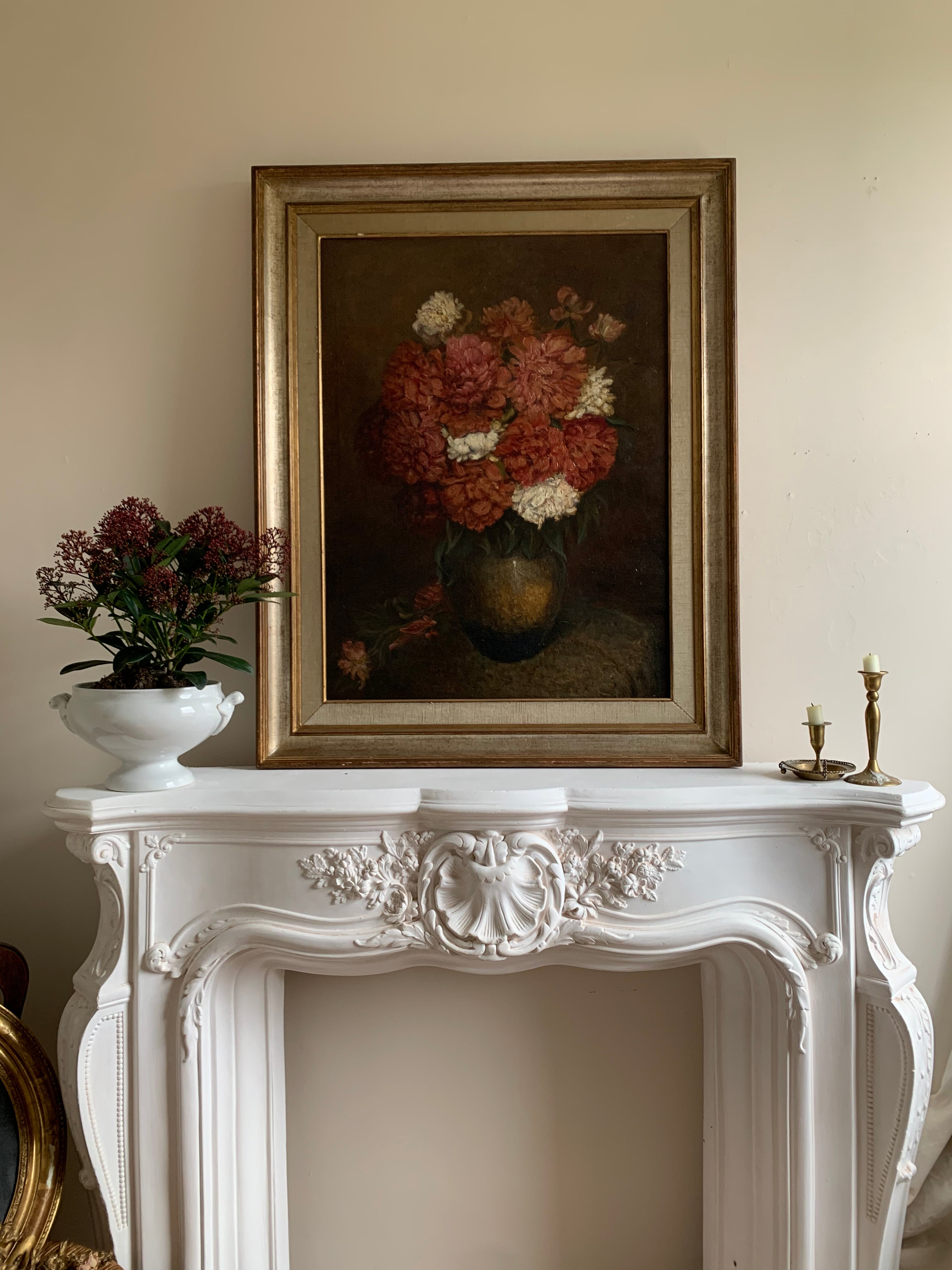 This vintage painting circa 1940's comes directly from France and is in excellent condition. The painting depicts deep pinky red floral blooms in a vase and sits within it’s original solid wood frame.