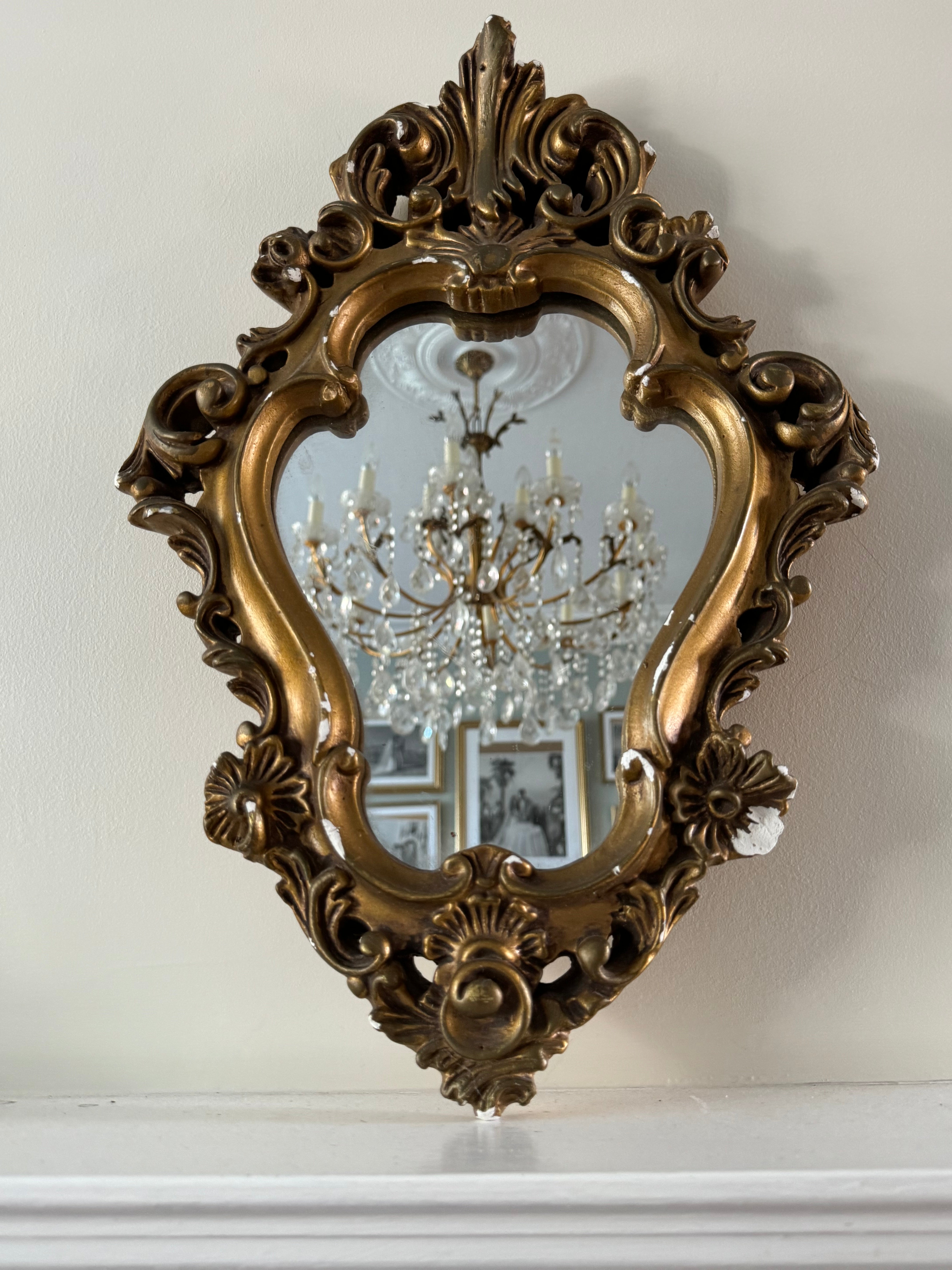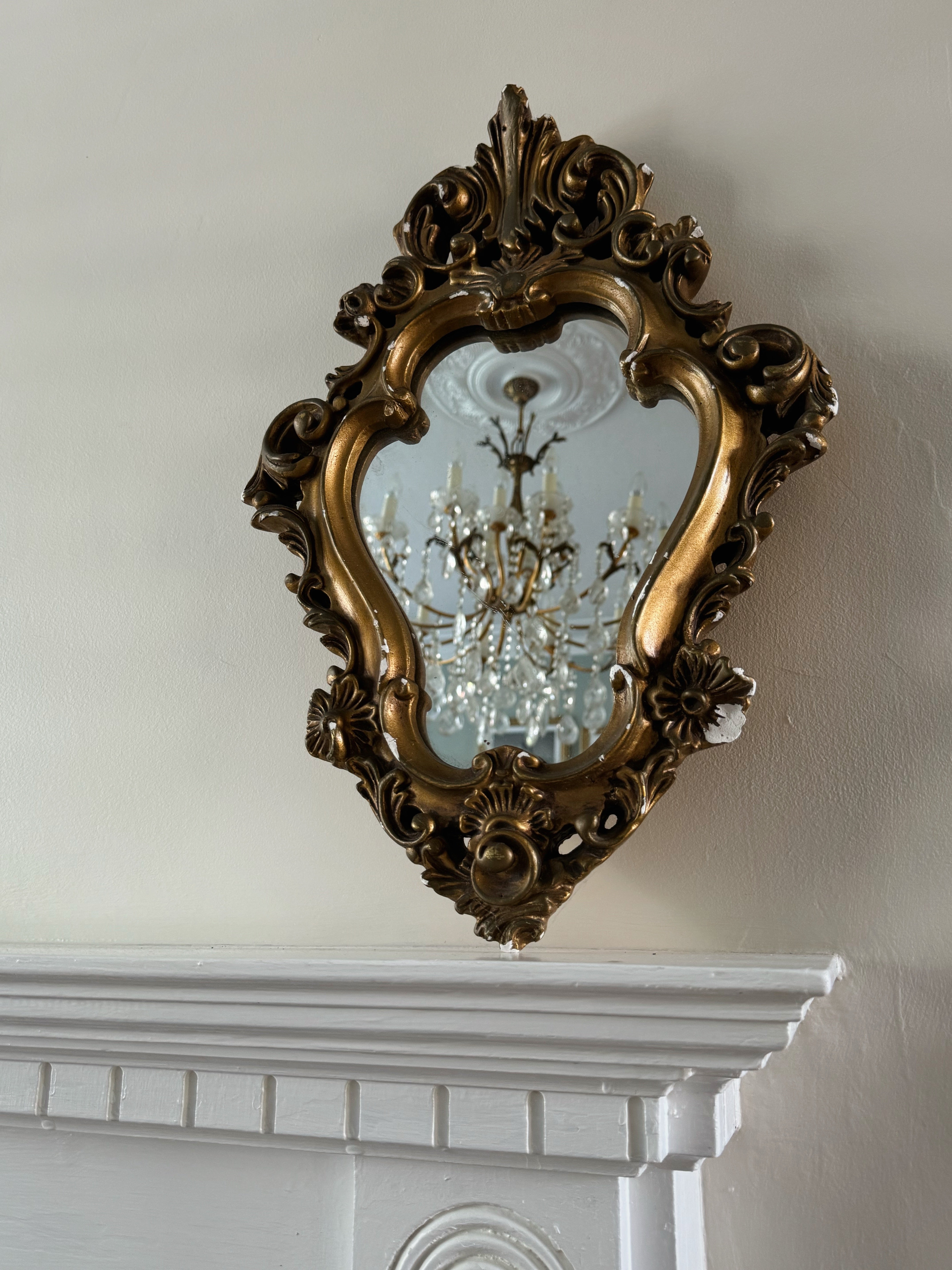 A petite vintage baroque style mirror with floral motif.  Made from painted gesso plaster, this decorative piece has lots of wear with chips to the frame where the plaster shows through for a look a faded glamour.
