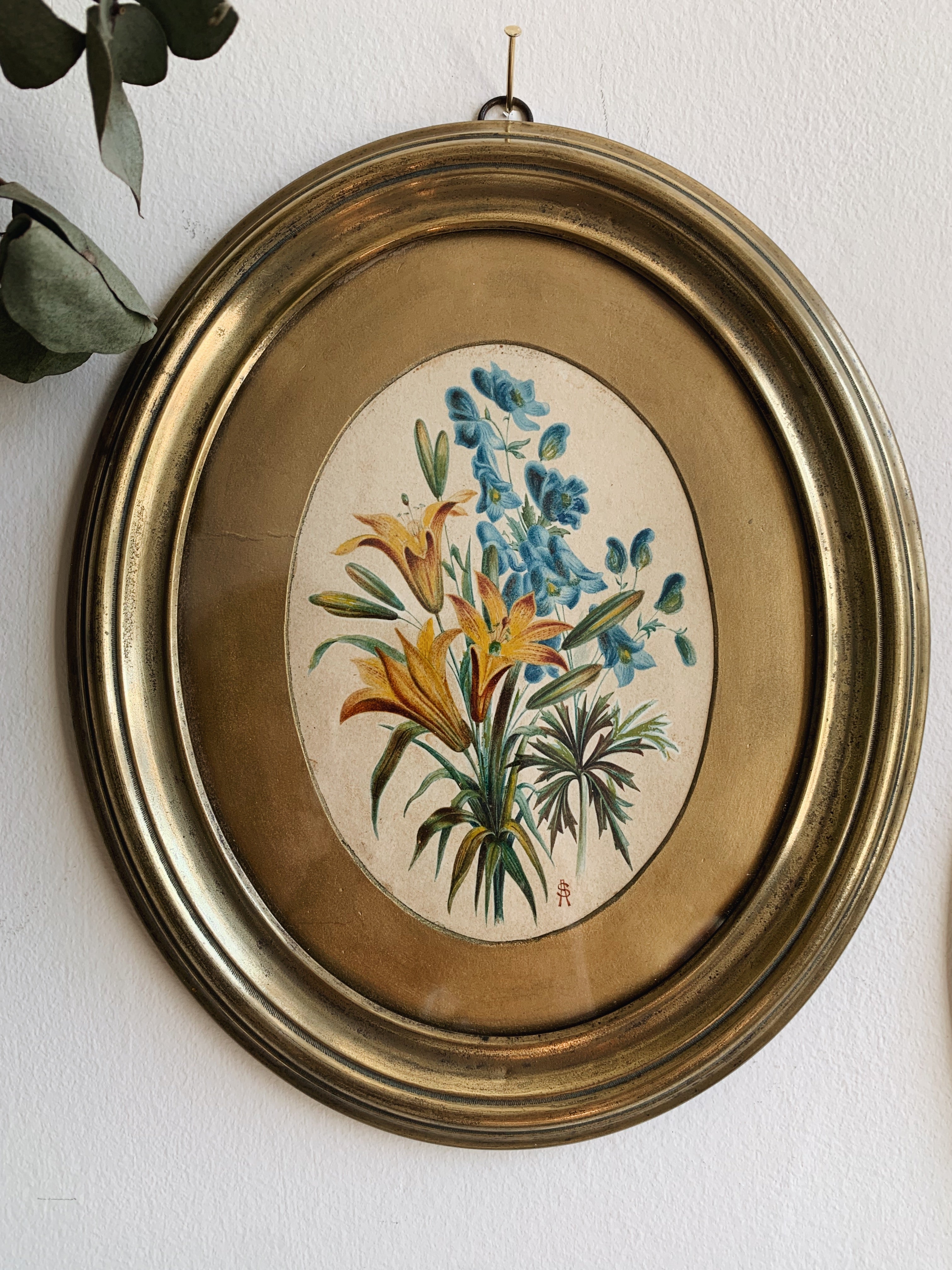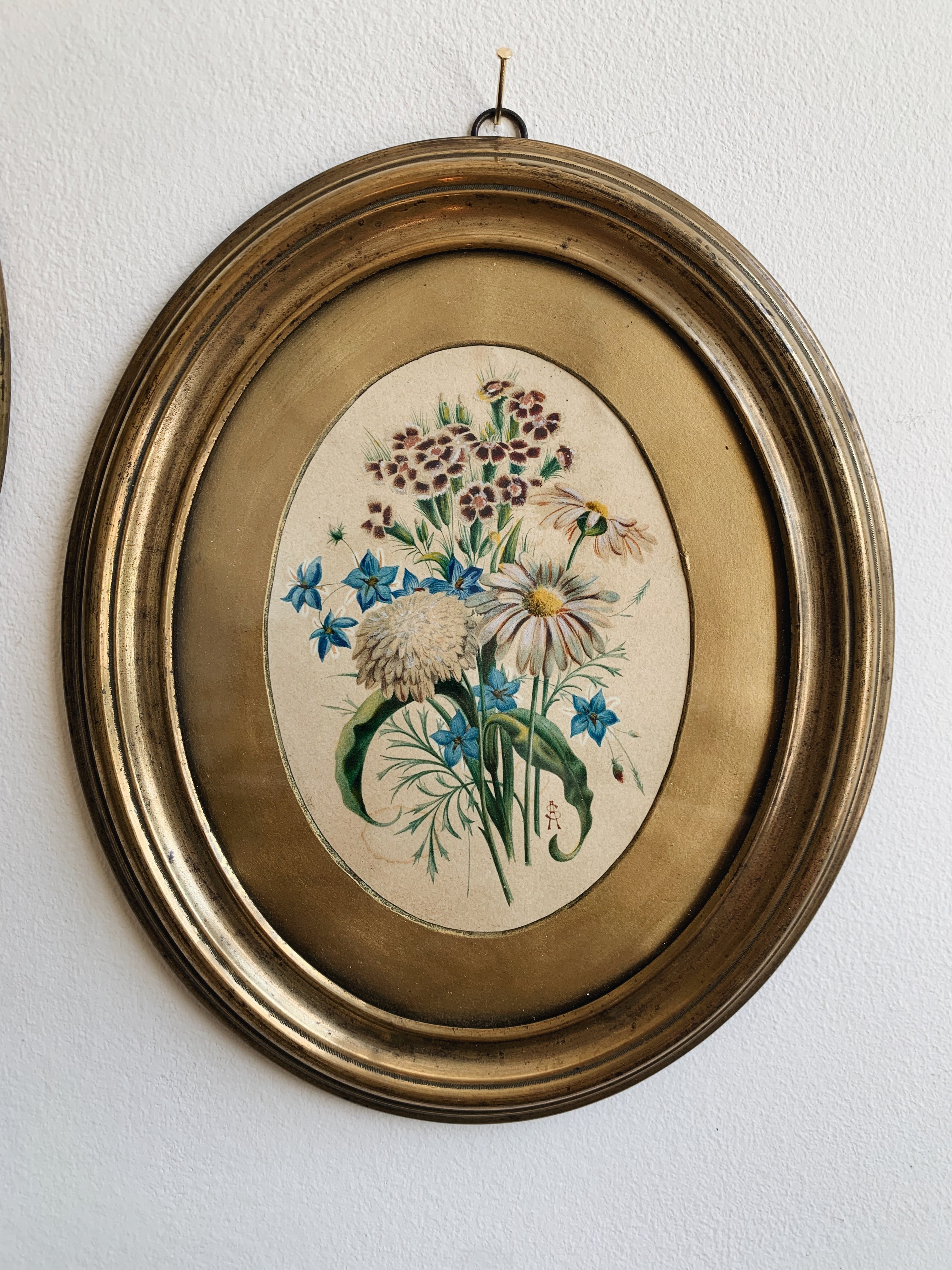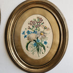 2 sweet little complementary  19th century oval watercolor paintings in gold frame.