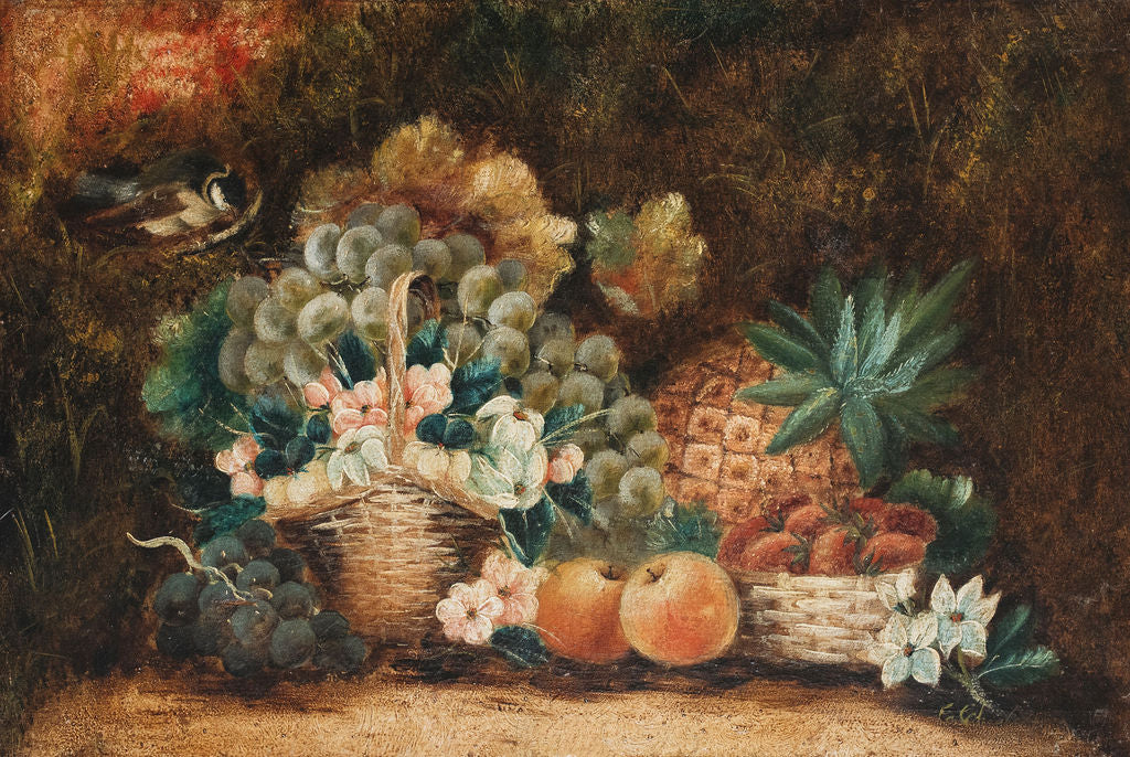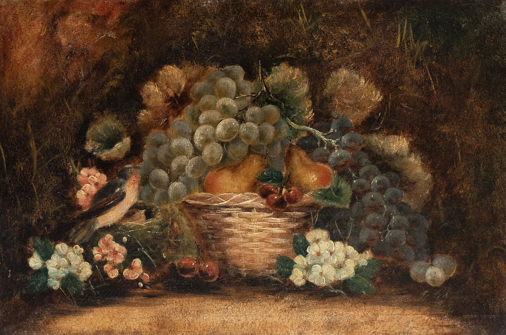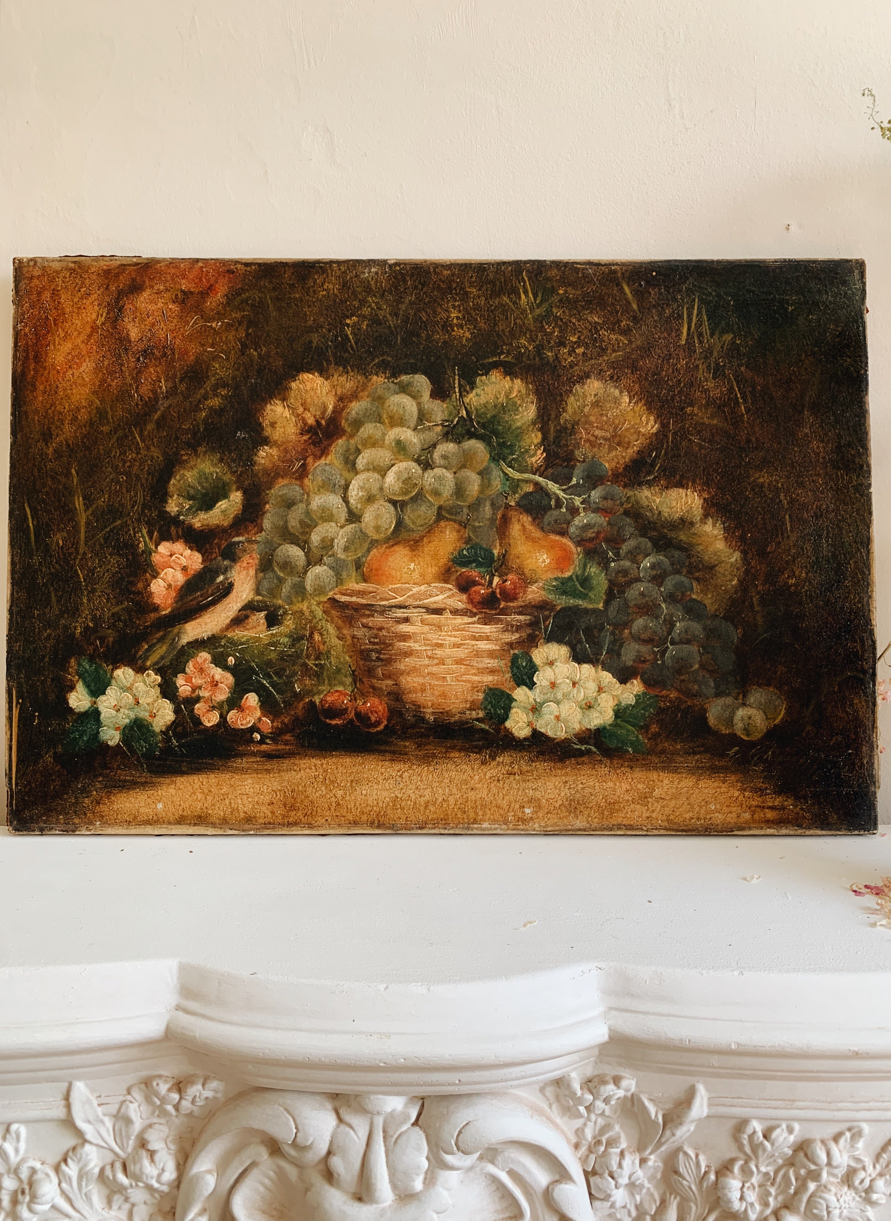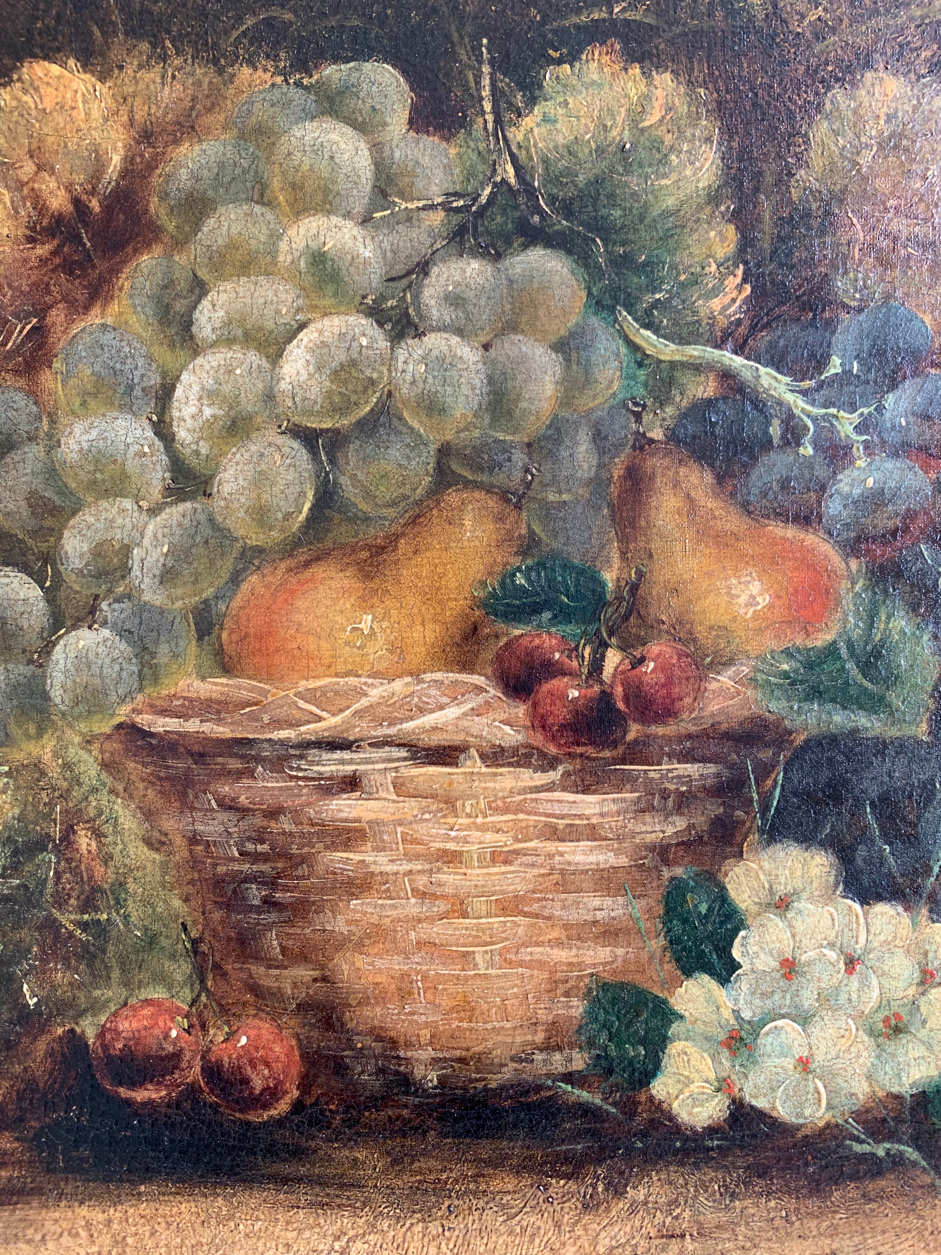The paintings are oil on canvas and depict bounties of fruit and flowers overflowing from baskets, with enchanting little birds looking eagerly on. The paintings could be hung as they are or framed.