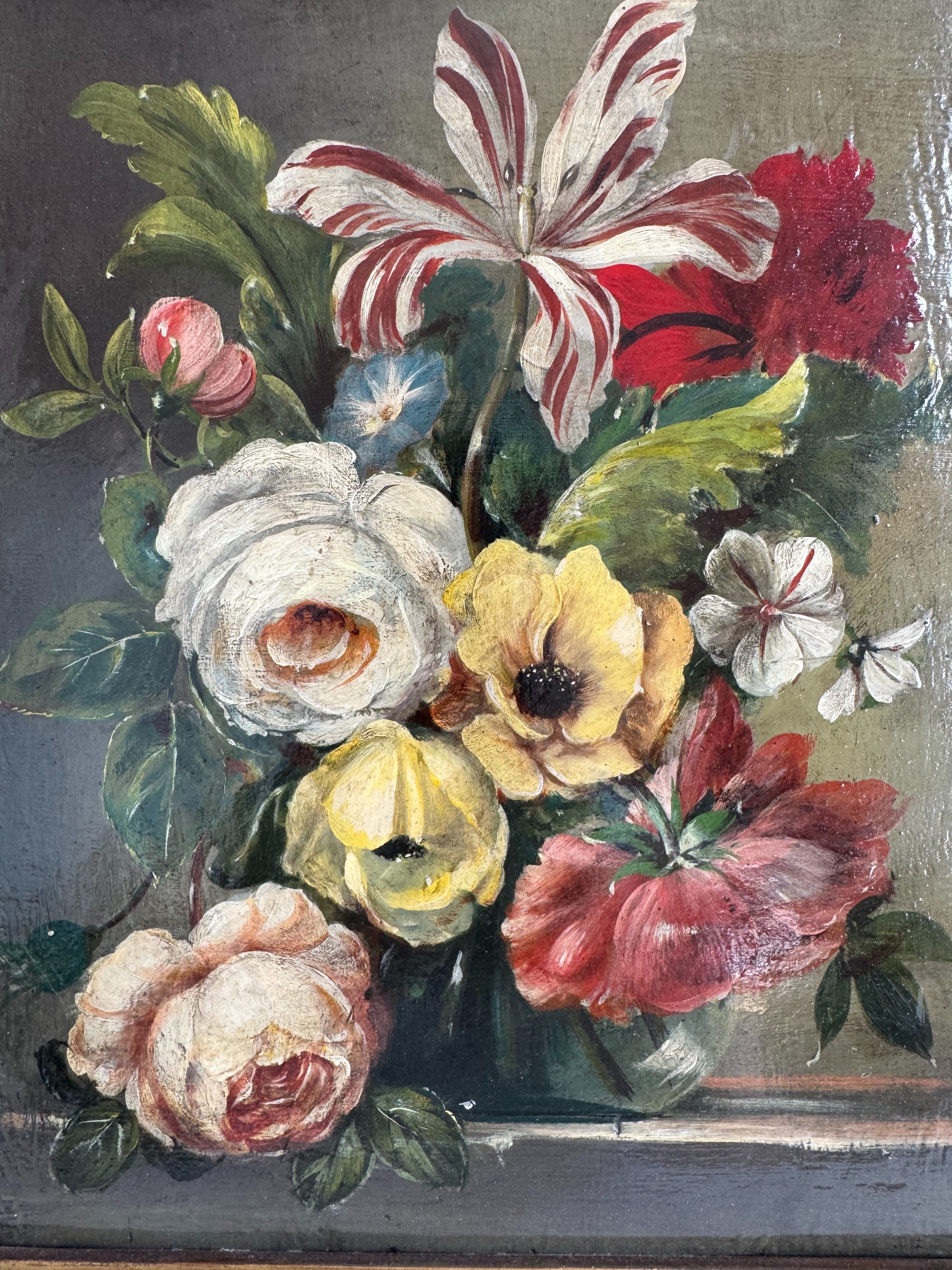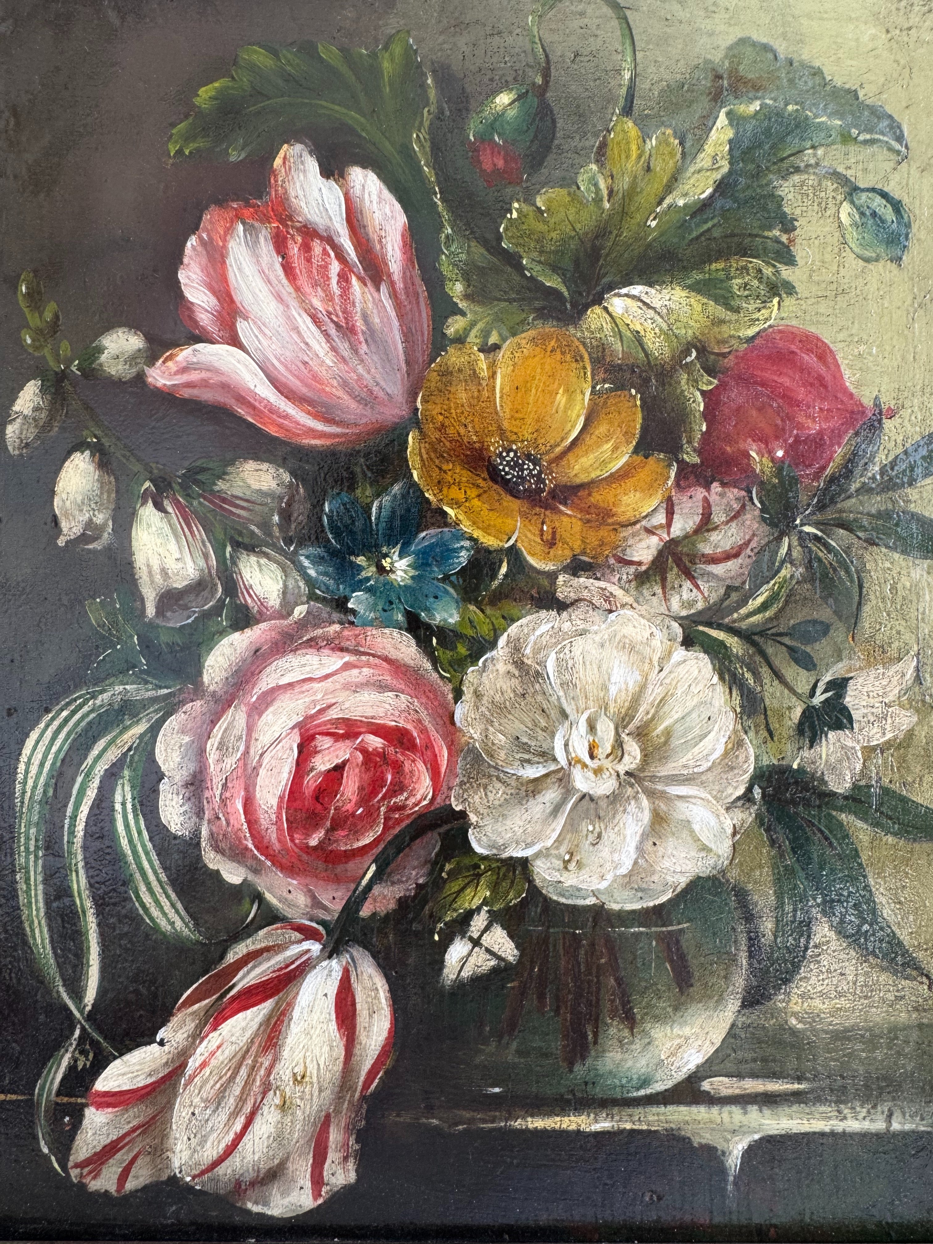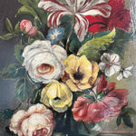 A rare pair of vintage floral still life oil paintings, exquisitely rendered in the manner of the Old Dutch Masters. Beautiful blooms including striped tulips, velvet roses, golden anemones are captured in rich oils that bring depth and movement to every petal.