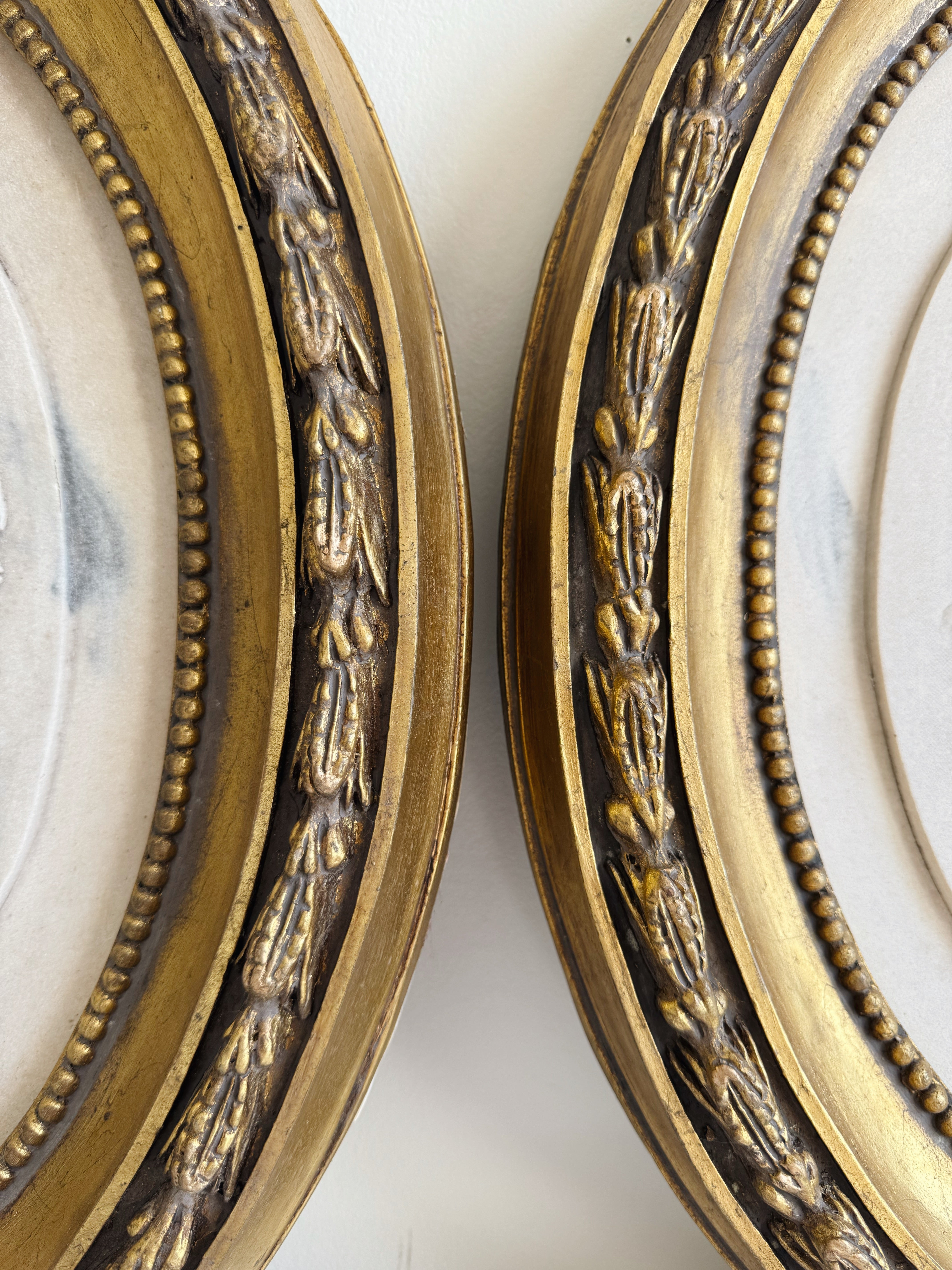 Presented in ornate gilt oval frames with beaded and floral mouldings, their soft patina enhances the sculptural detail and adds depth to the warm gold finish. Rare to find as a pair, these reliefs bring timeless grace and atmosphere, perfect displayed above a mantel, in a bedroom, or layered into a gallery wall.