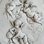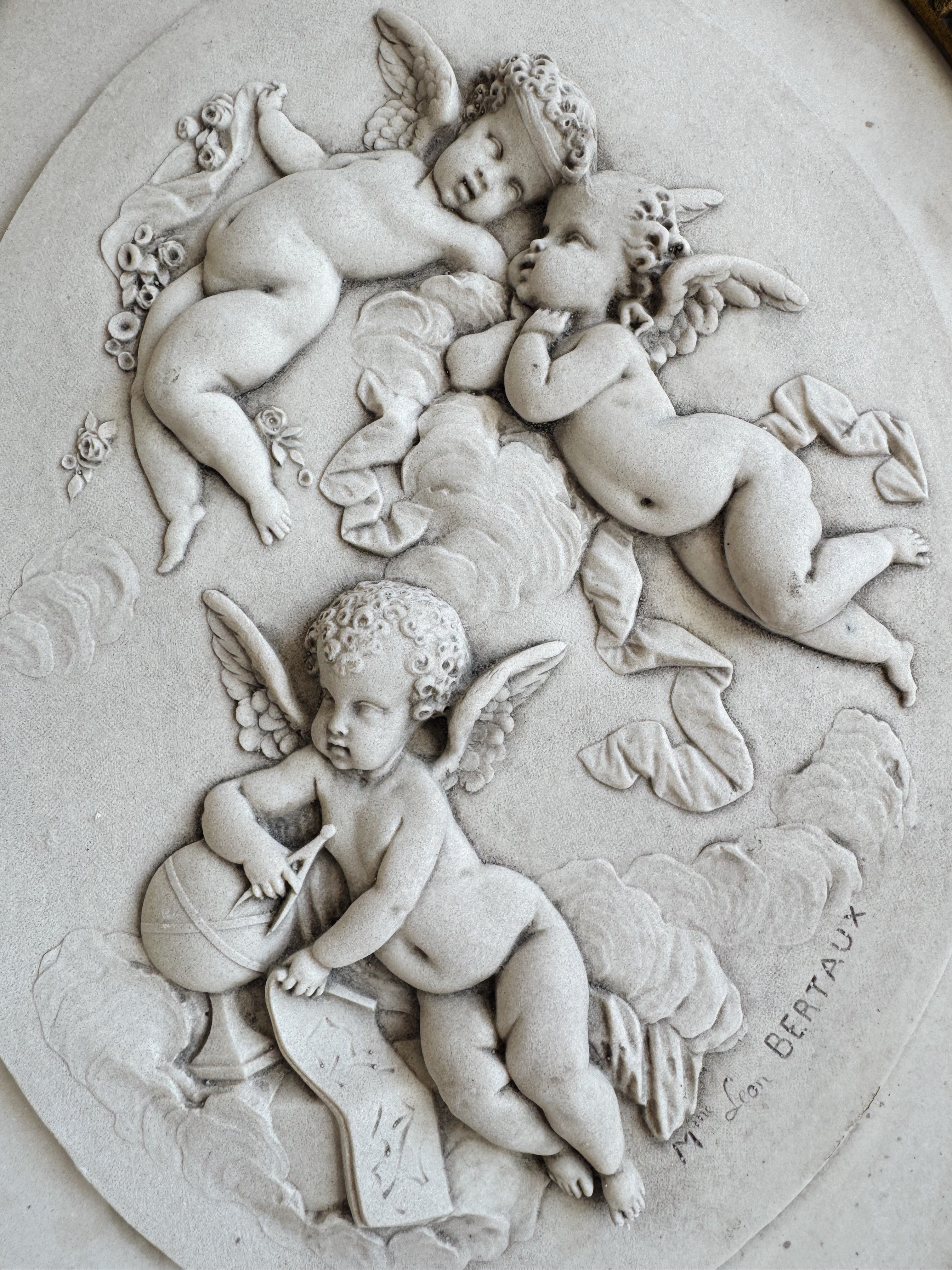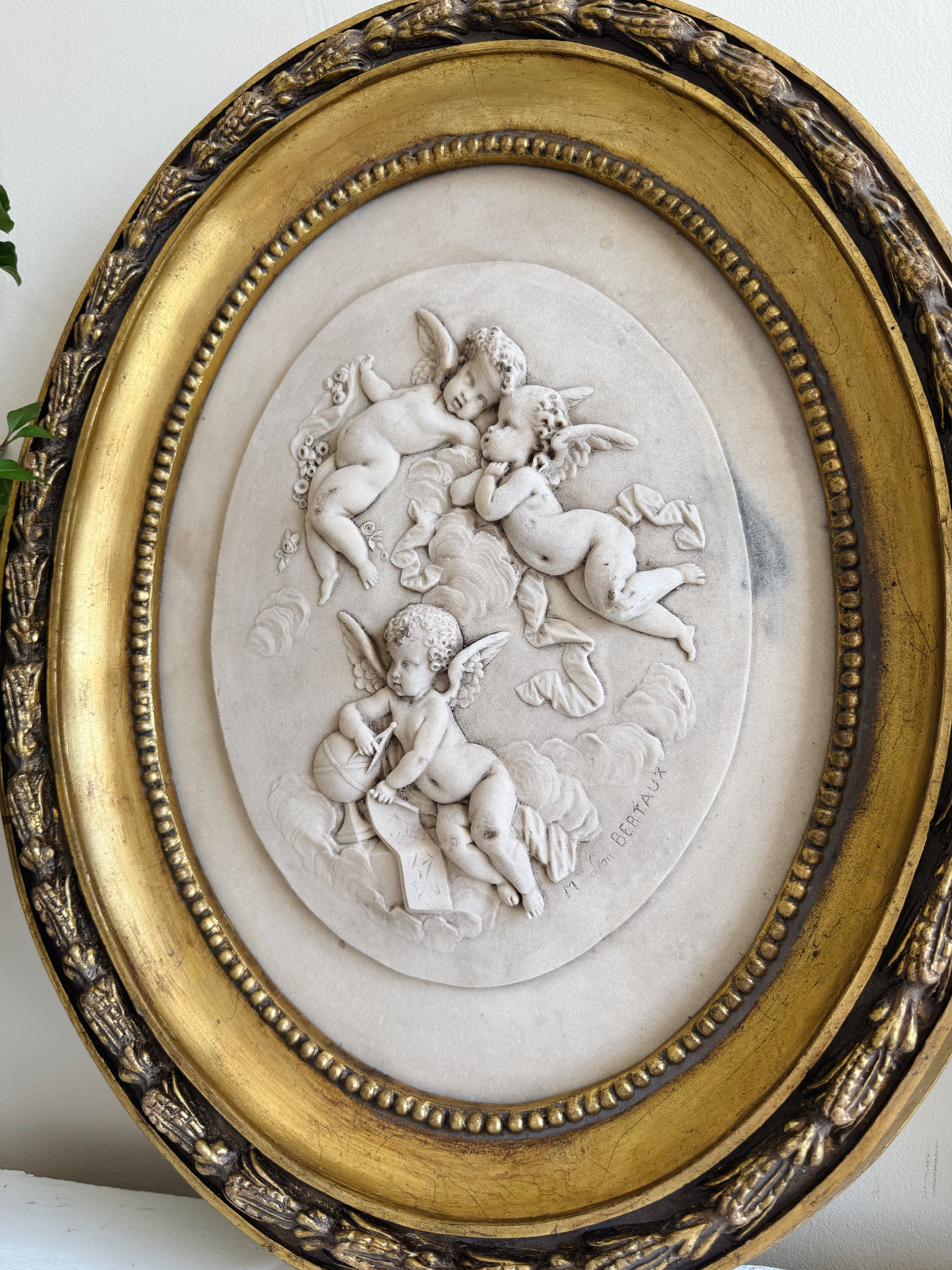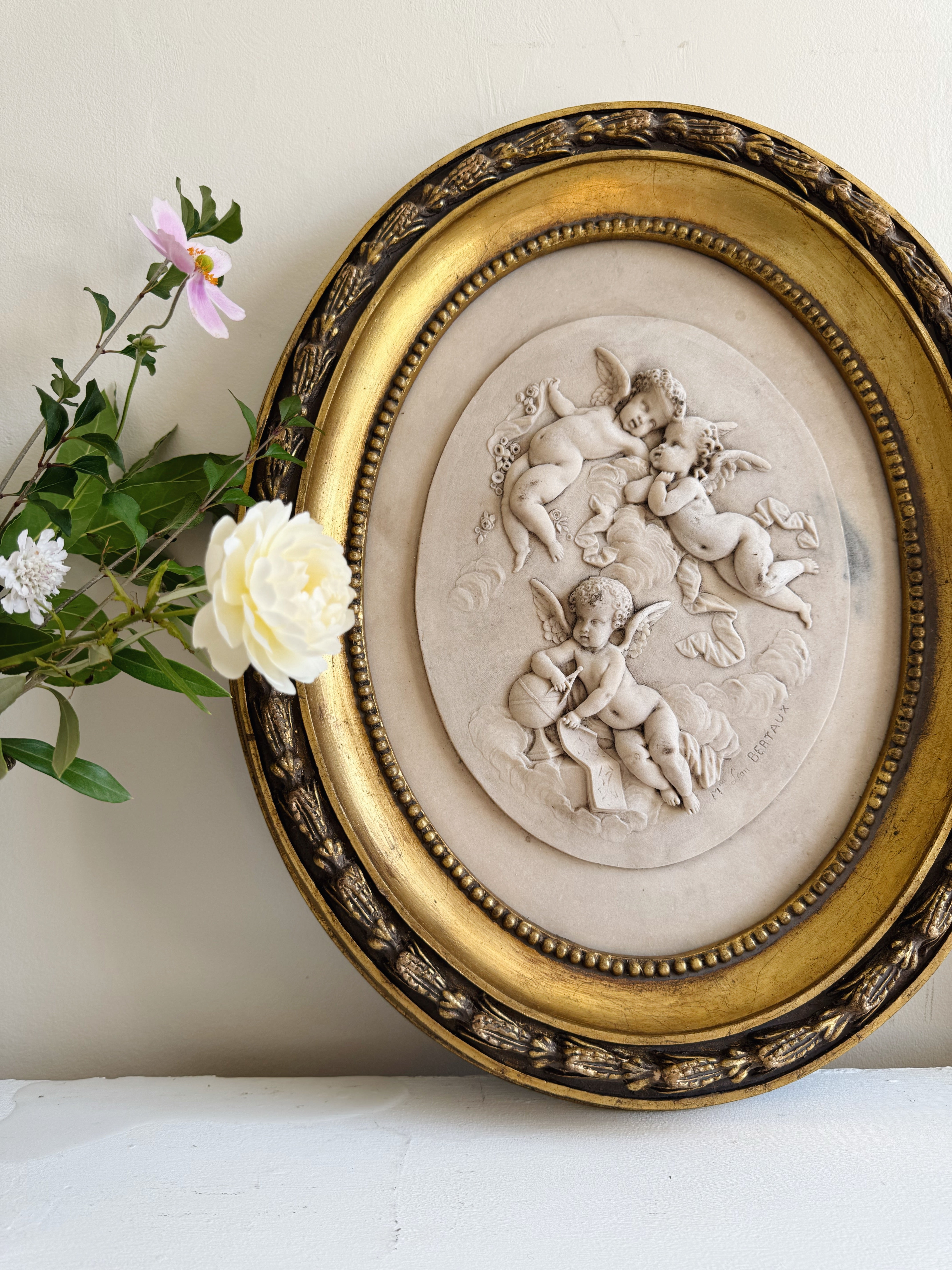 A celestial pair of vintage oval plaster reliefs, each delicately modelled with cherubic figures drifting amongst clouds, flowers, and ribbons. The scene, signed M. Bertaux, recalls the romance of 19th-century French neoclassical design, where art met the divine.