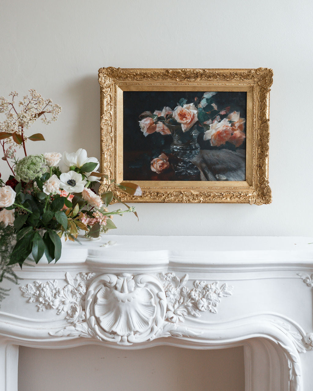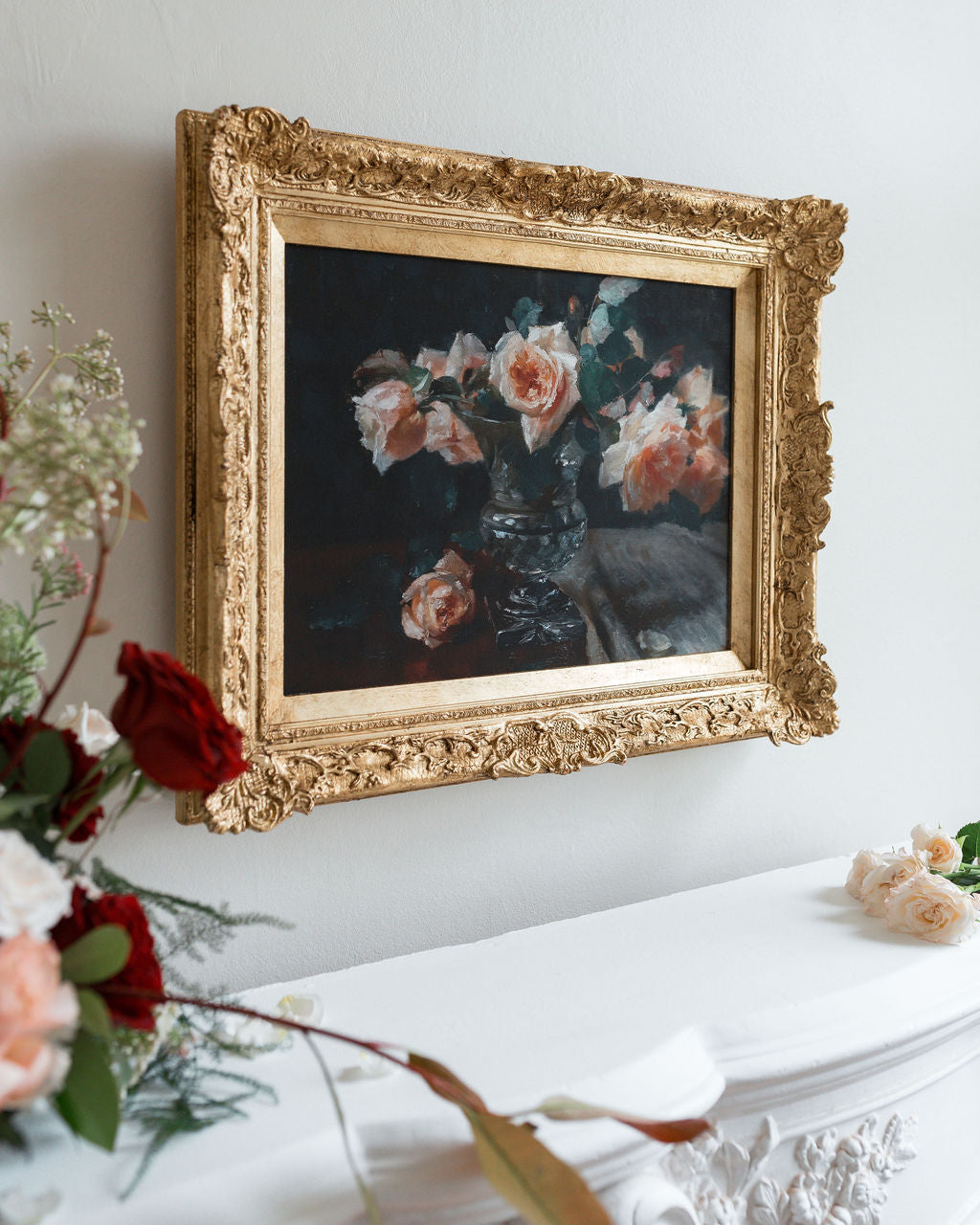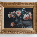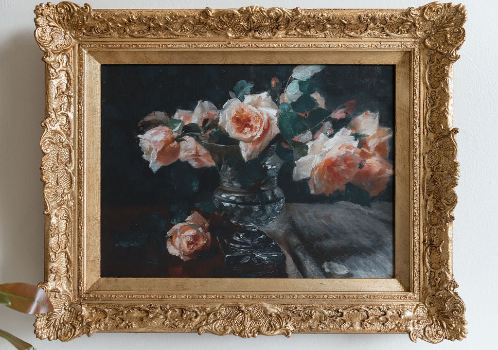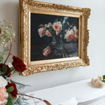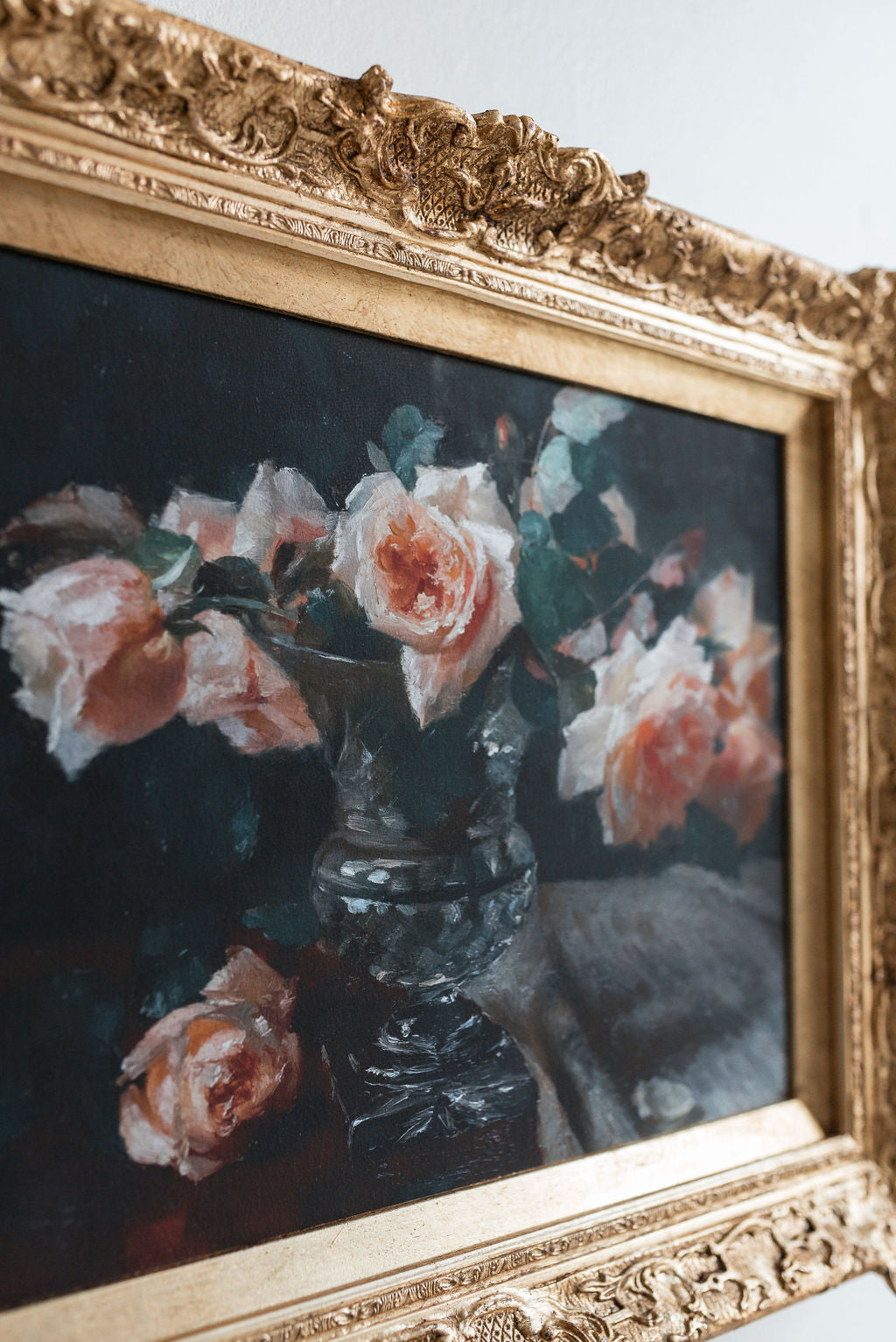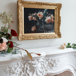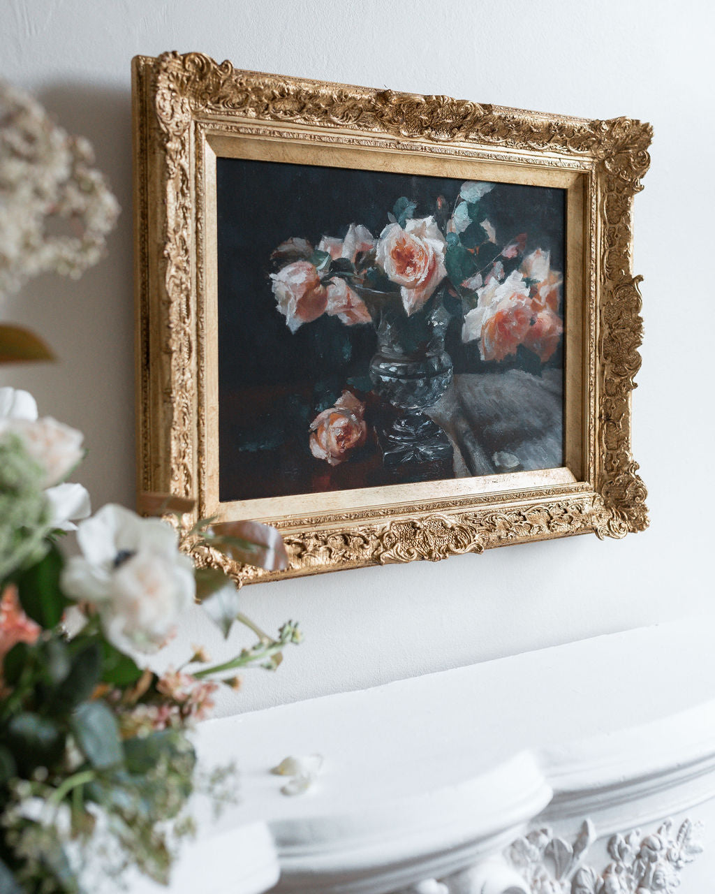 This captivating piece is a recreation of one of our most sought after antique oil paintings from the La Boheme archive and features wonderful pretty peach blooms in a resplendent handcrafted gilt frame.