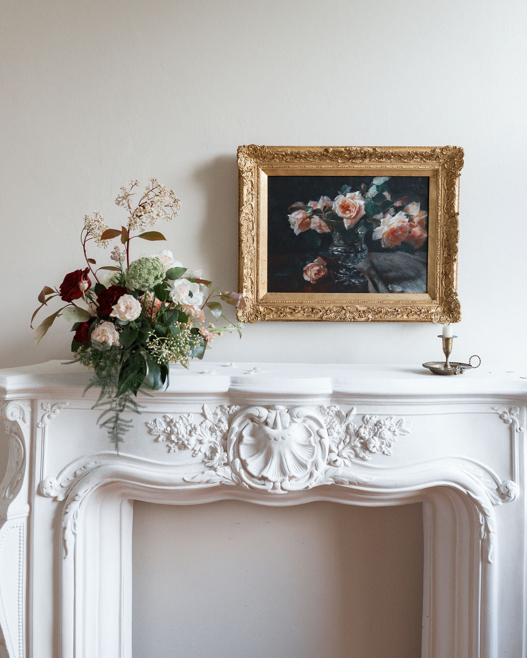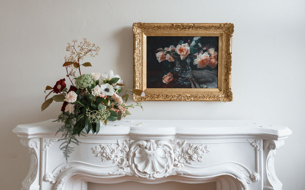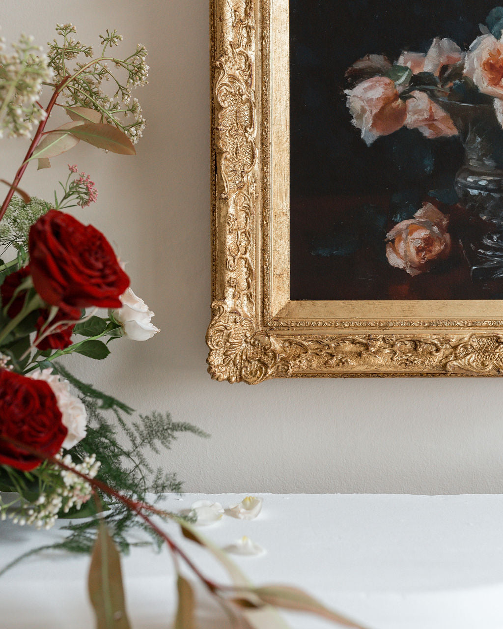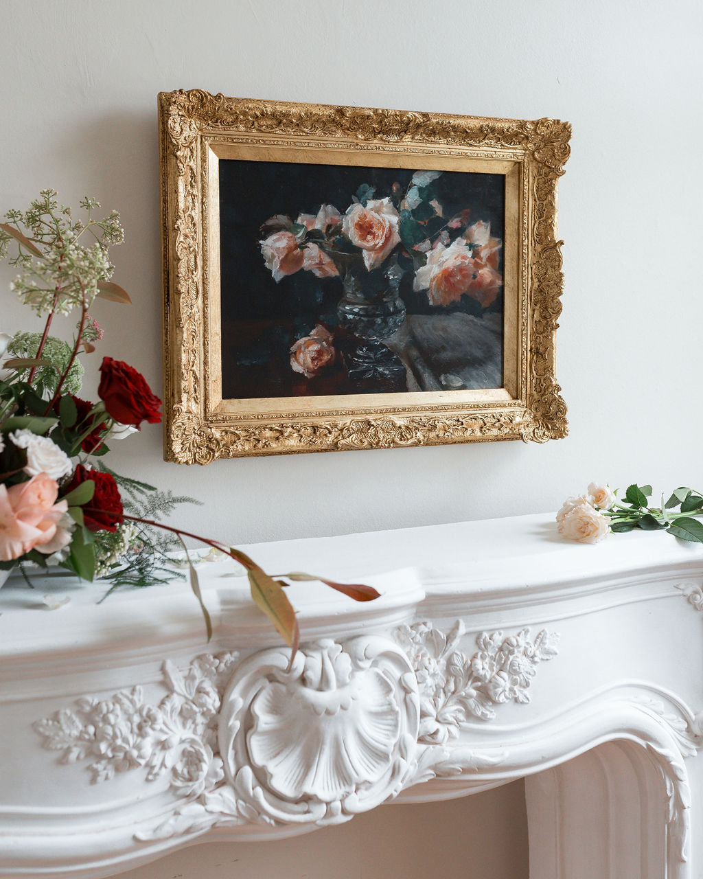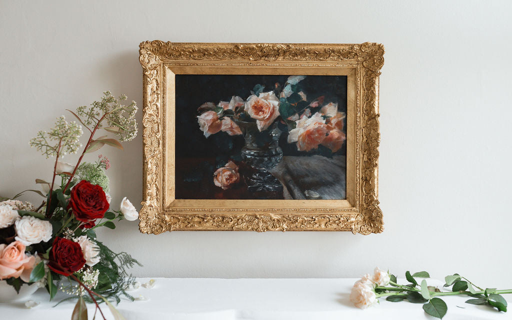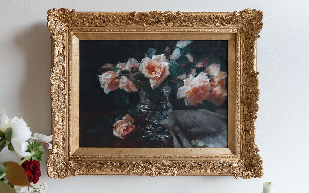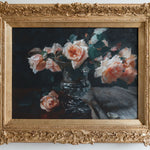 This captivating piece is a recreation of one of our most sought after antique oil paintings from the La Boheme archive and features wonderful pretty peach blooms in a resplendent handcrafted gilt frame.