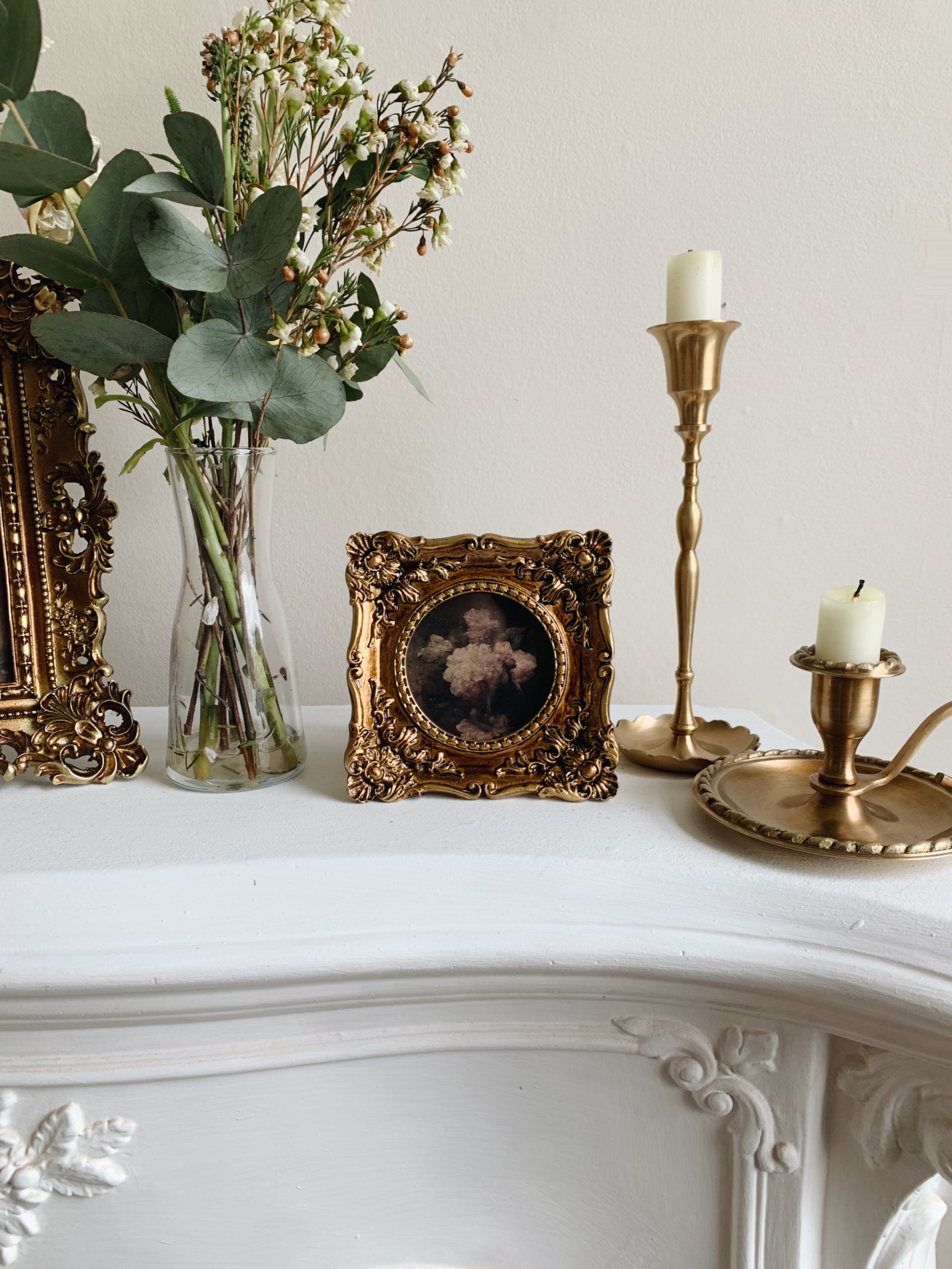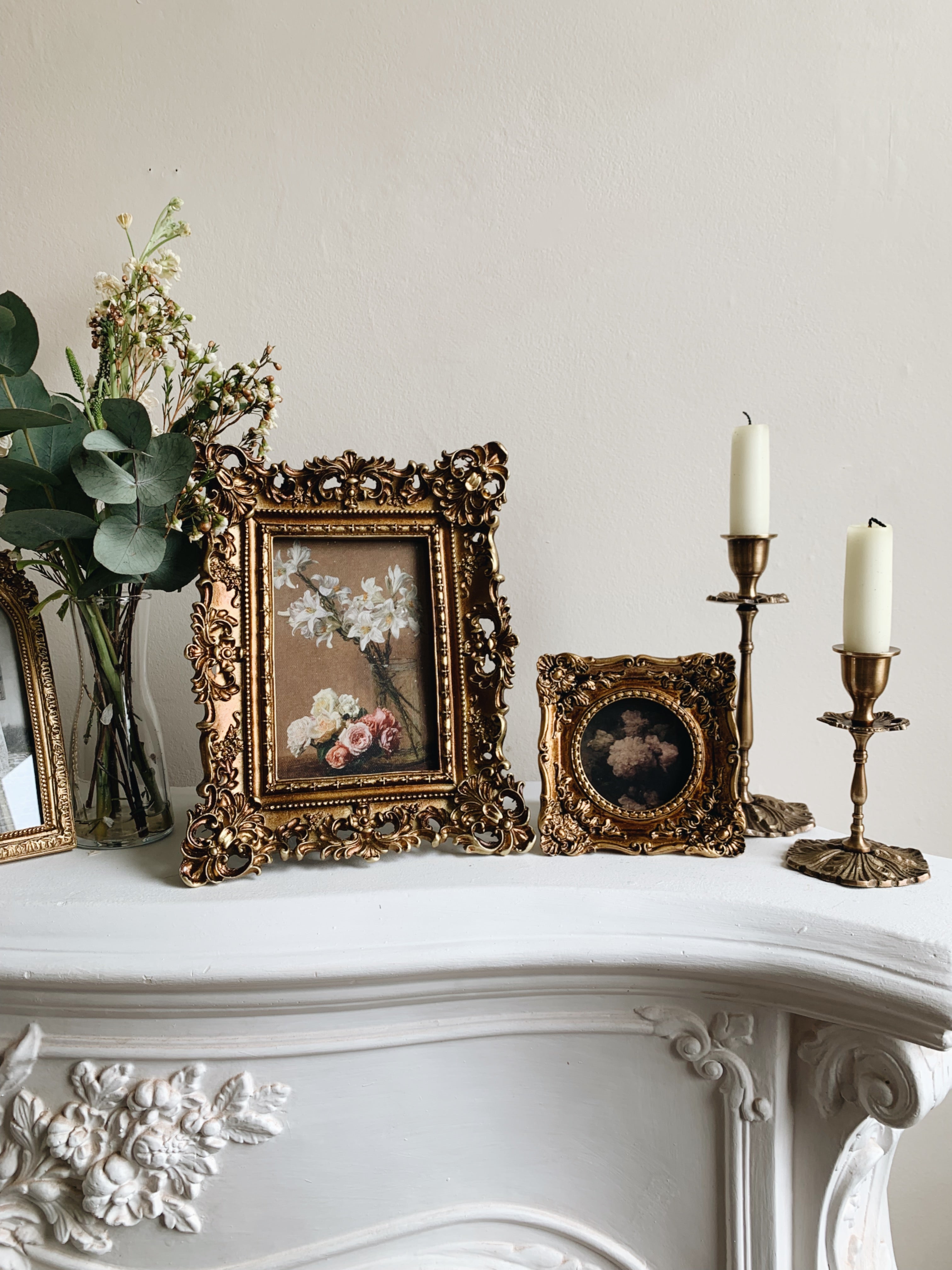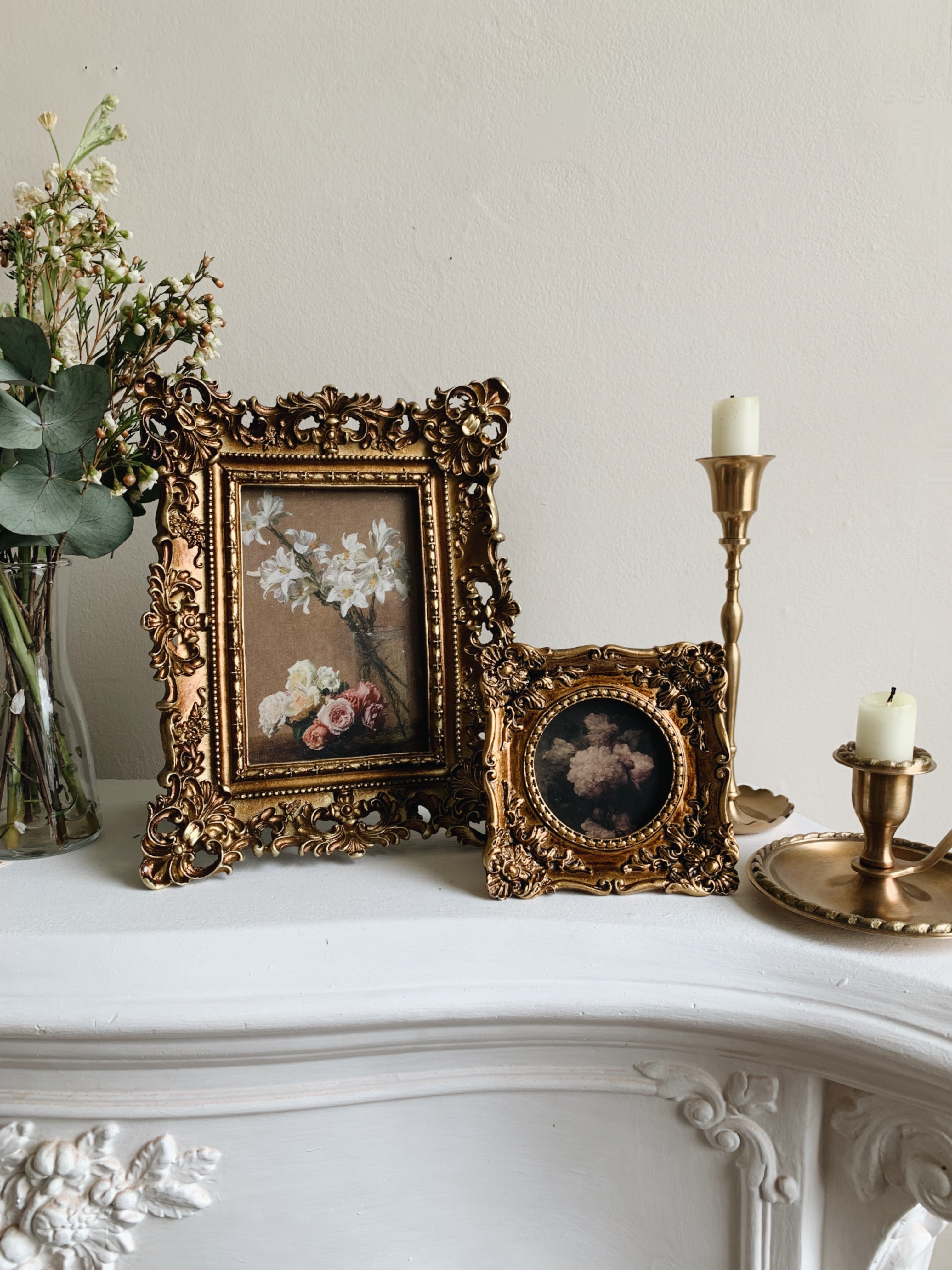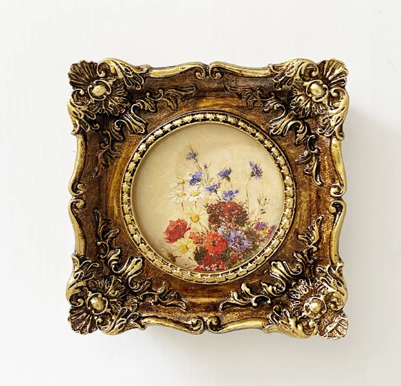 A sweet petite vintage style frame to house your most treasured memories or display your favorite vintage art print. Can be displayed on a mantlepiece or hung on the wall.