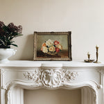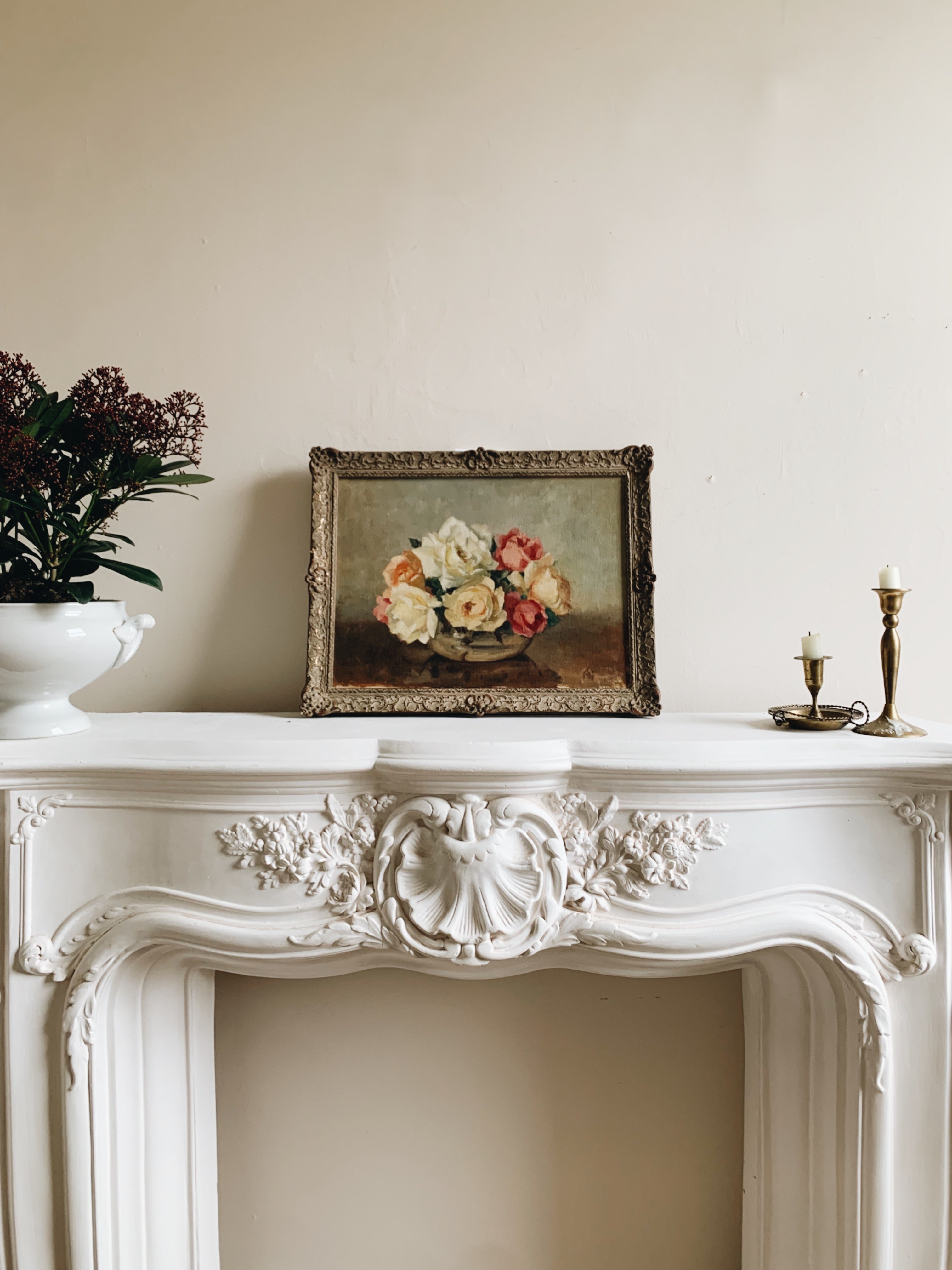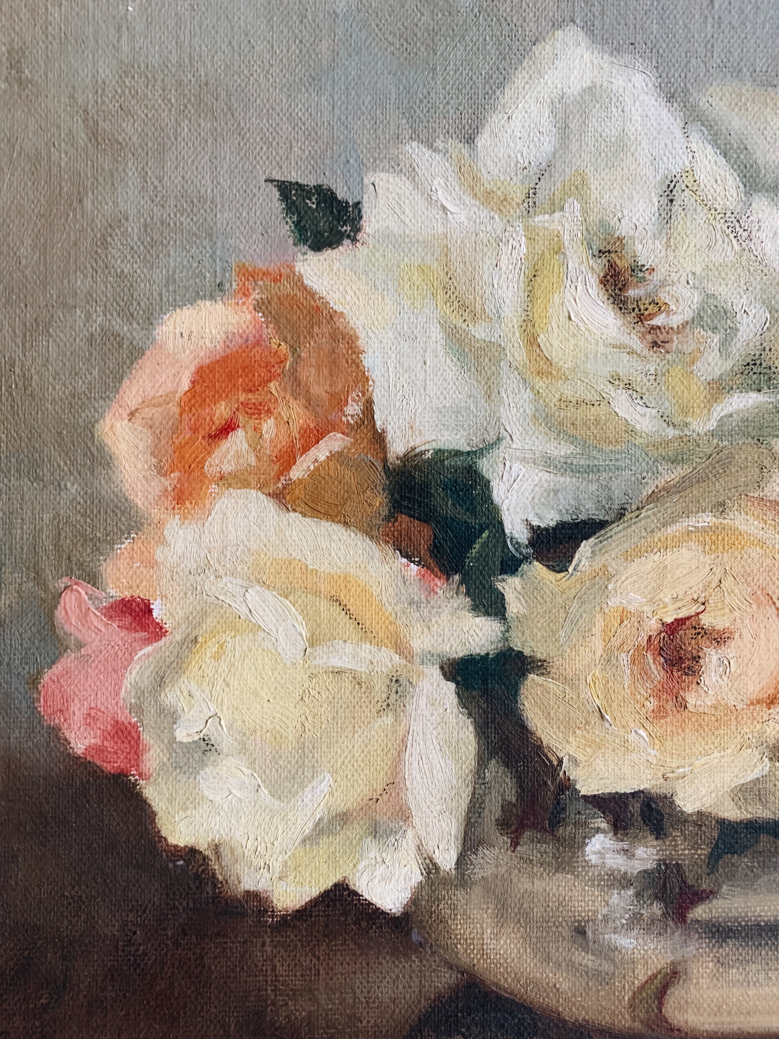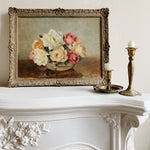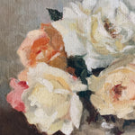 A sweet floral vintage oil painting in a stunning delicate faded gold gilt frame. The painting depicts a bowl of cream, peach and pink roses against a warm neutral background. The frame has a lovely time worn feel but is in lovely condition, for just the right amount of faded glamour.